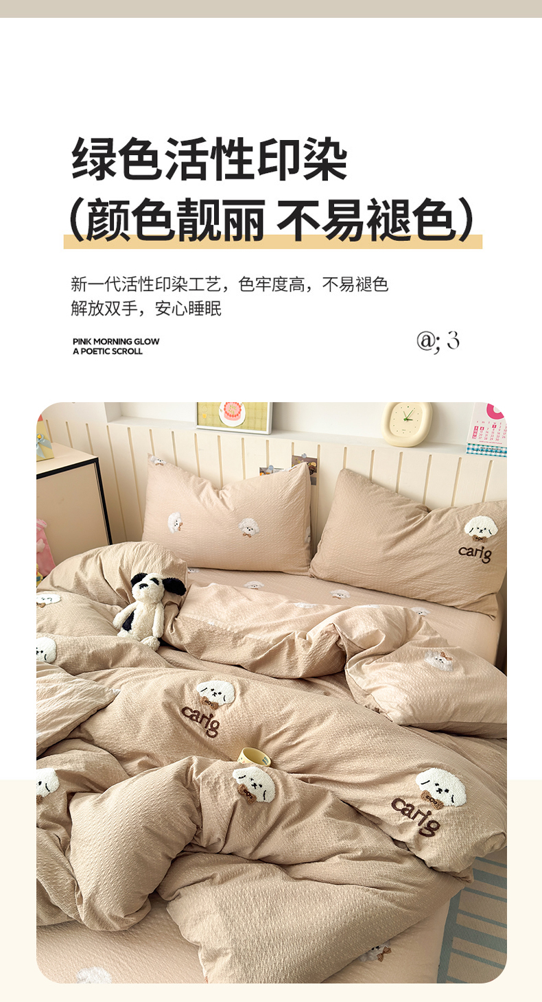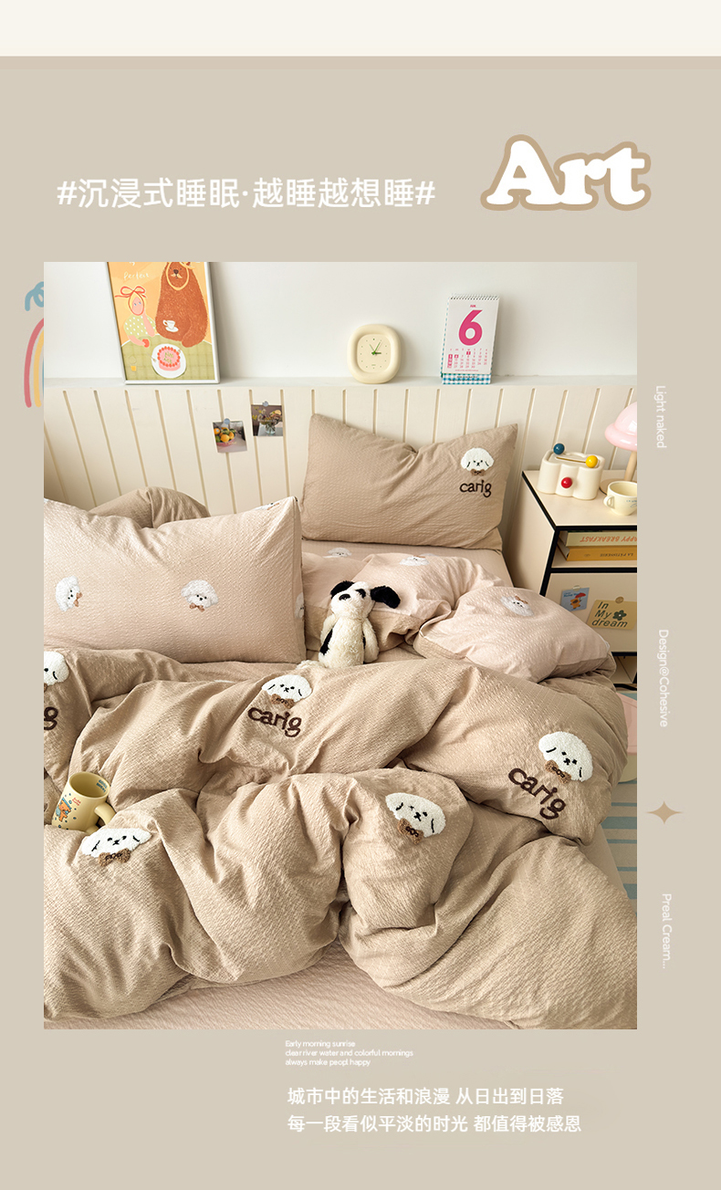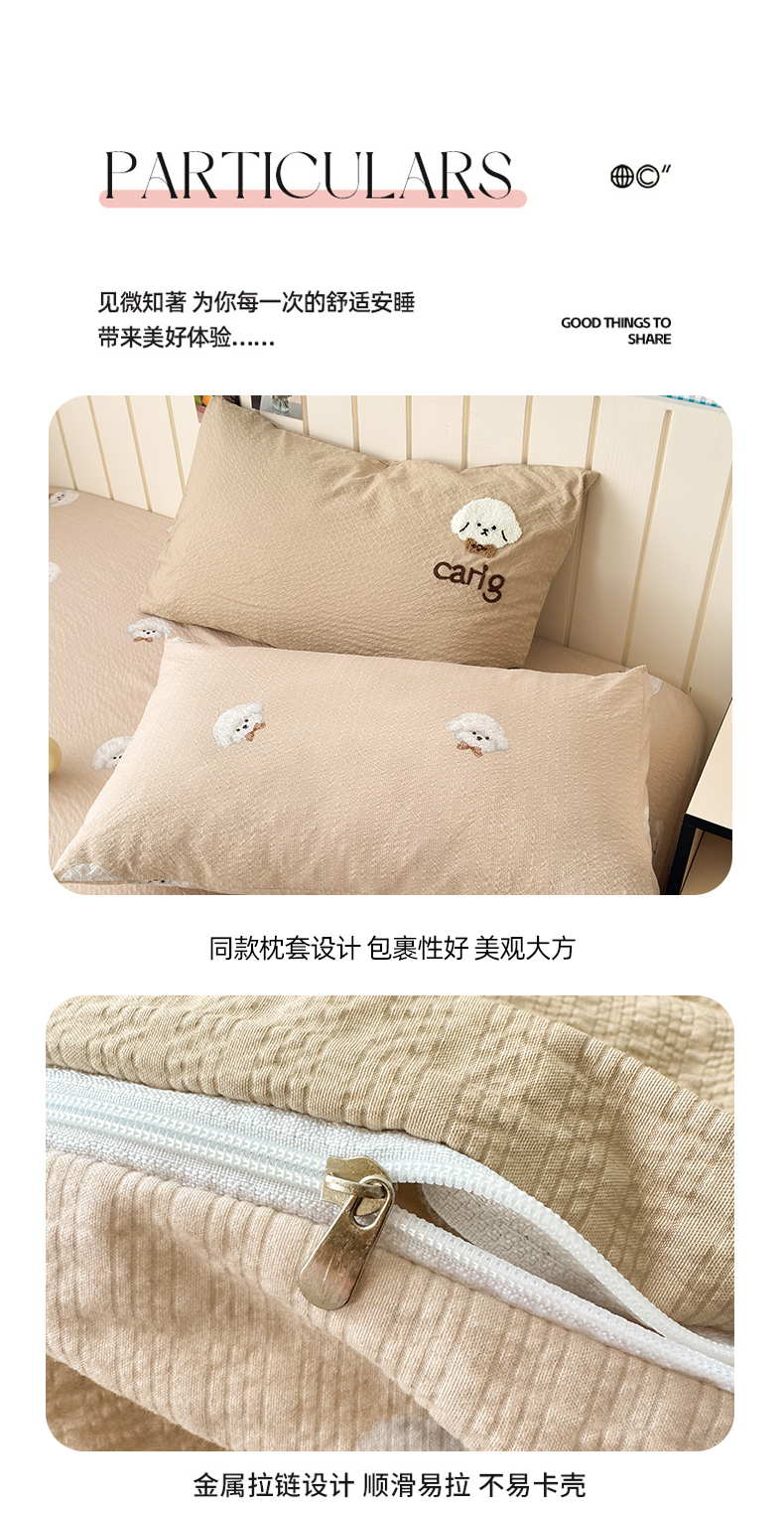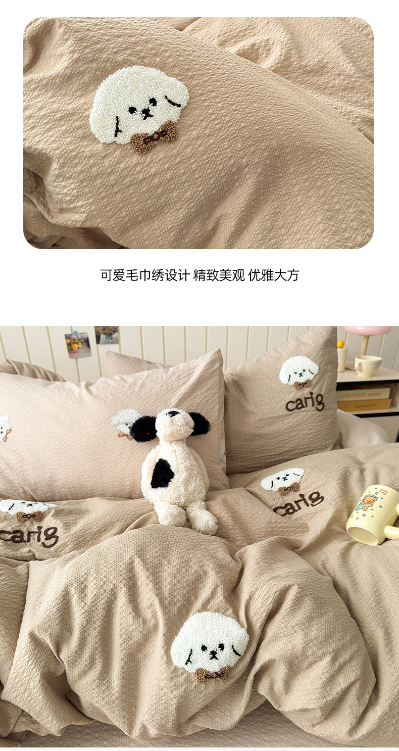 当前位置: 91家纺网 > 商品网购 > 床品套件 > 四件套 > 毛巾绣四件套 > 橙意 2026新款高克重A类泡芙纱毛巾绣四件套 萌萌小狗-卡其