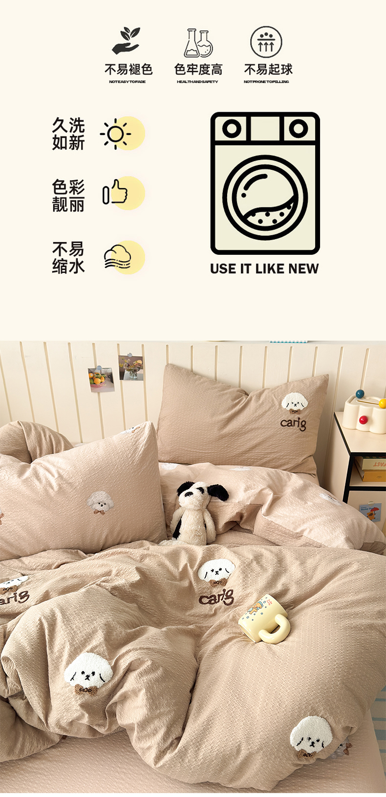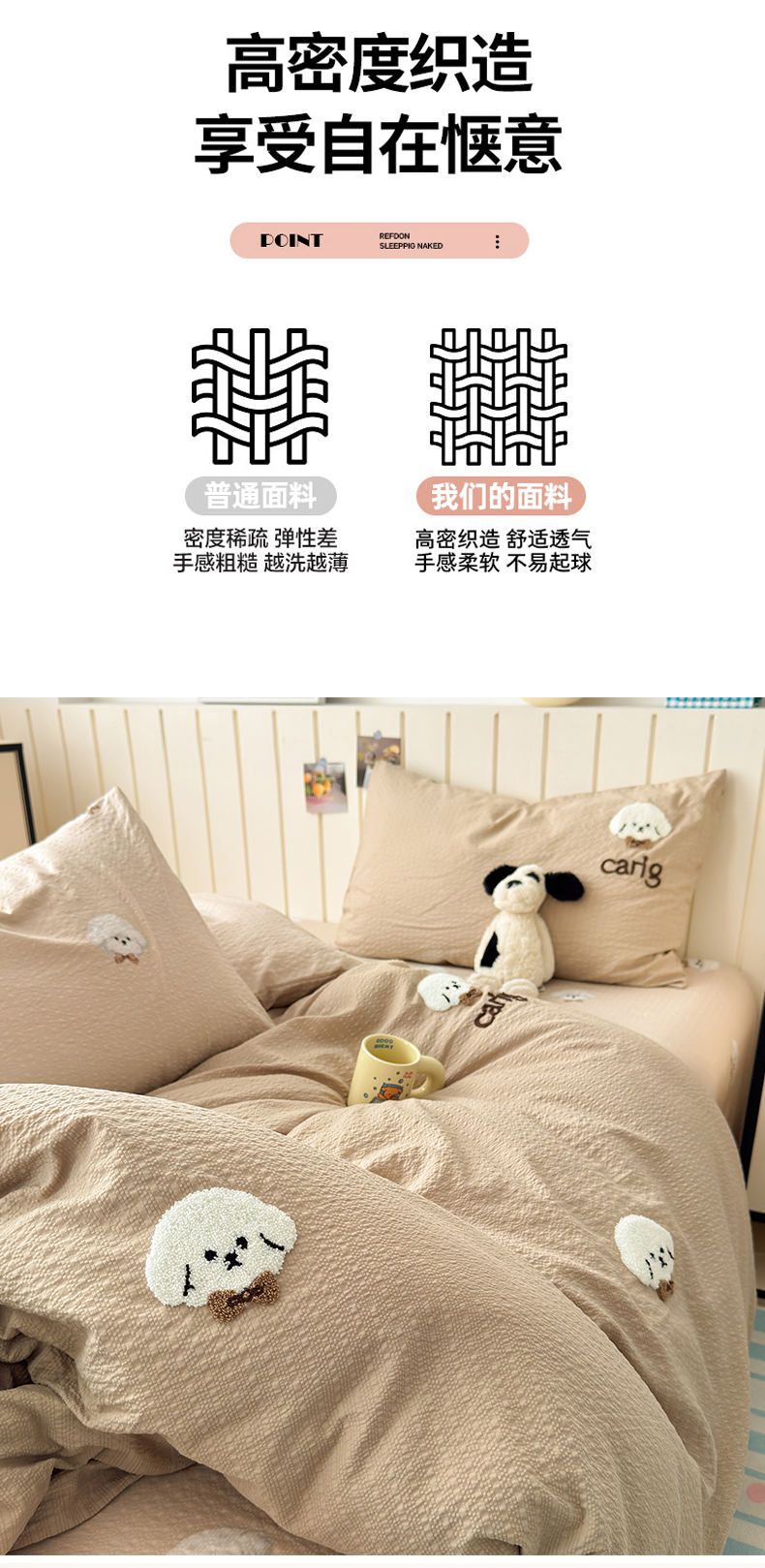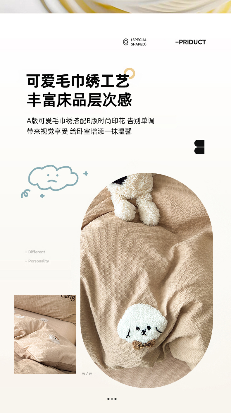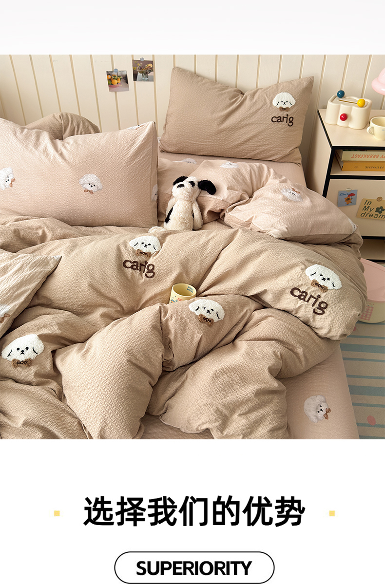 当前位置: 91家纺网 > 商品网购 > 床品套件 > 四件套 > 毛巾绣四件套 > 橙意 2026新款高克重A类泡芙纱毛巾绣四件套 萌萌小狗-卡其