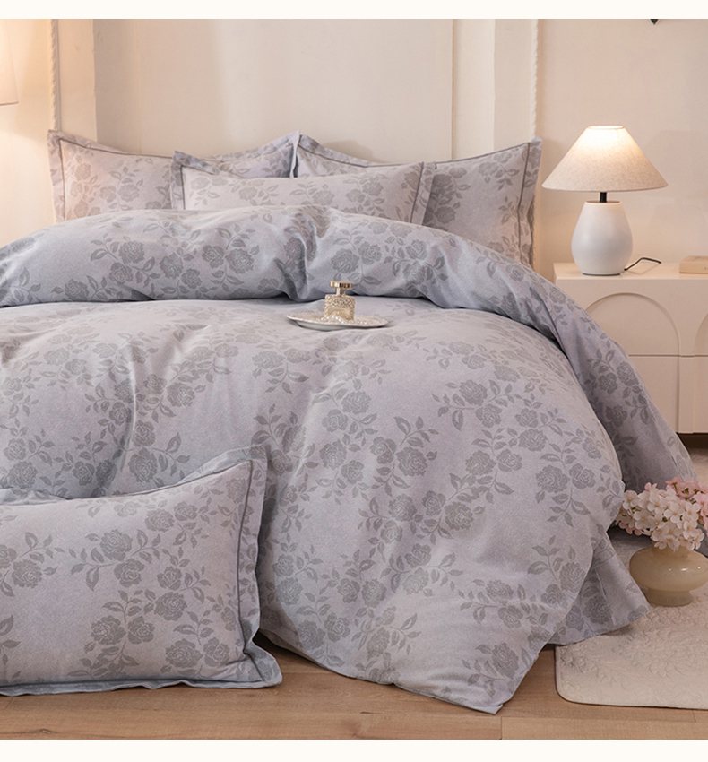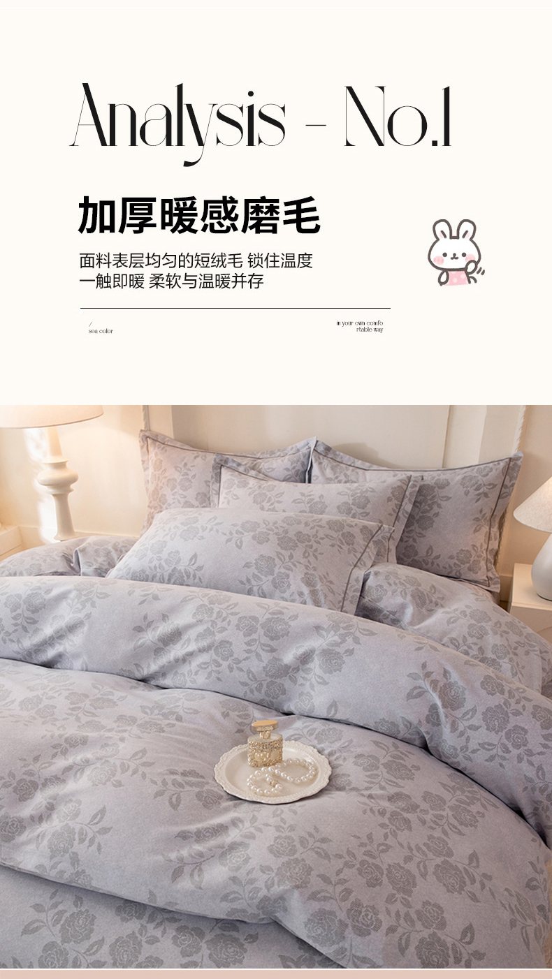 磨毛世家家纺 2026新款铂金磨毛纯棉加厚全棉磨毛四件套 玫瑰之心-灰
