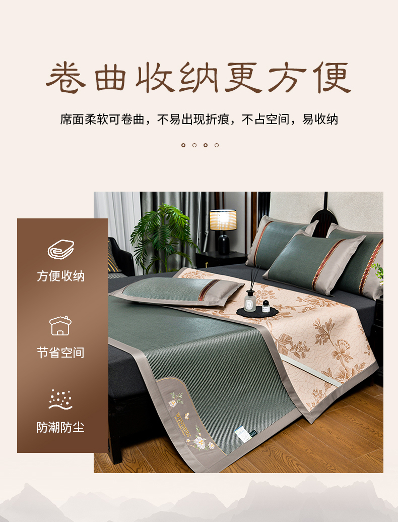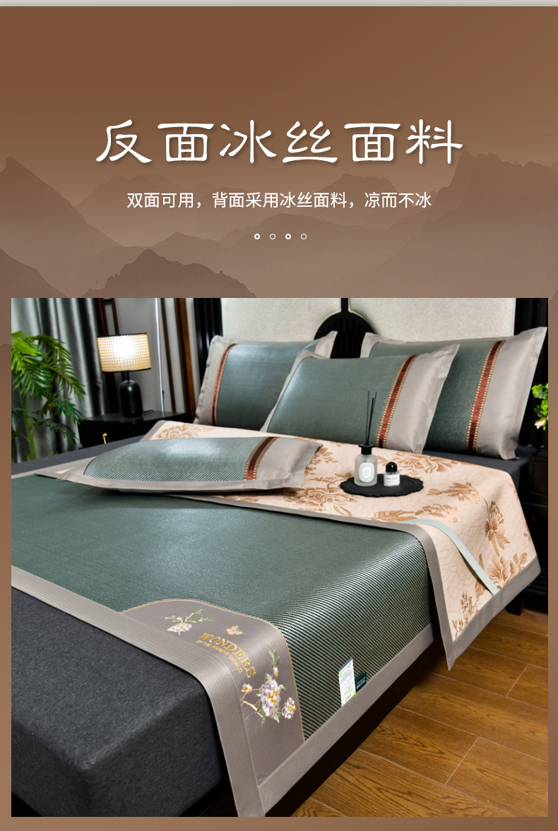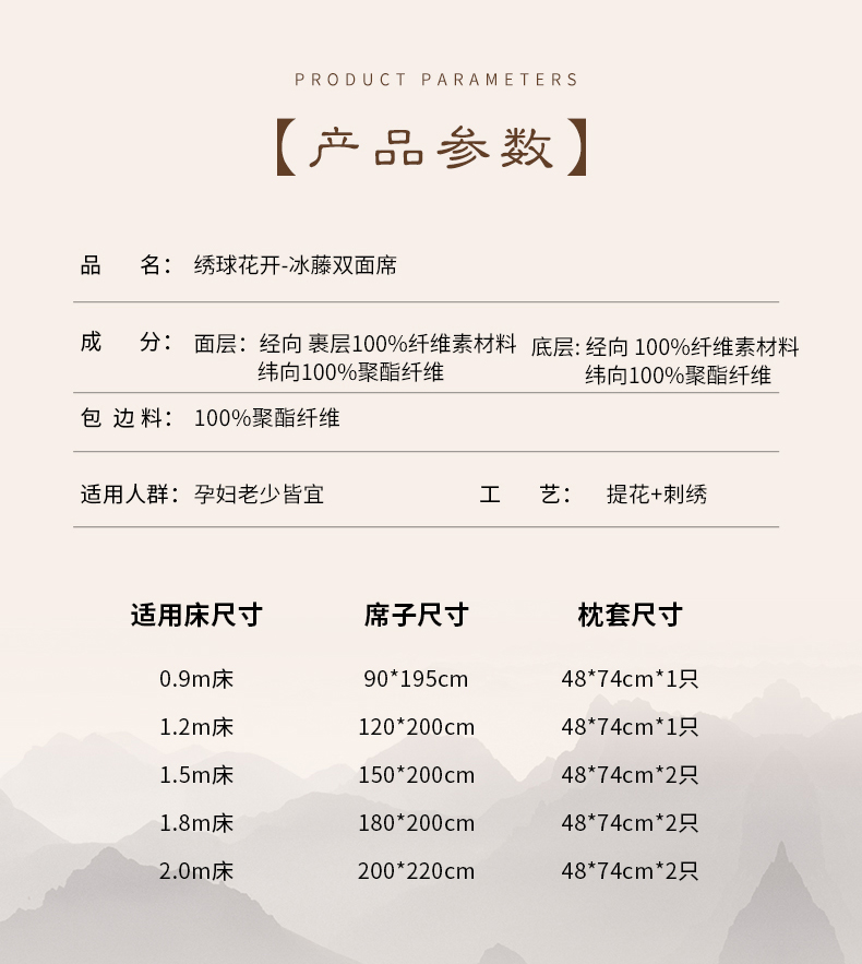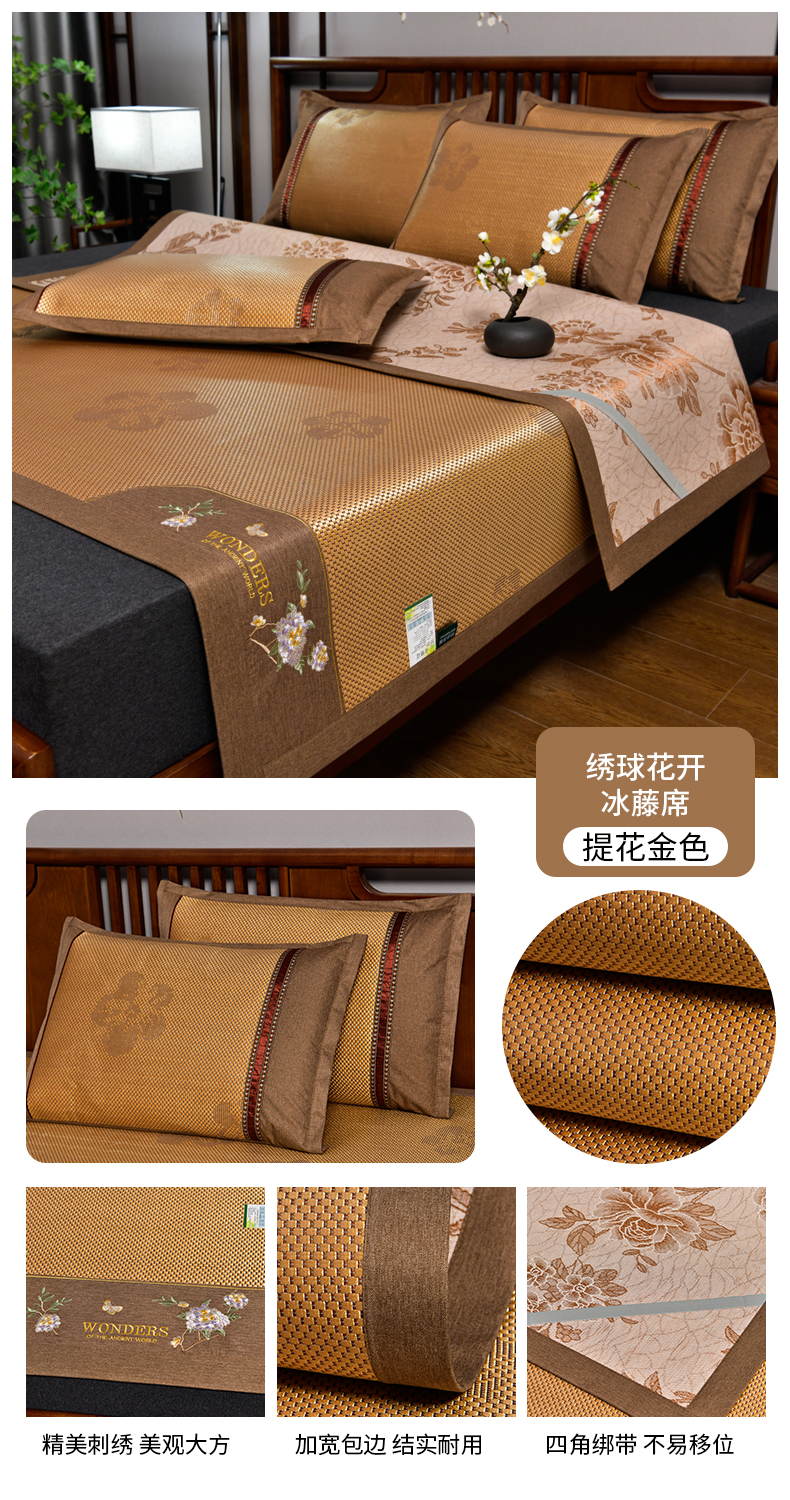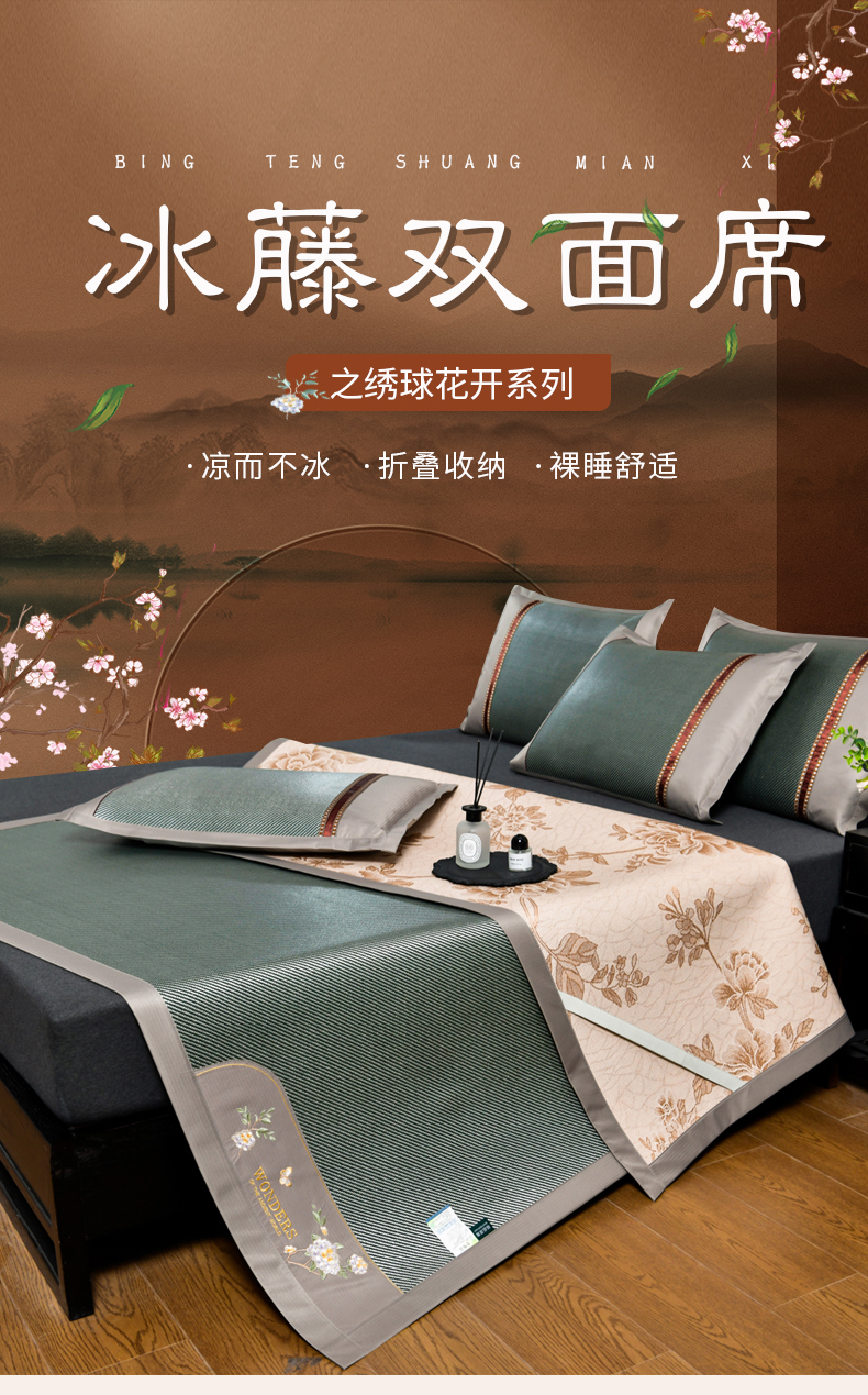 商品名称:小牛席业 2026新款绣球花开-冰藤双面席凉席藤席冰藤席竹席空调席草席冰丝席豆豆席乳胶席三件套 绣球花开-冰藤墨绿