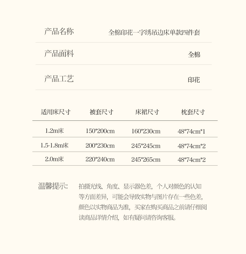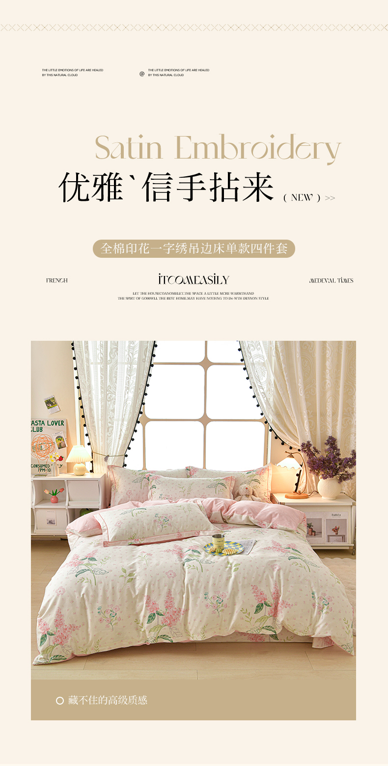 商品名称:绘萱家居 2026直播爆款一字绣吊边款纯棉100%全棉四件套印花百分百(喷气高品质) 浪漫花香