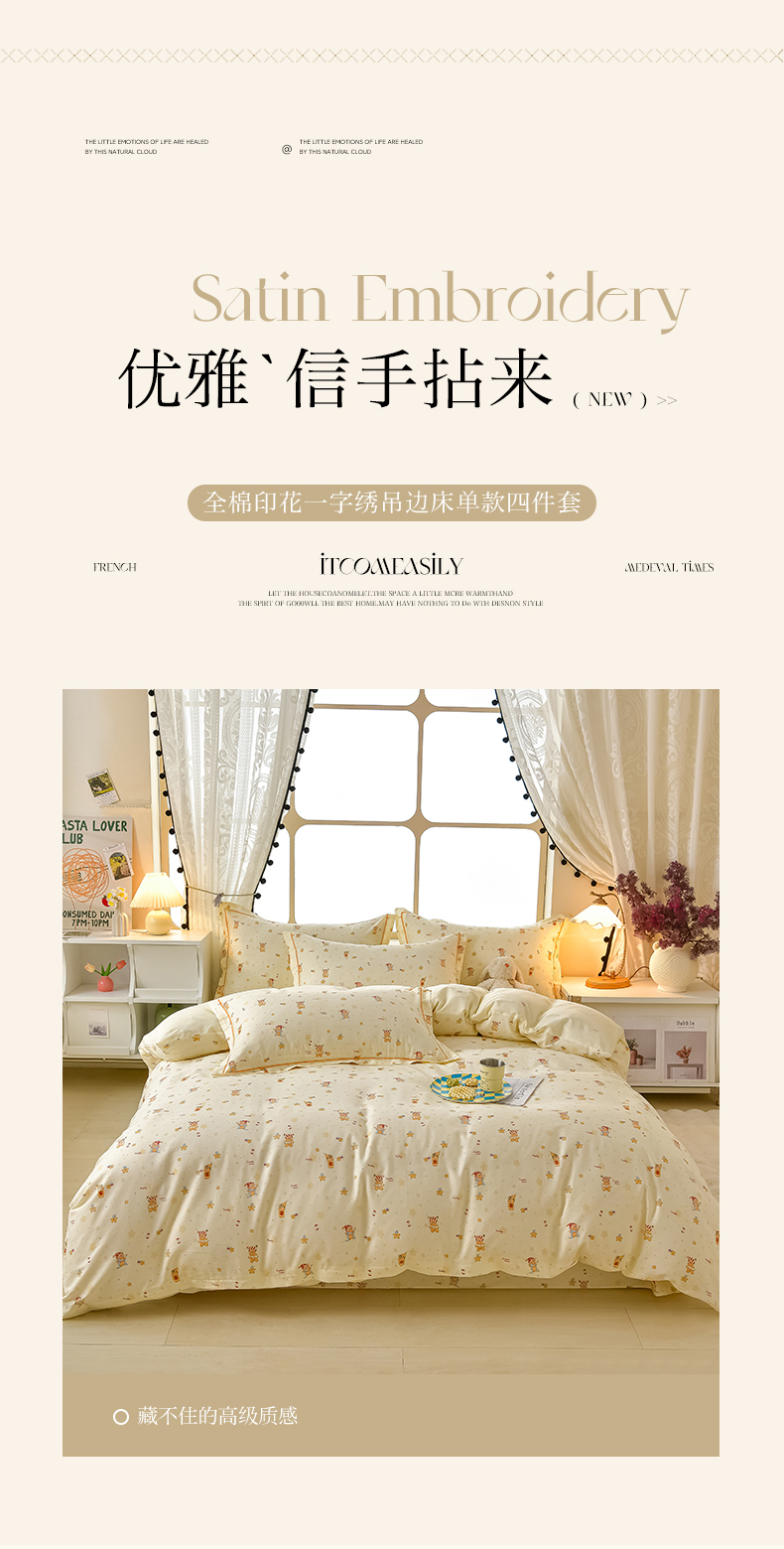 商品名称:绘萱家居 2026直播爆款一字绣吊边款纯棉100%全棉四件套印花百分百(喷气高品质) 小町的家
