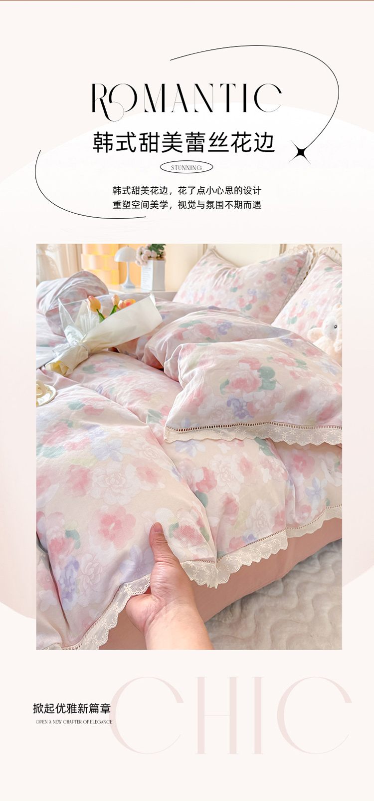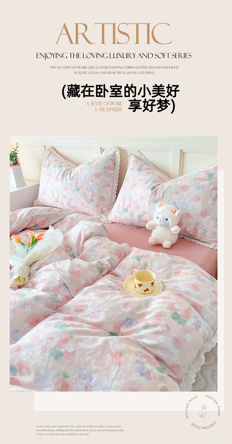 商品名称:【疆东】2026韩版蕾丝花边纯棉全棉双层纱四件套印花纯棉四件套法式赫本木耳花边全棉公主双层纱四件套