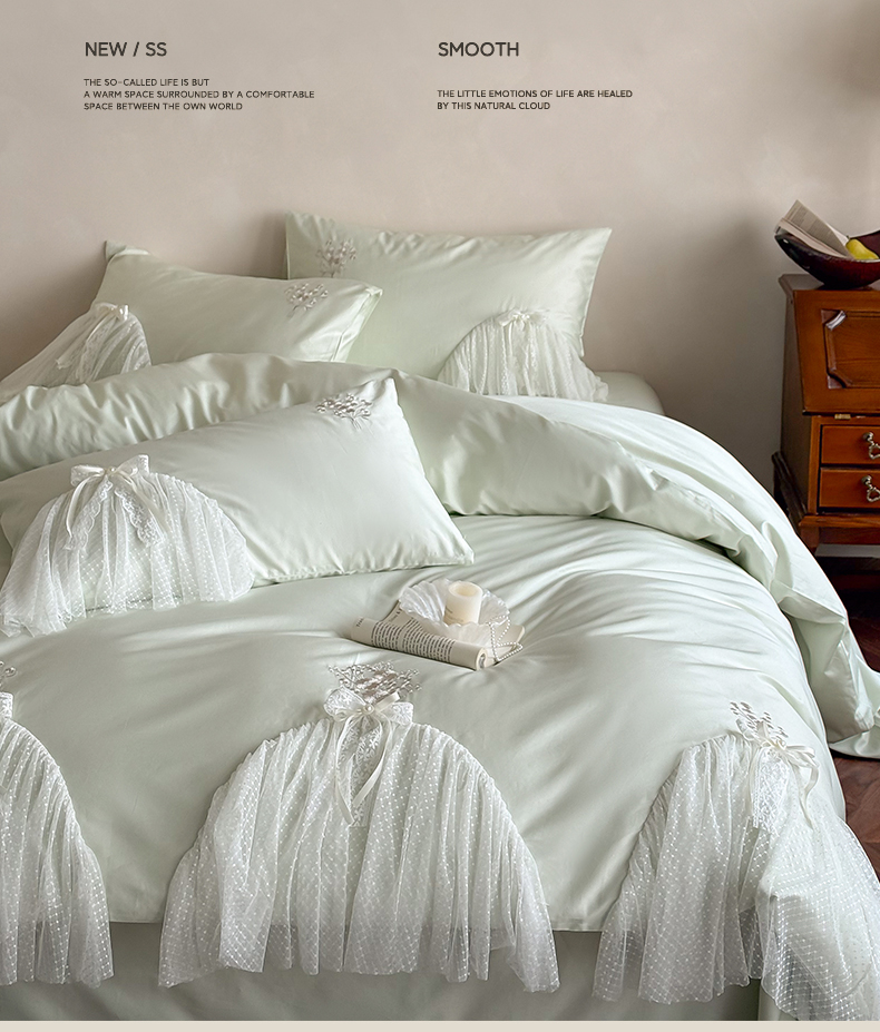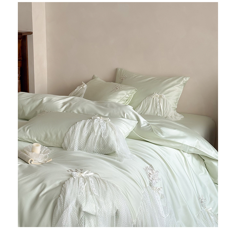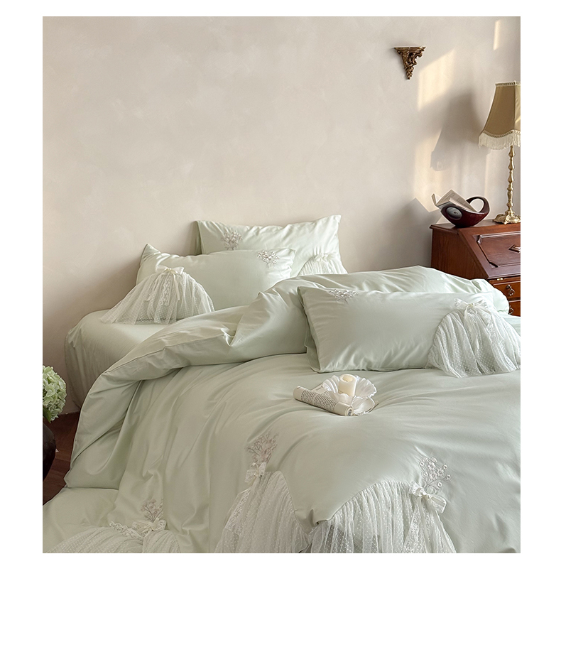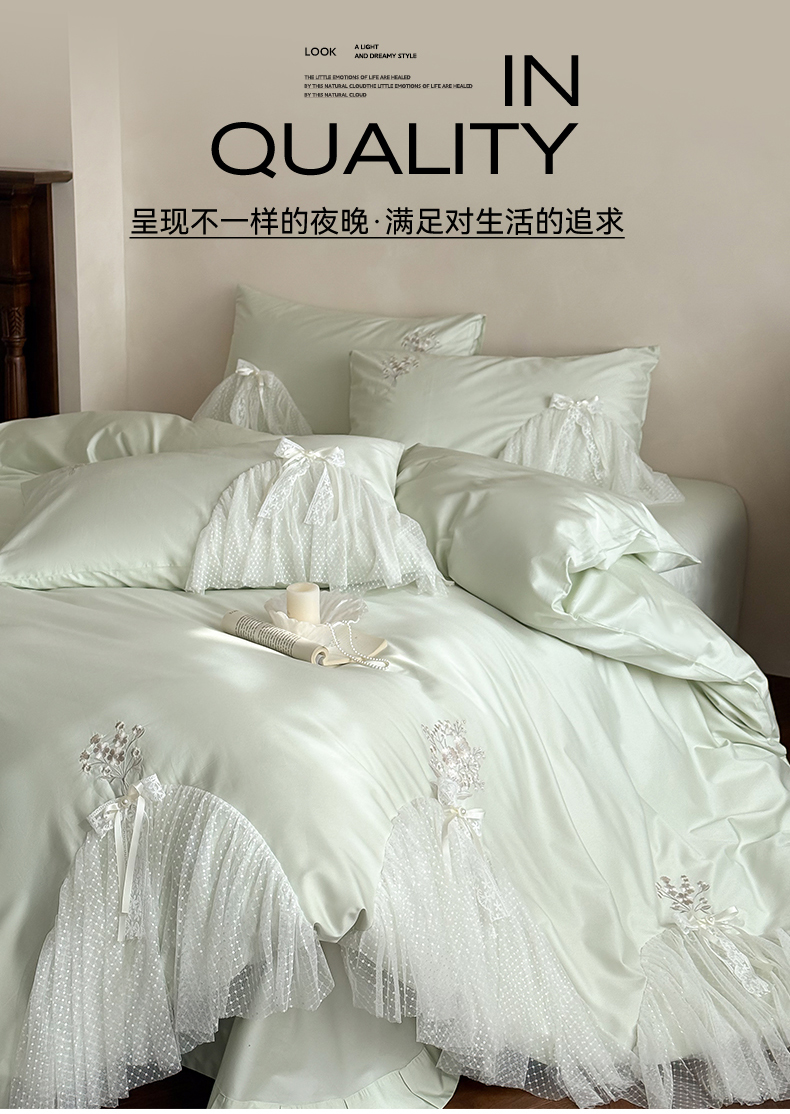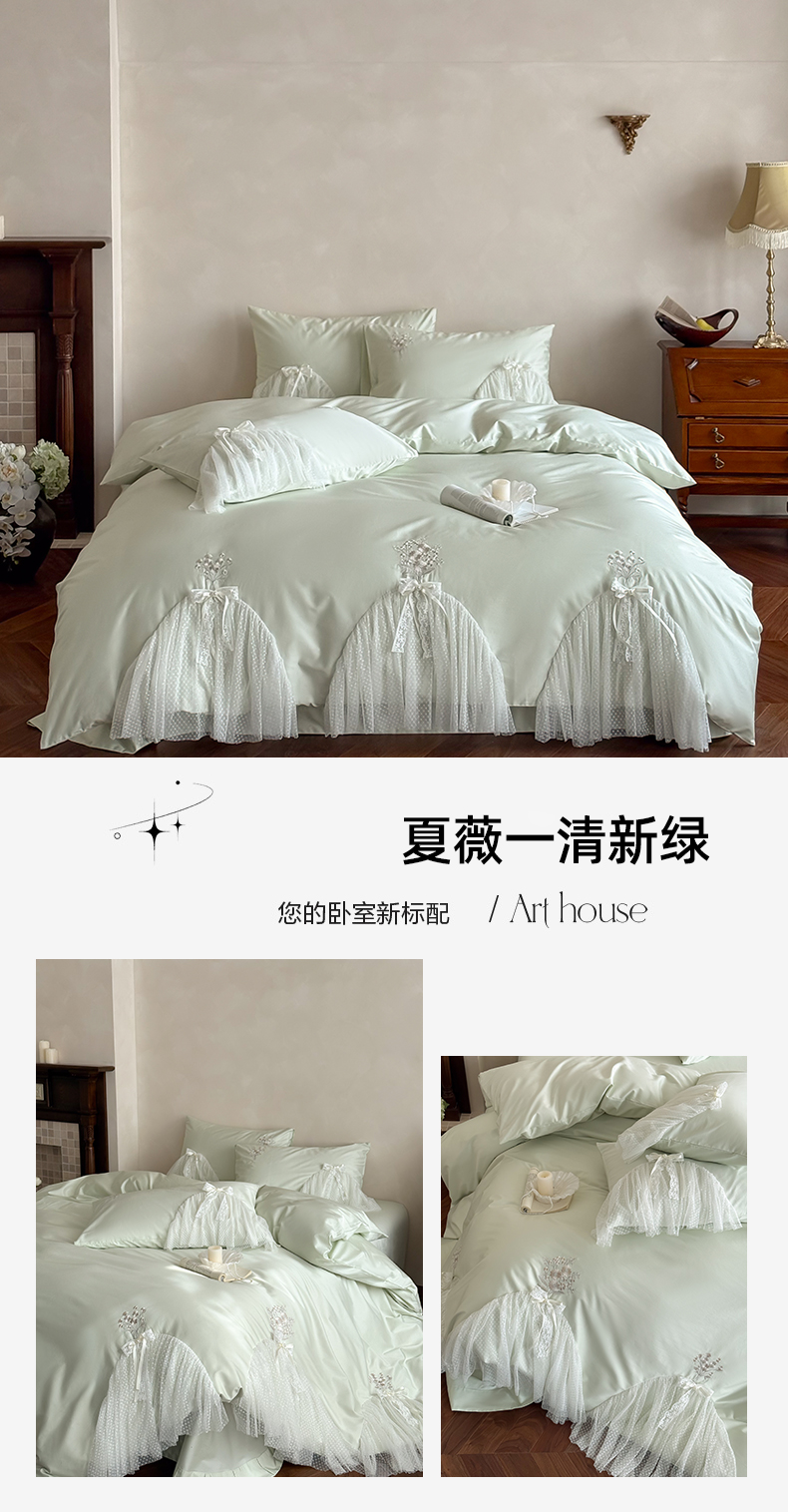 名品优仓 2026新款长绒棉50s全棉纯棉刺绣蕾丝轻纱四件套-夏薇 夏薇-清新绿