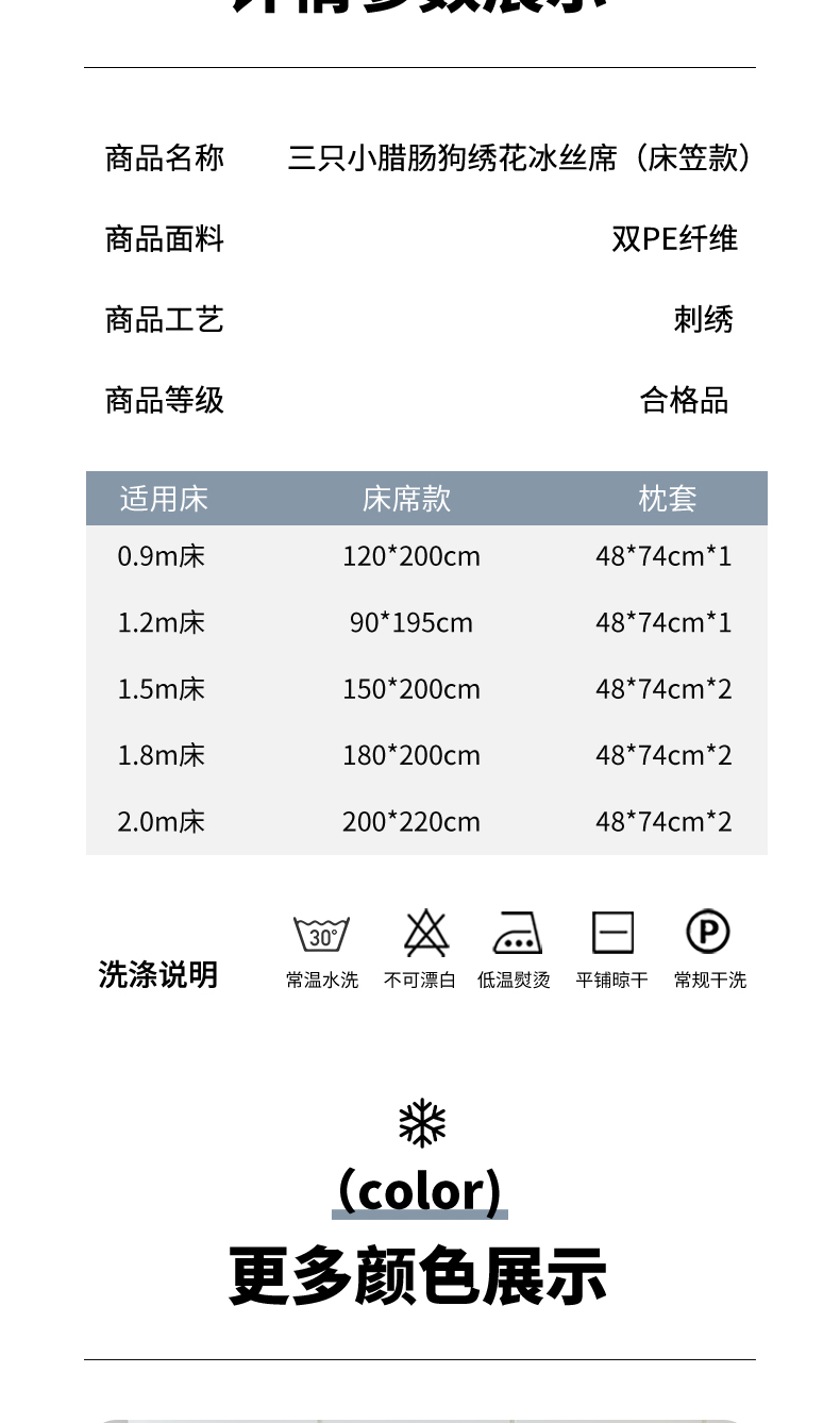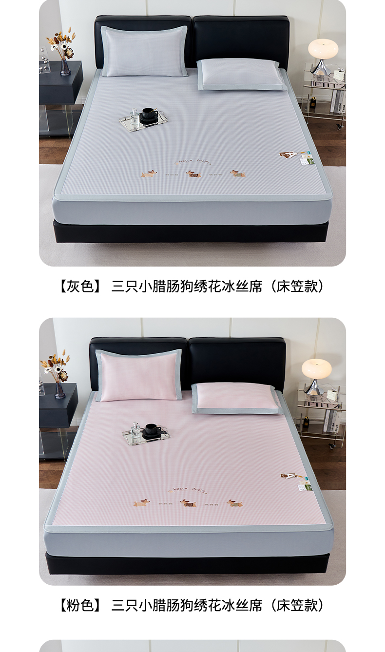 商品名称:小牛席业 2026新款腊肠狗绣花凉感冰丝席凉席席子-床笠款 腊肠狗-蓝色
