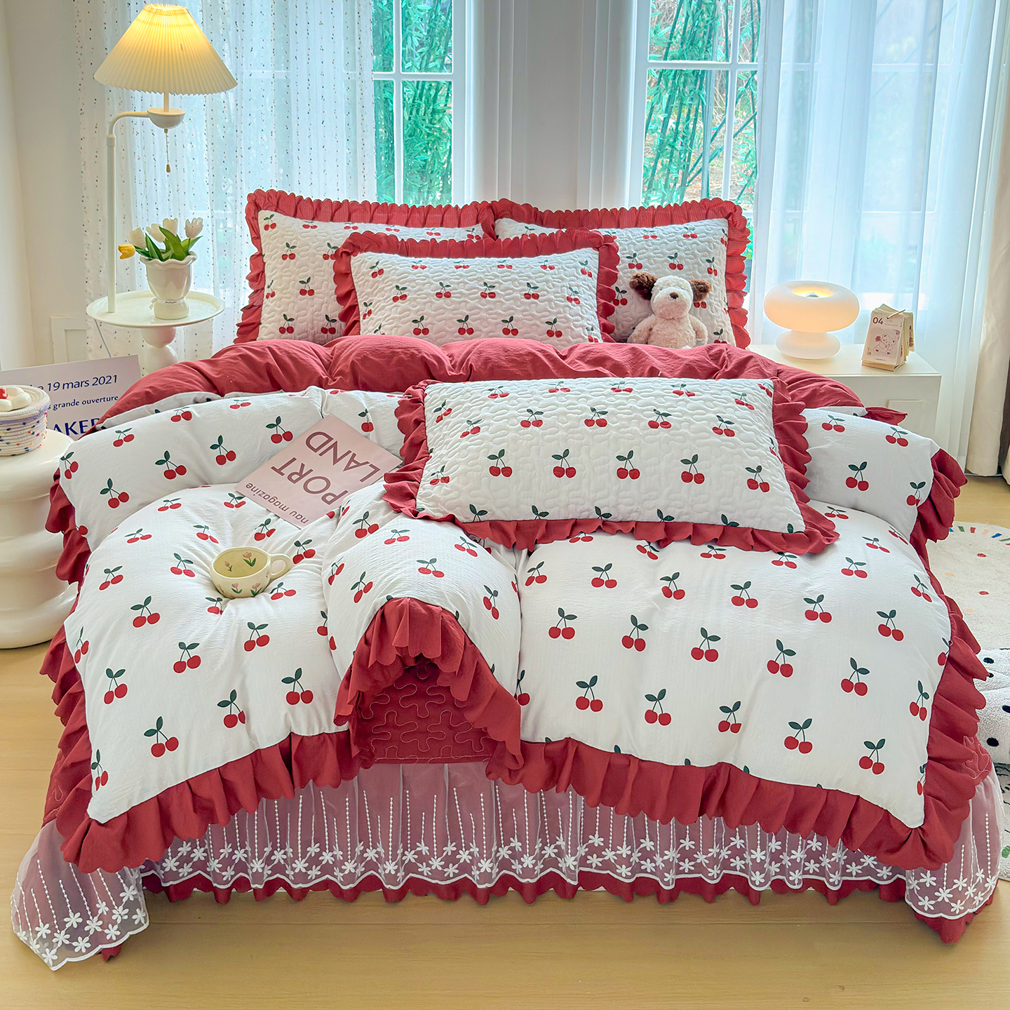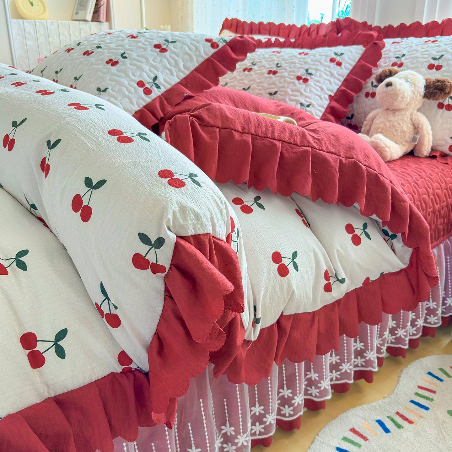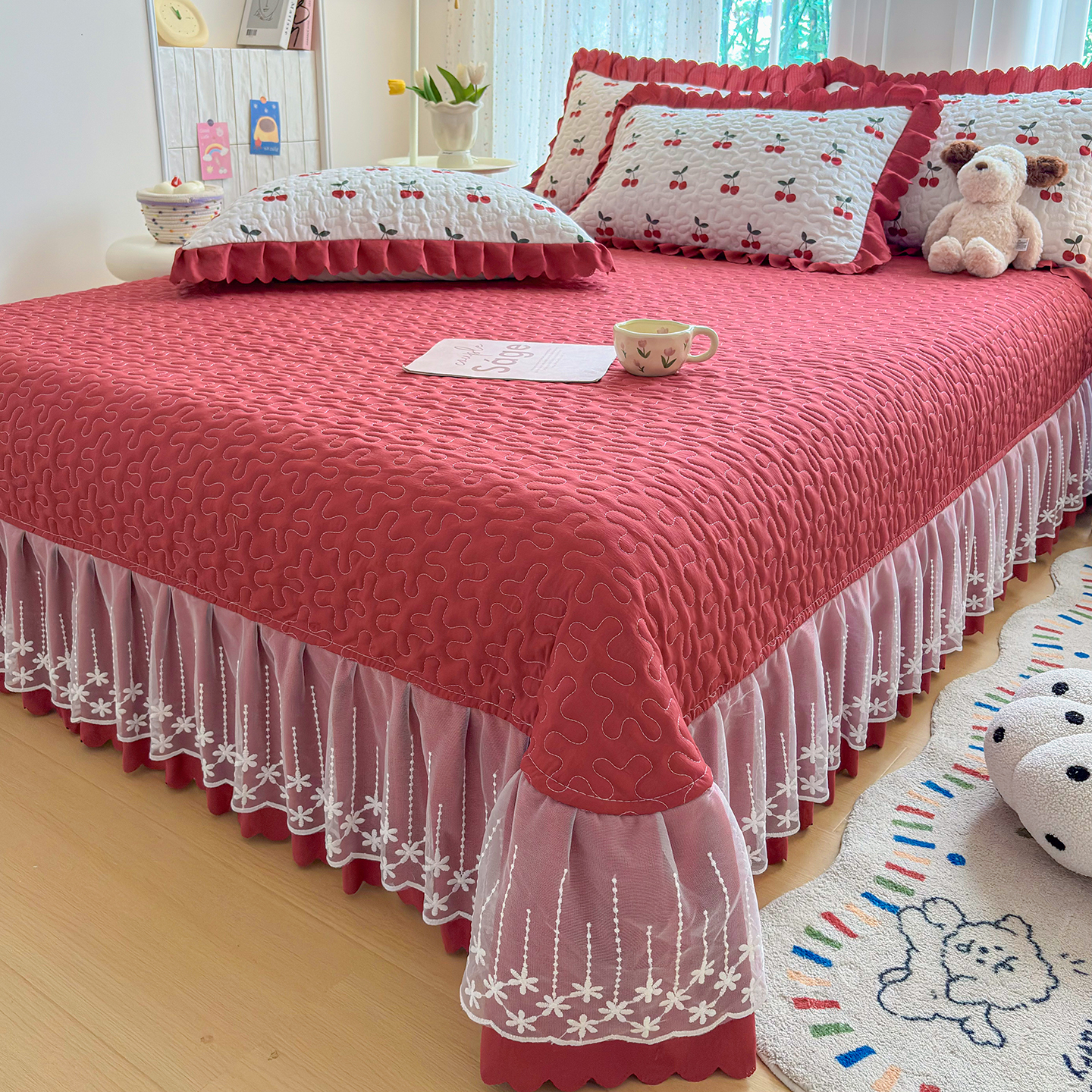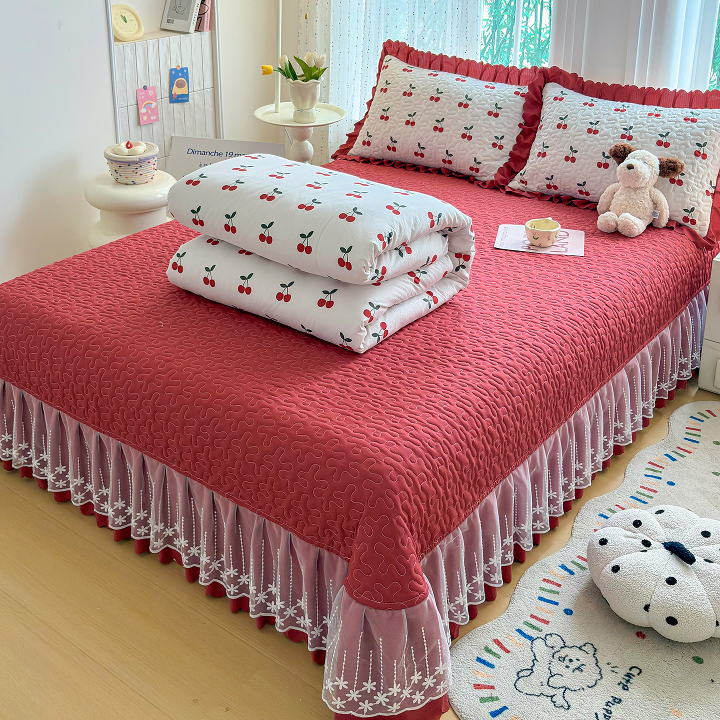 当前位置: 91家纺网 > 商品网购 > 床品套件 > 四件套 > 其它四件套 > 绒耀家纺 2026春夏直播爆款泡芙棉云感双层纱皱皱纱韩式花边床盖四件套 初恋樱桃
