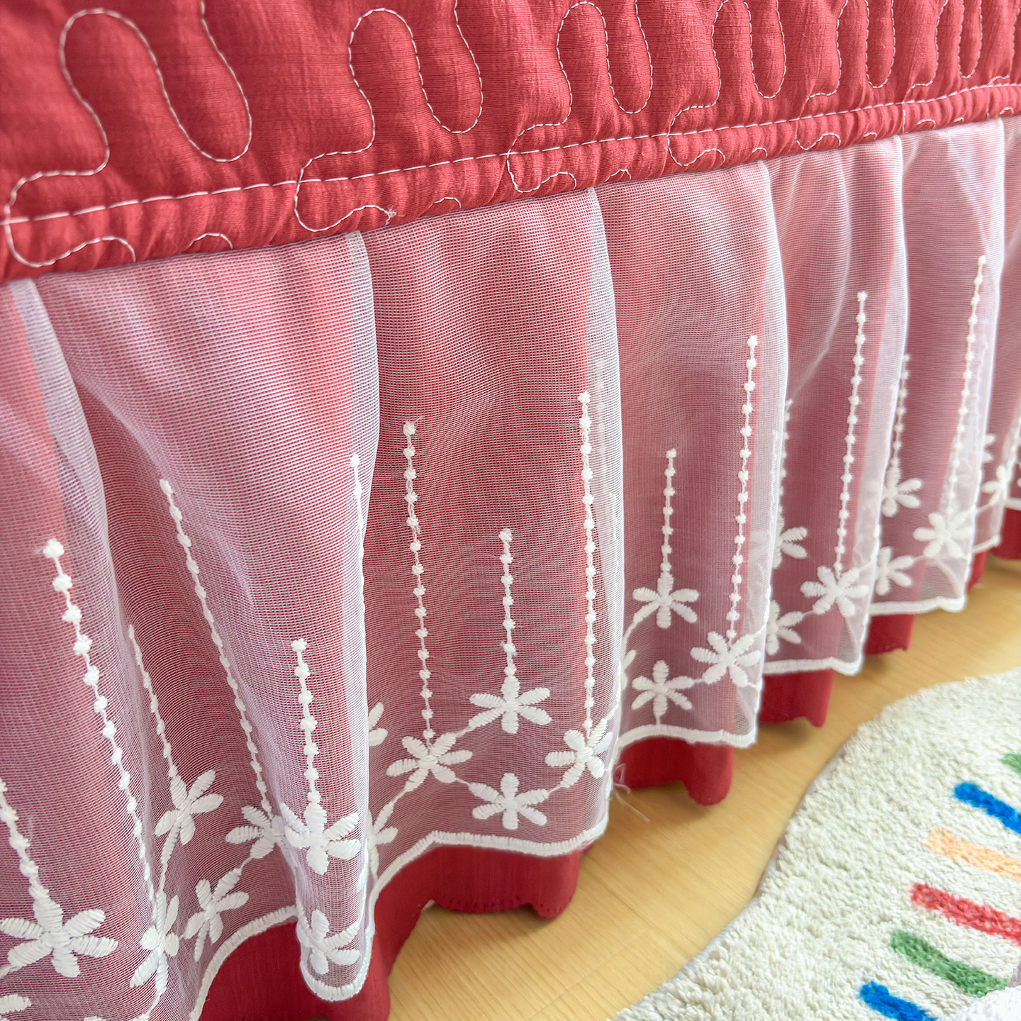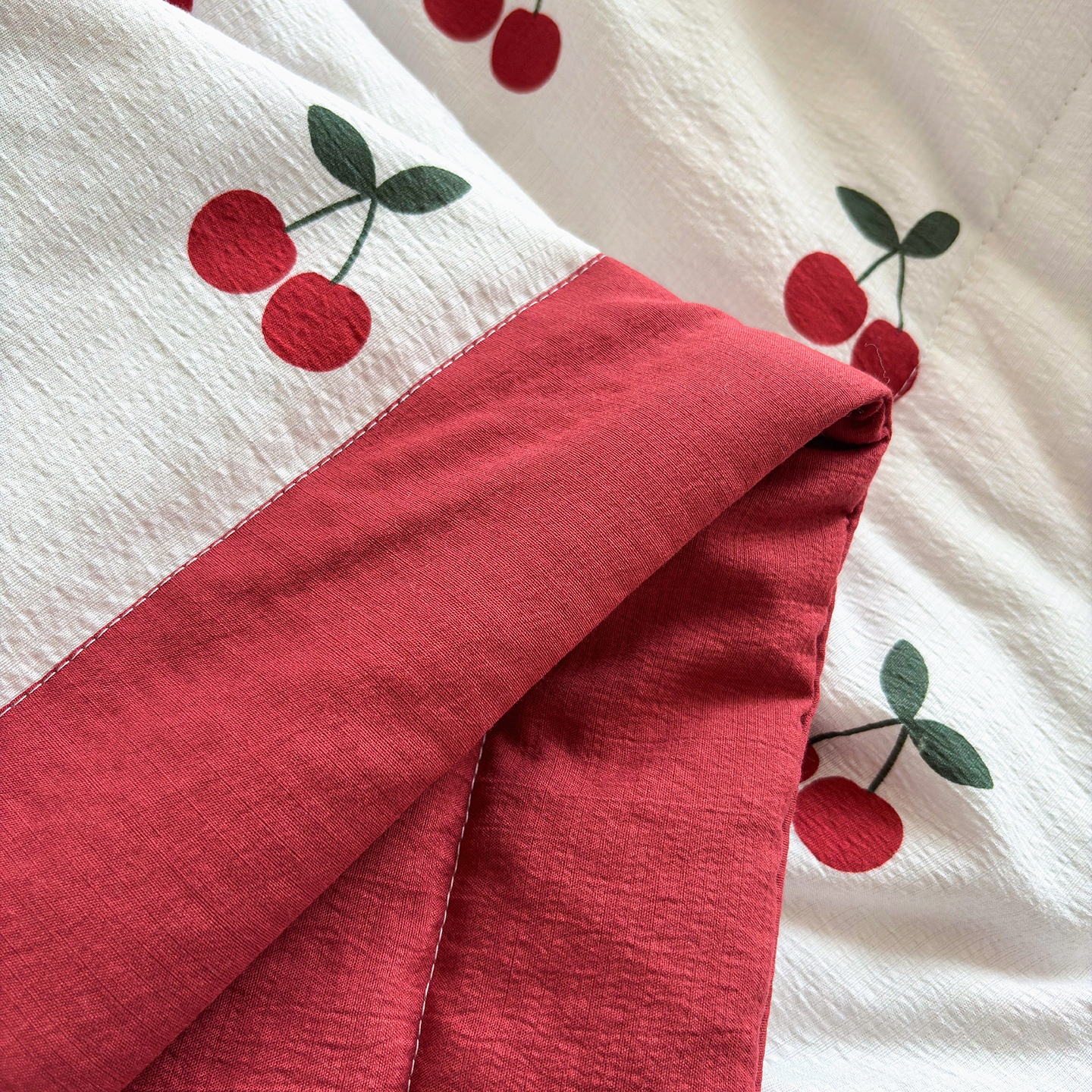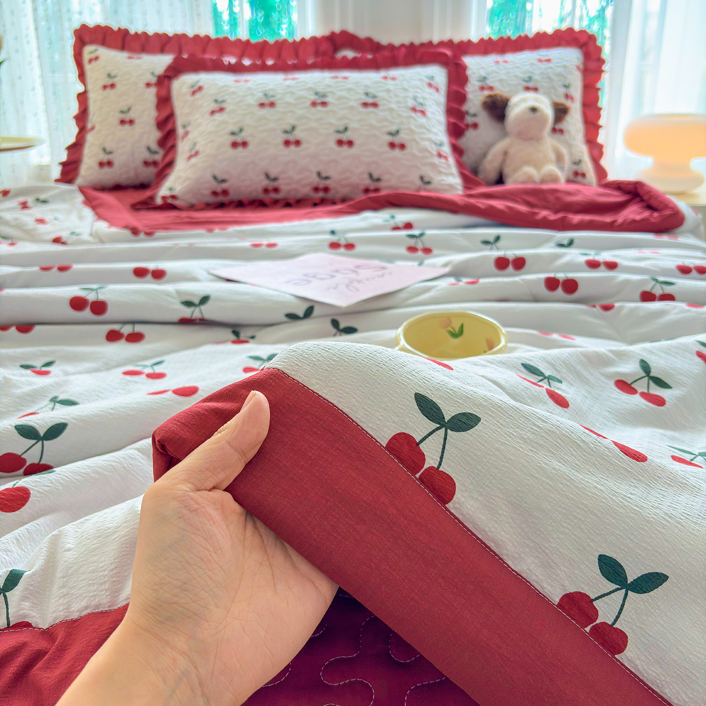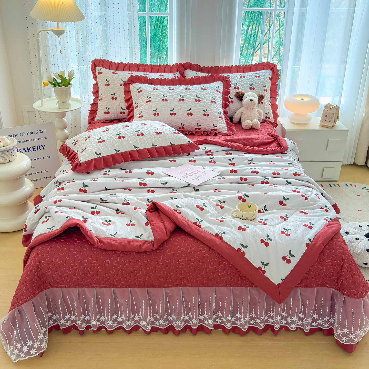 当前位置: 91家纺网 > 商品网购 > 床品套件 > 四件套 > 其它四件套 > 绒耀家纺 2026春夏直播爆款泡芙棉云感双层纱皱皱纱韩式花边床盖四件套 初恋樱桃