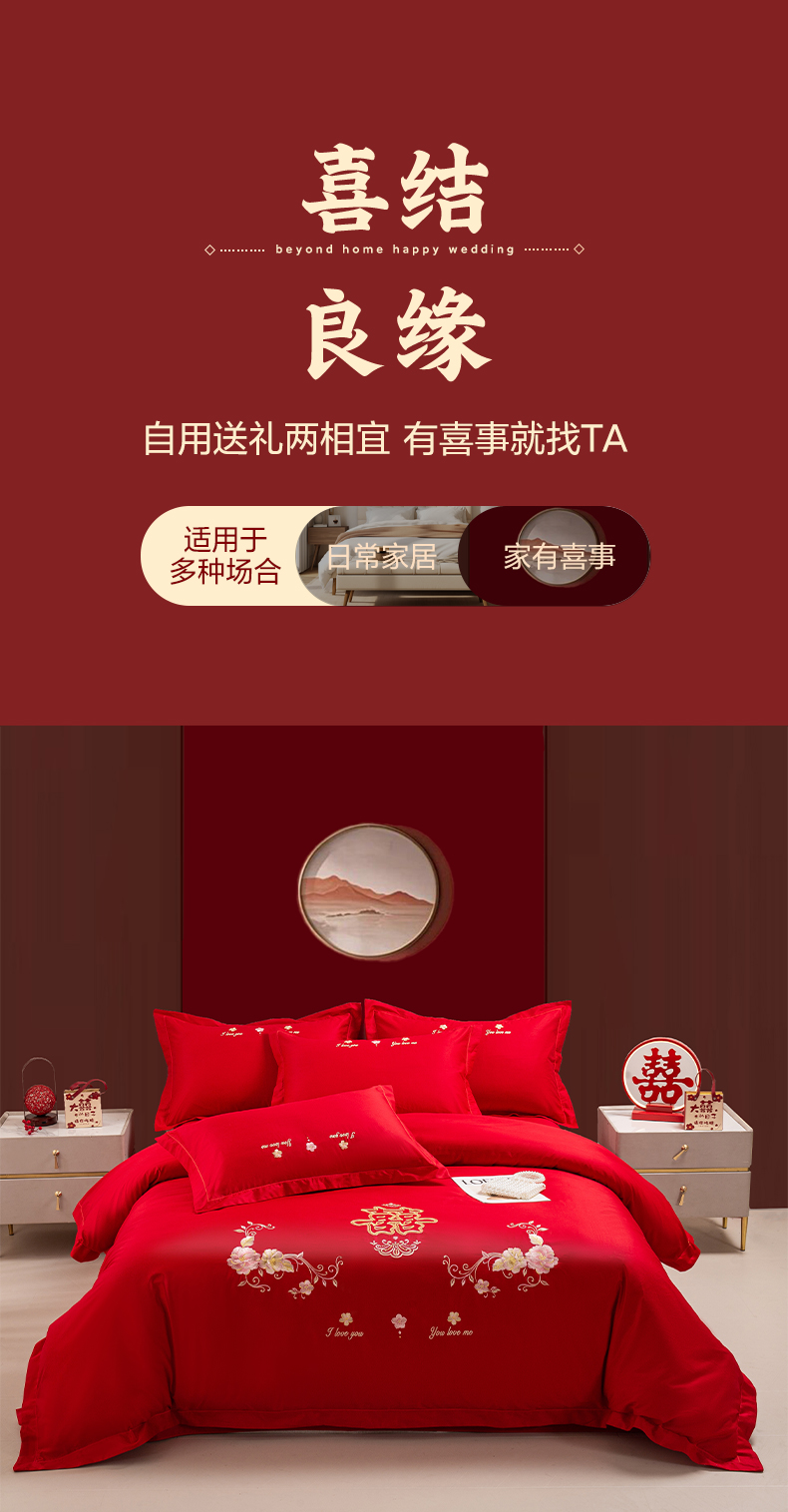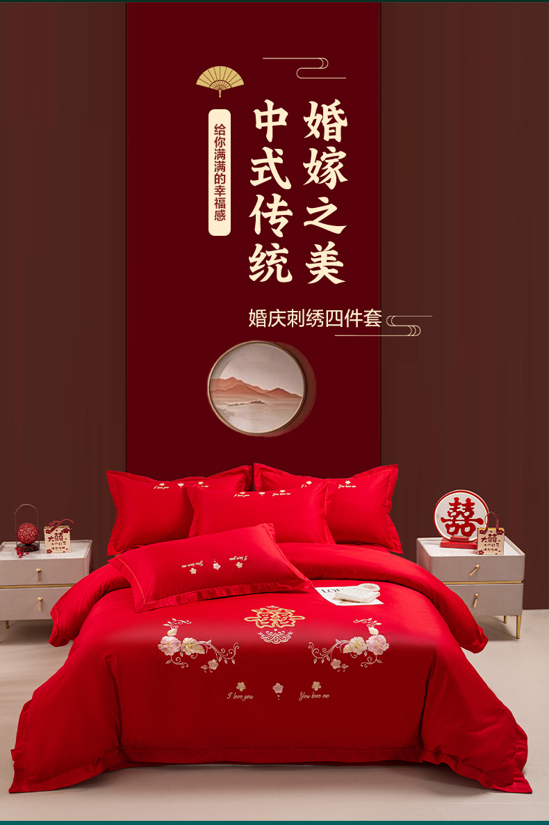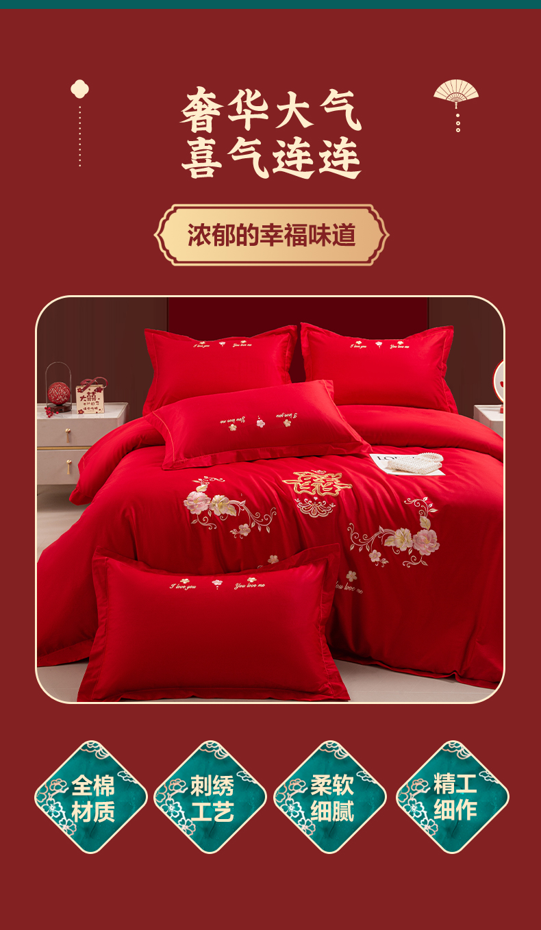 (总)银石 2024新款60新疆长绒棉大红婚庆绣花四件套,倾心一片,山河见证,心心相印,永结同心,浪漫时刻,吉祥如意,龙凤报喜