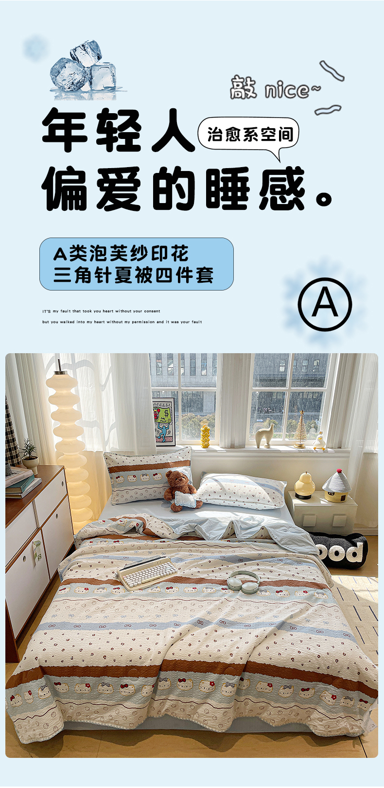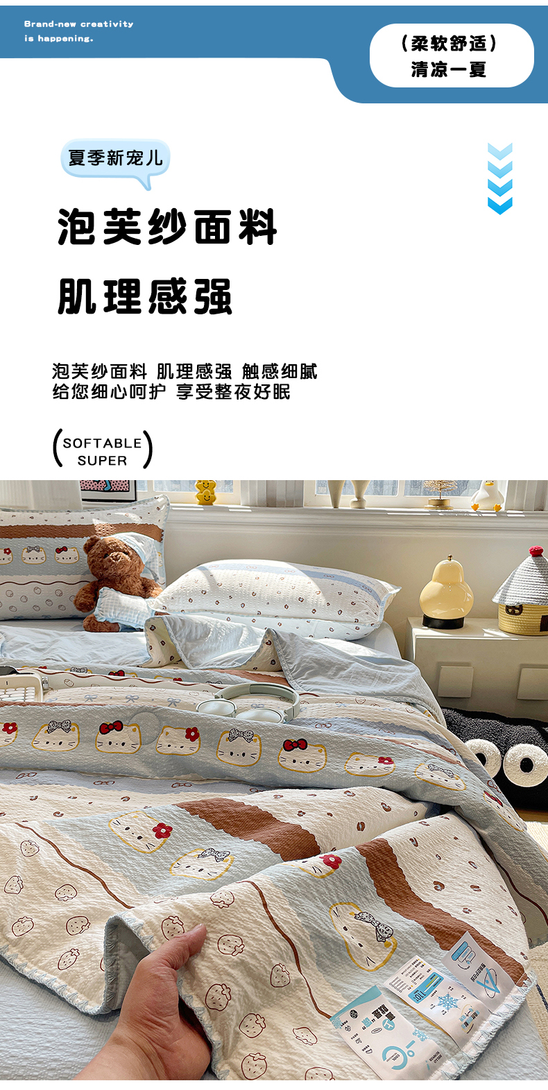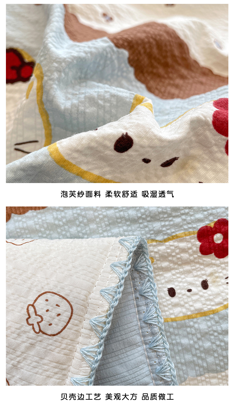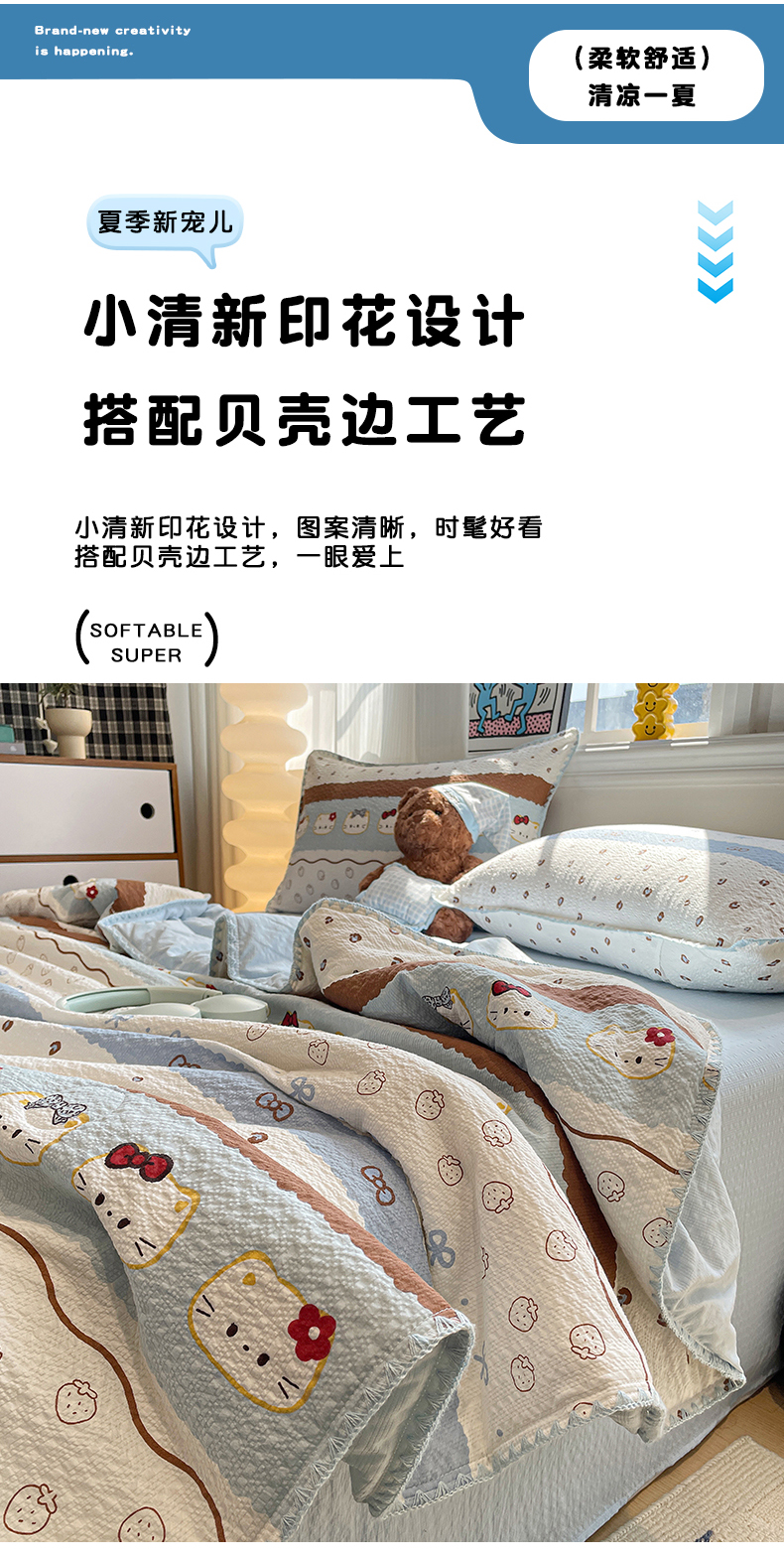 当前位置: 91家纺网 > 商品网购 > 床品套件 > 四件套 > 夏被四件套 > 奈颜 2026新款费尔岛云柔泡芙纱A类贝壳边夏被四件套-提供买家秀 可可小猫
