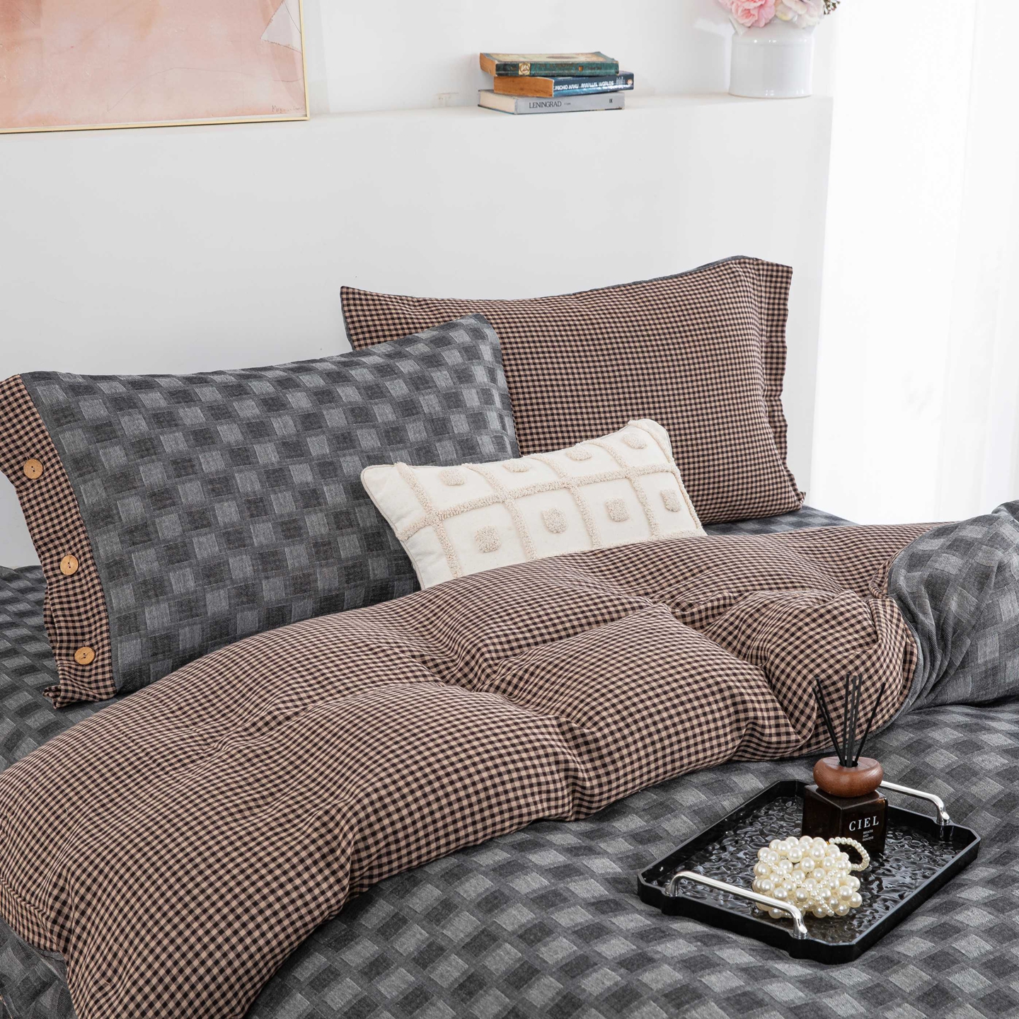 (总)仰望棉麻双层纱供应链 2026新款爱情马全棉色织提花双层纱纽扣款四件套,爱情马-棕