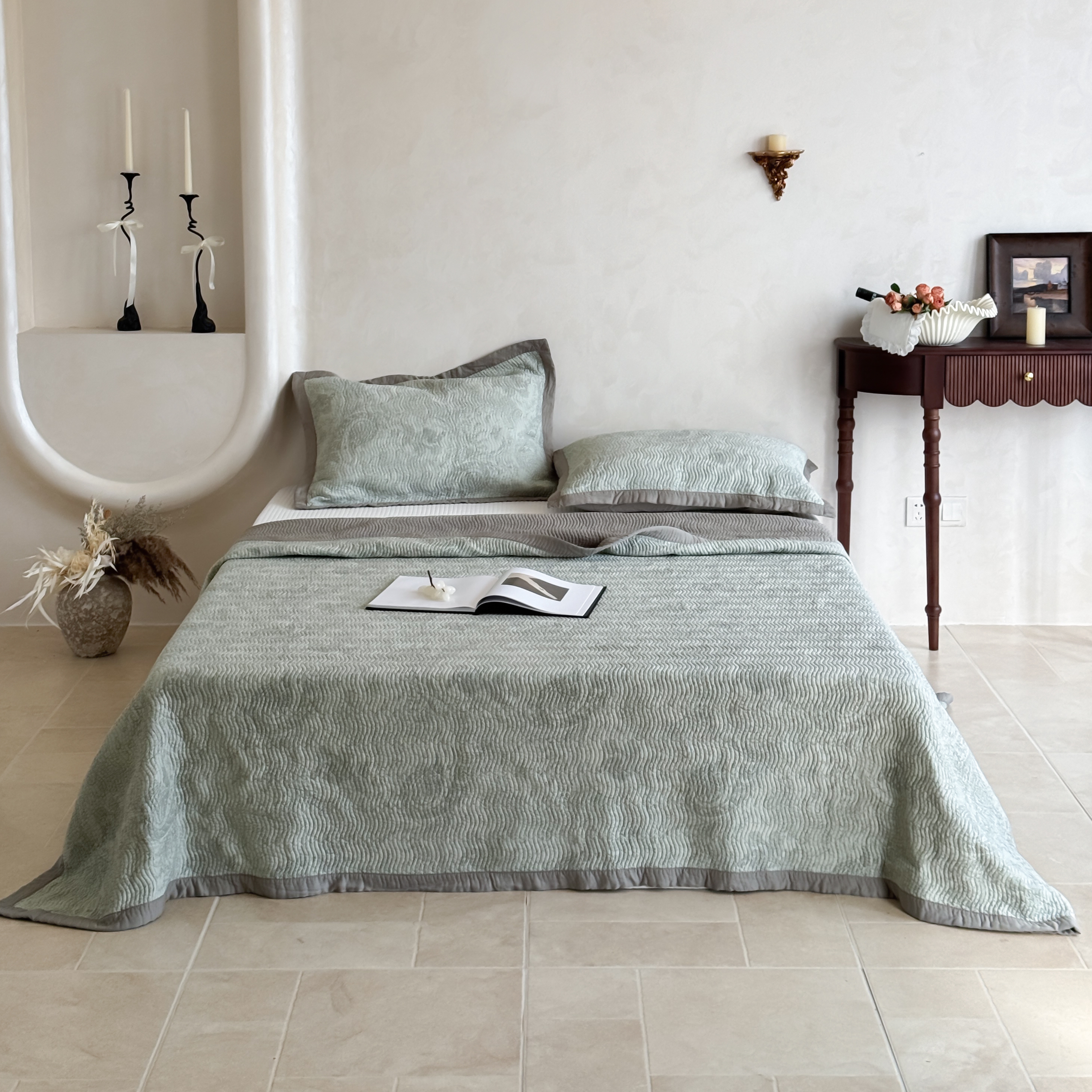 商品名称:床盖工厂店 2026新款莫代尔天丝床盖波浪纹绗缝床盖三件套 牧人-绿