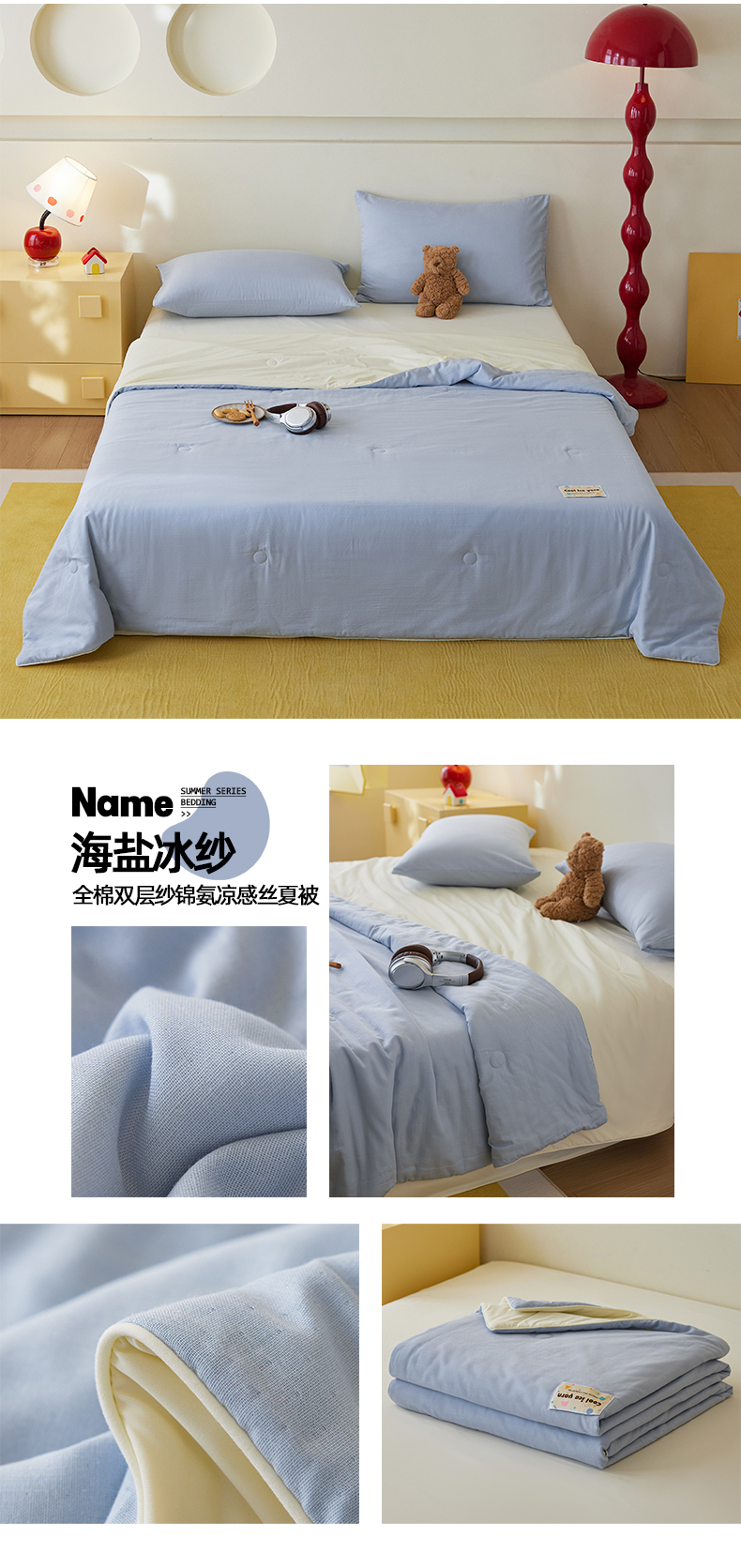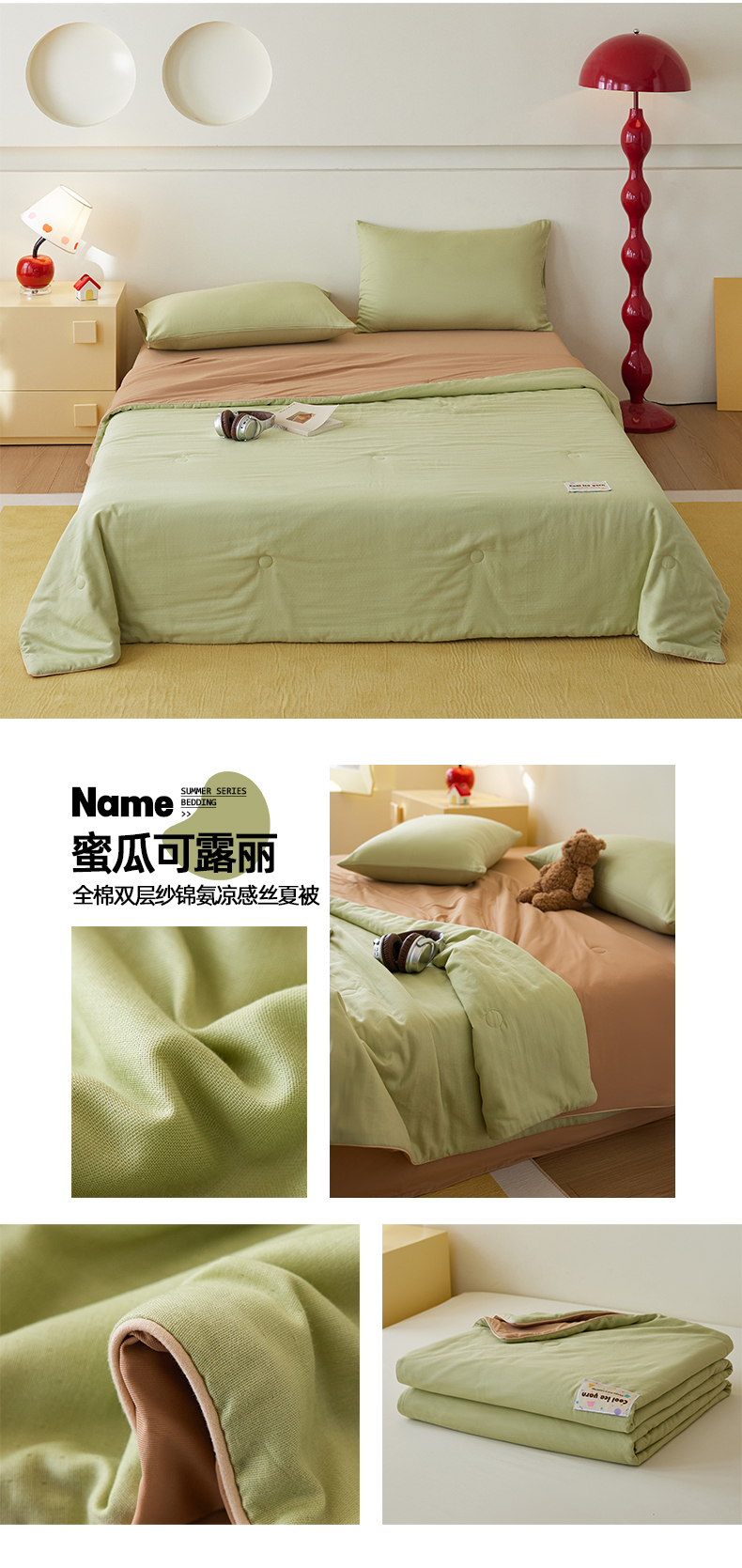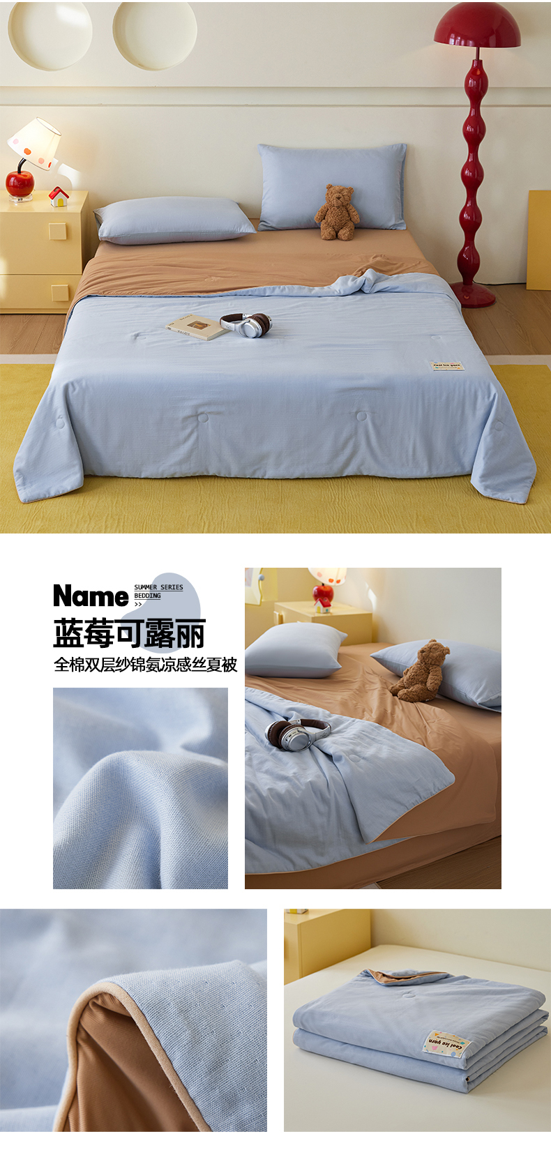 (总)莱宁被业 2026新款冰纱系列全棉双层纱锦氨凉感丝夏被,草莓冰纱,凤梨冰纱,海盐冰纱,蓝莓可露丽,芒果可露丽,蜜瓜可露丽,抹茶冰纱,拿铁冰纱,椰椰冰纱,芋泥冰纱,组合图