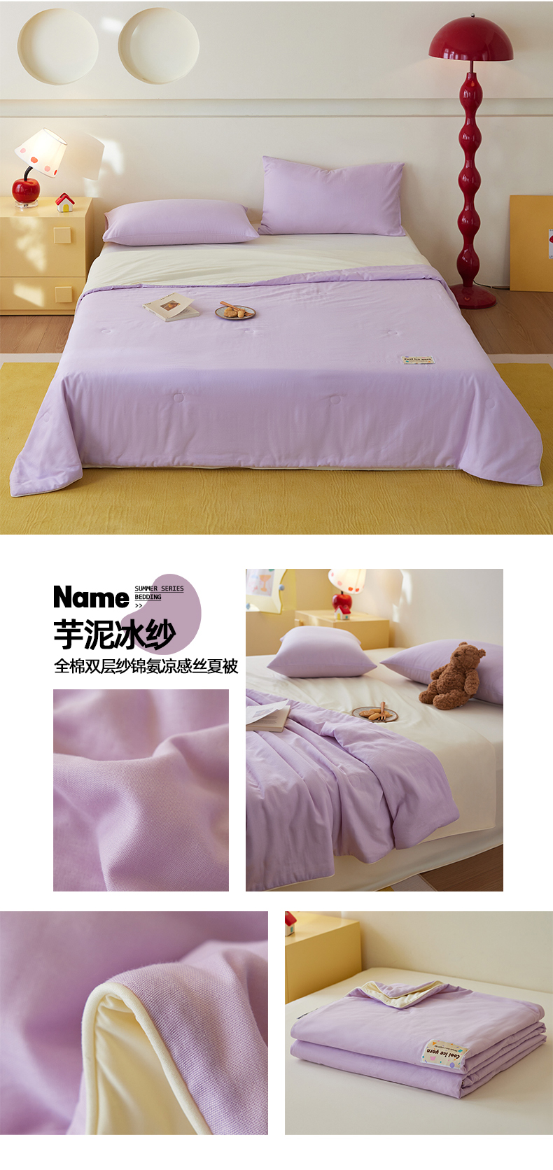 商品名称:莱宁被业 2026新款冰纱系列全棉双层纱锦氨凉感丝夏被 芋泥冰纱