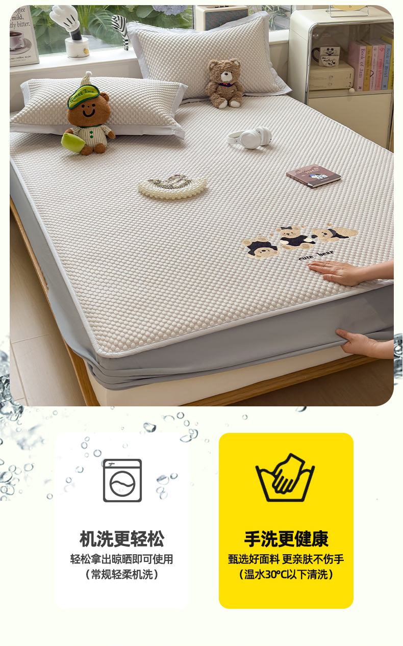 商品名称:宜派家纺 2026新款A类卡通3D冰豆豆凉席三件套凉感值过0.21夏天刺绣冰丝席可机洗儿童空调软席子 冰川咖-床笠