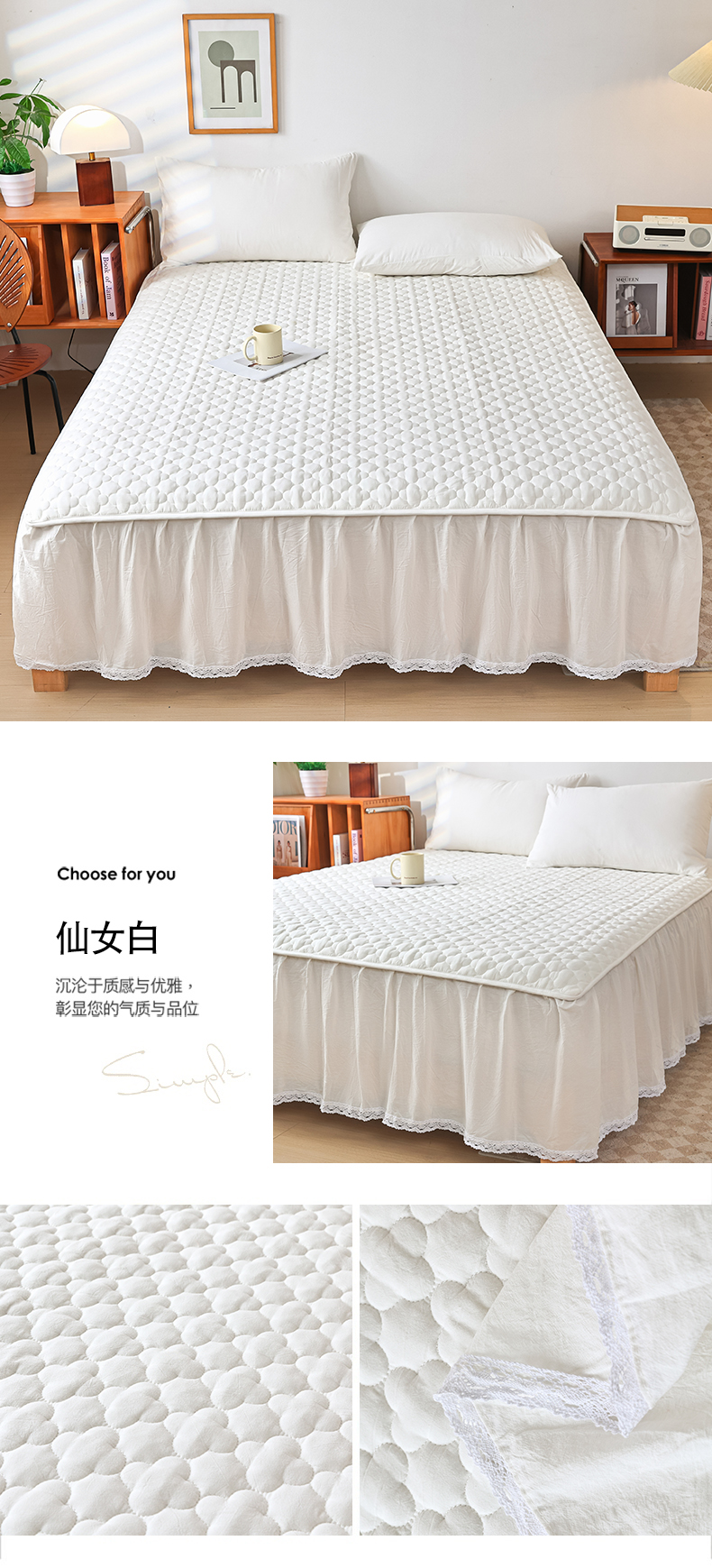 • 91家纺网 家纺一手货源 找家纺 欧妮家纺 2026新款全棉色织水洗棉夹棉床裙 日式水洗棉夹棉床裙J-白色