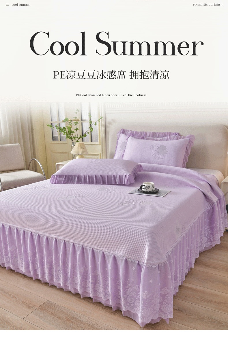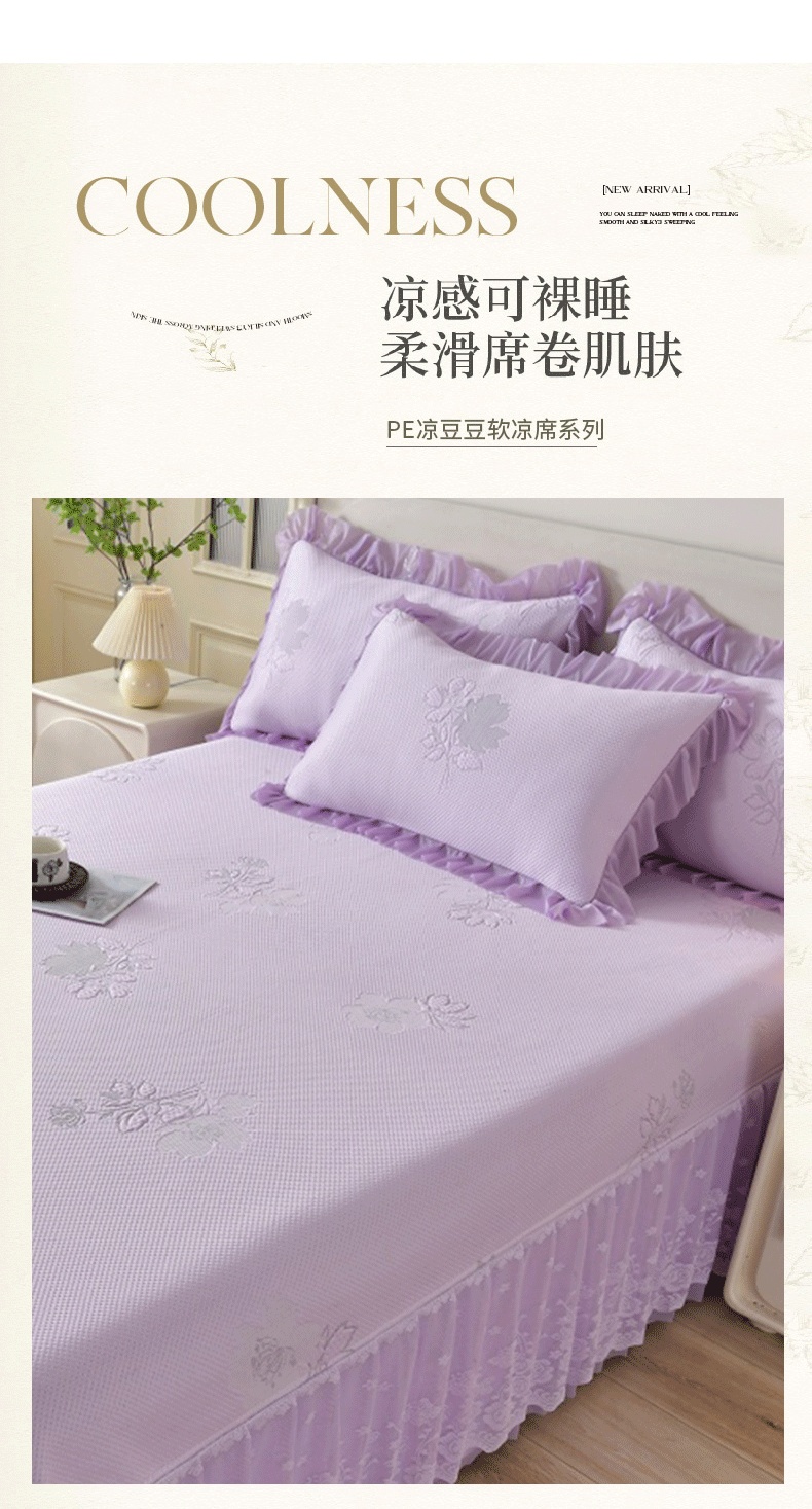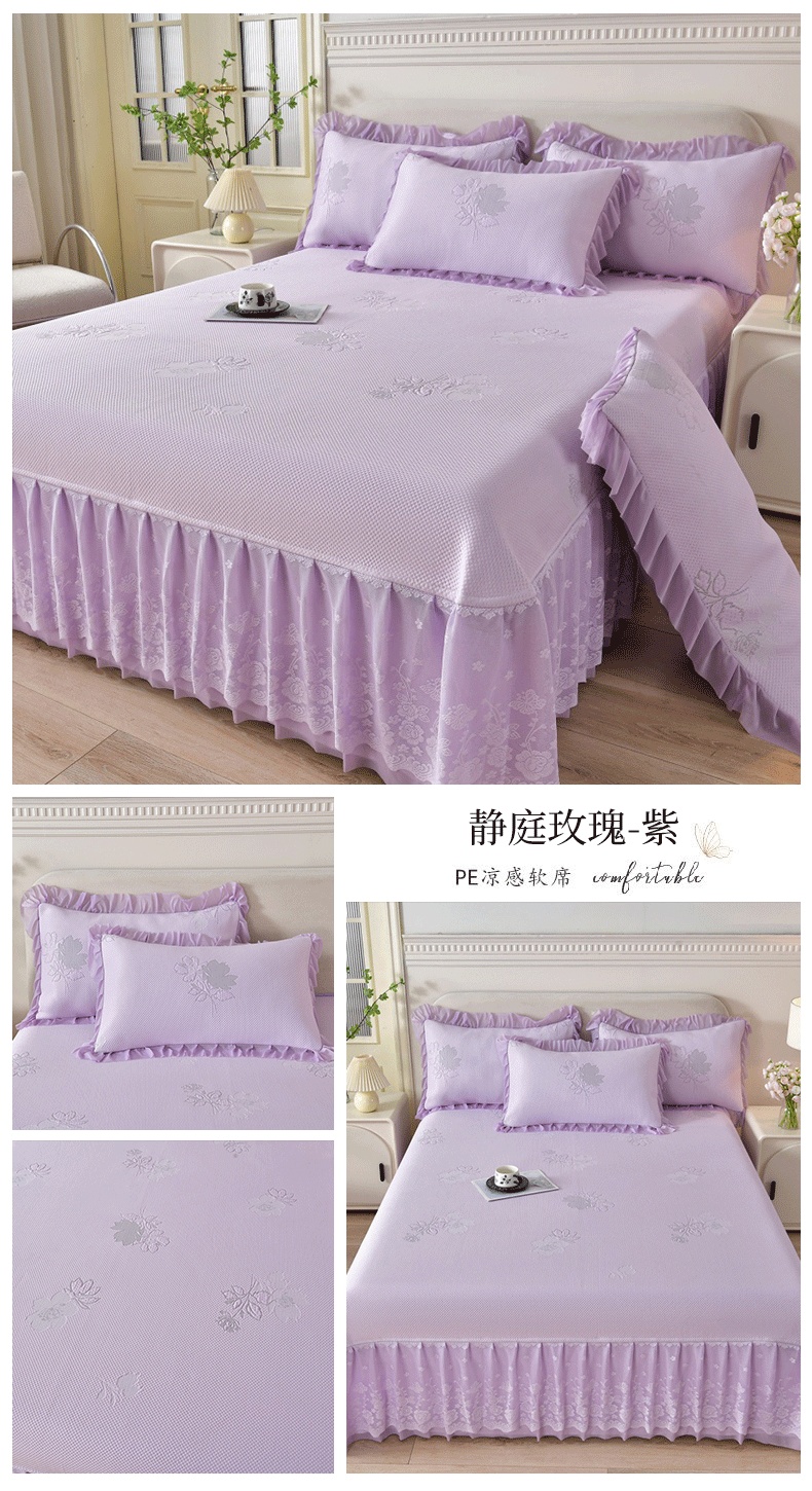 商品名称:绒耀家纺 直播新款加厚复合冰豆豆PE高分子凉感丝双面提花凉席三件套双层花边(控价最低139起) 静庭玫瑰-紫
