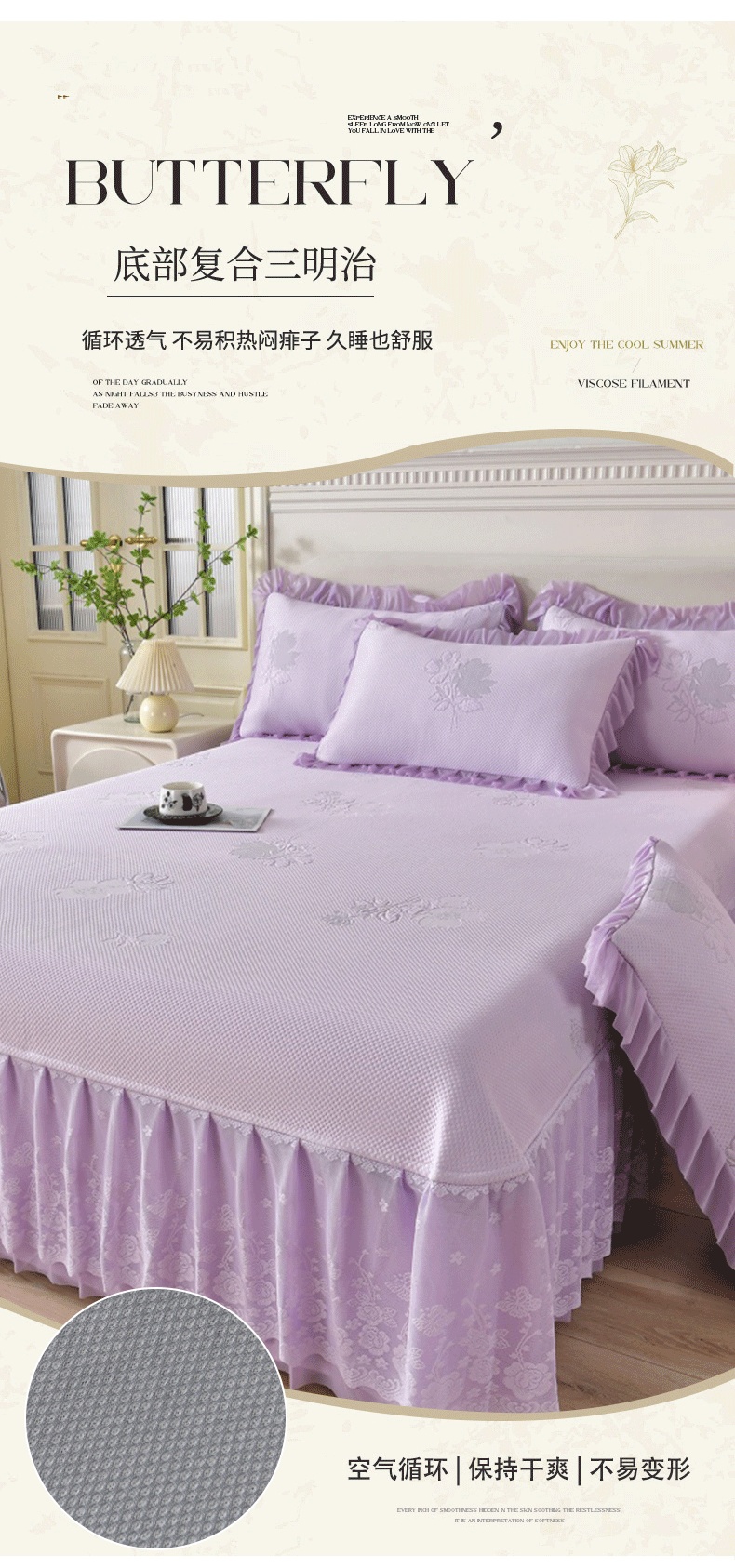 绒耀家纺 直播新款加厚复合冰豆豆PE高分子凉感丝双面提花凉席三件套双层花边(控价最低139起) 静庭玫瑰-紫
