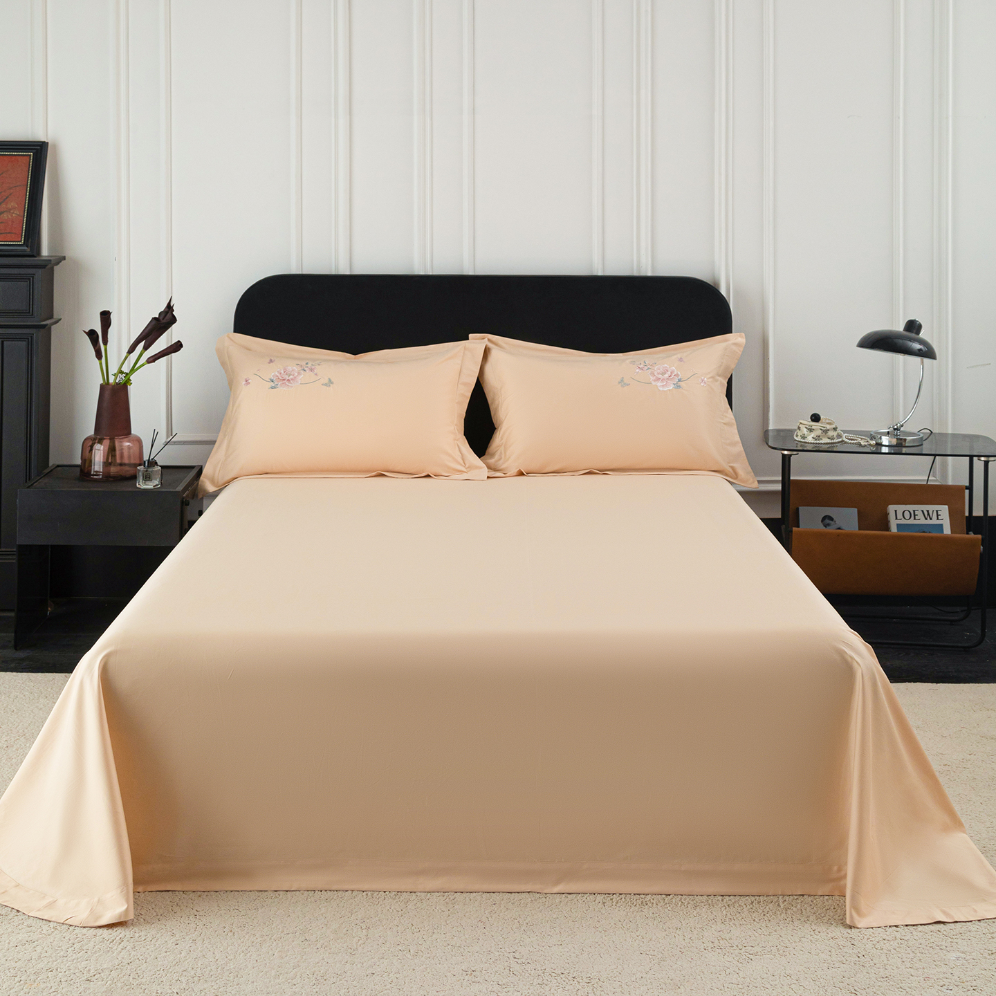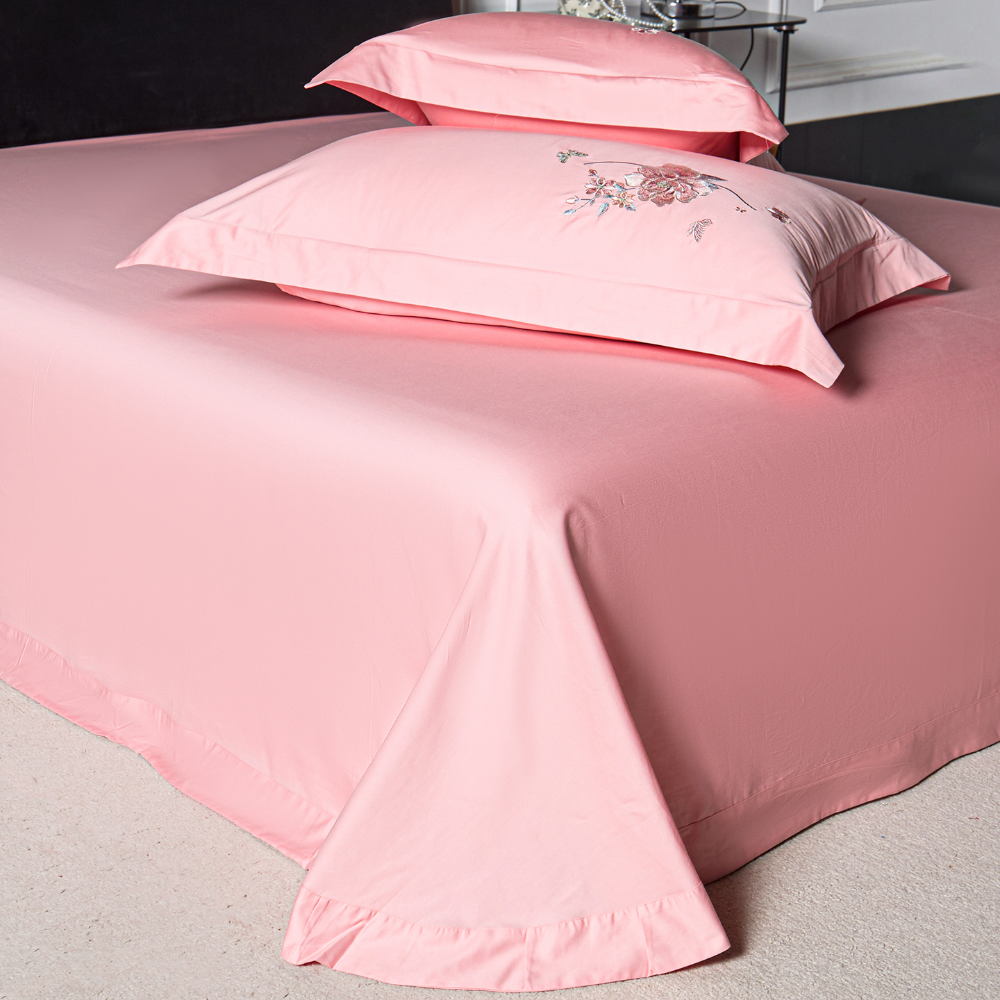 • 91家纺网 家纺一手货源 找家纺 莉迪娅 2026新款50s双股长绒棉纯色简约绣花床单三件套--花开牡丹系列 粉豆沙牡丹