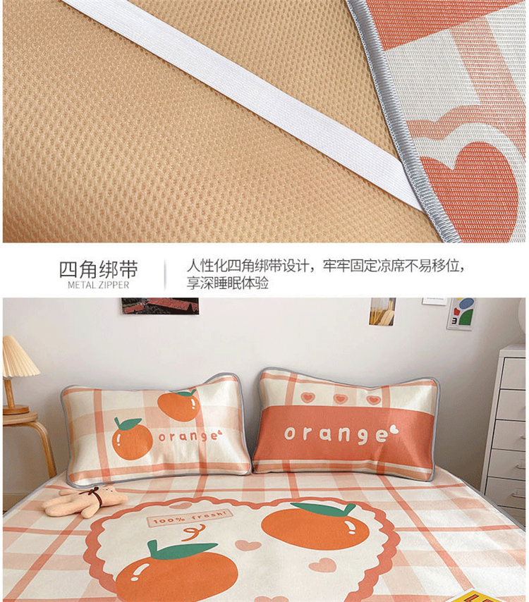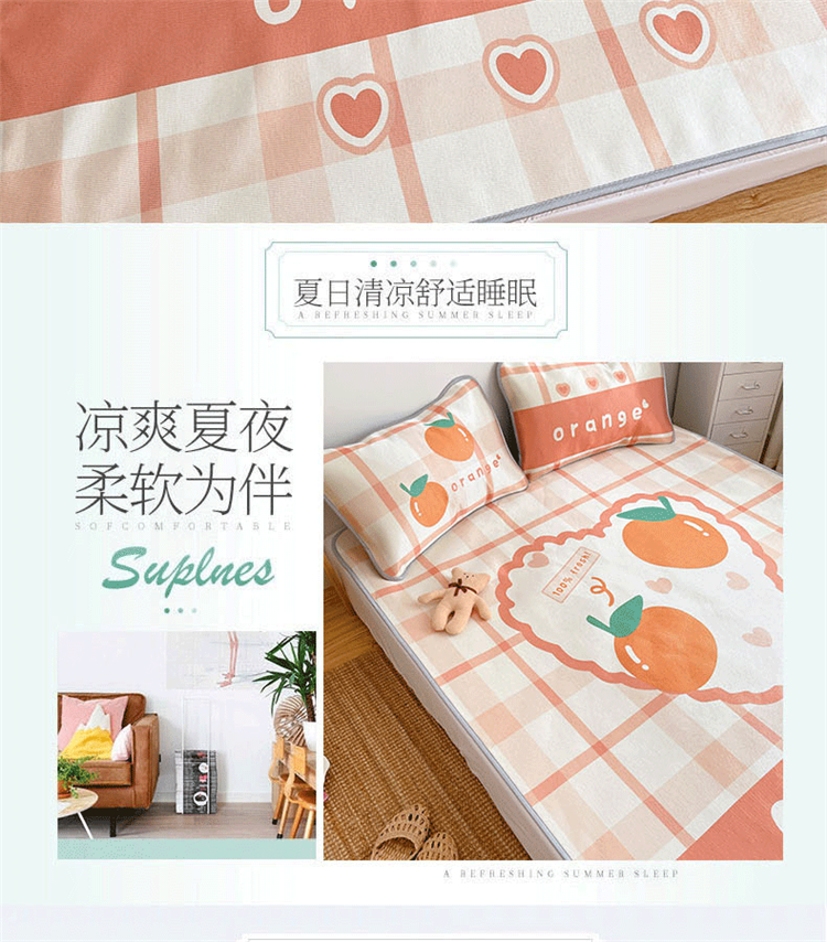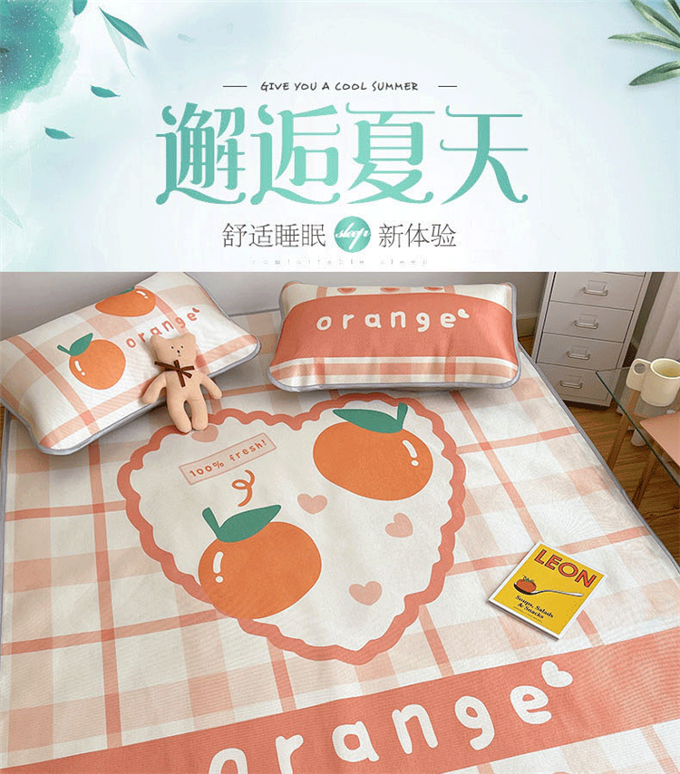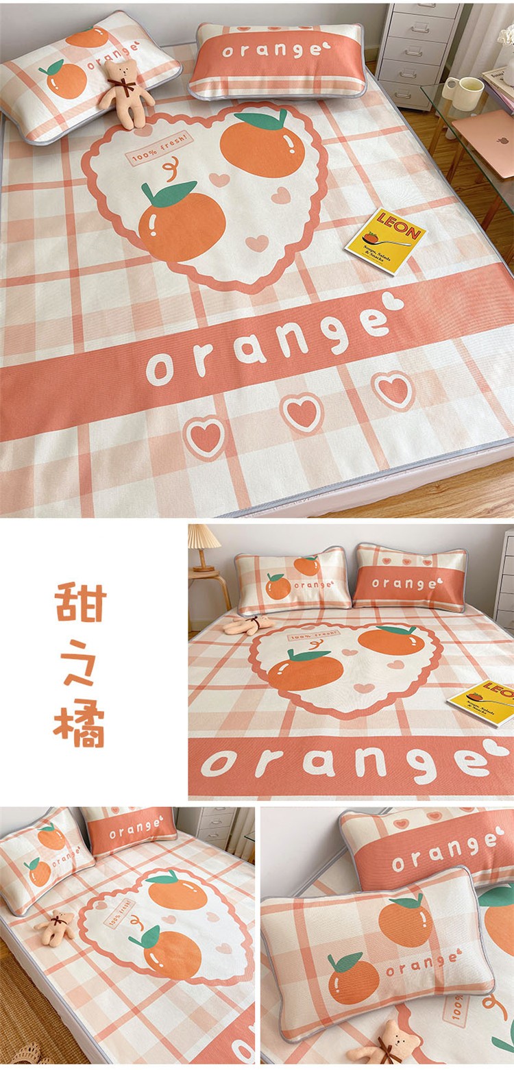 川悦生活 直播供货2021新款小清新大版冰丝席卡通凉席三件套甜之橘