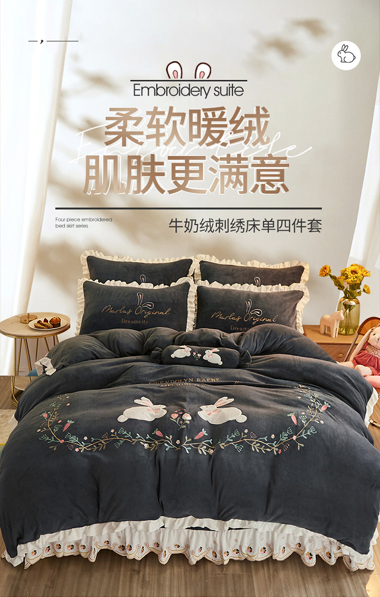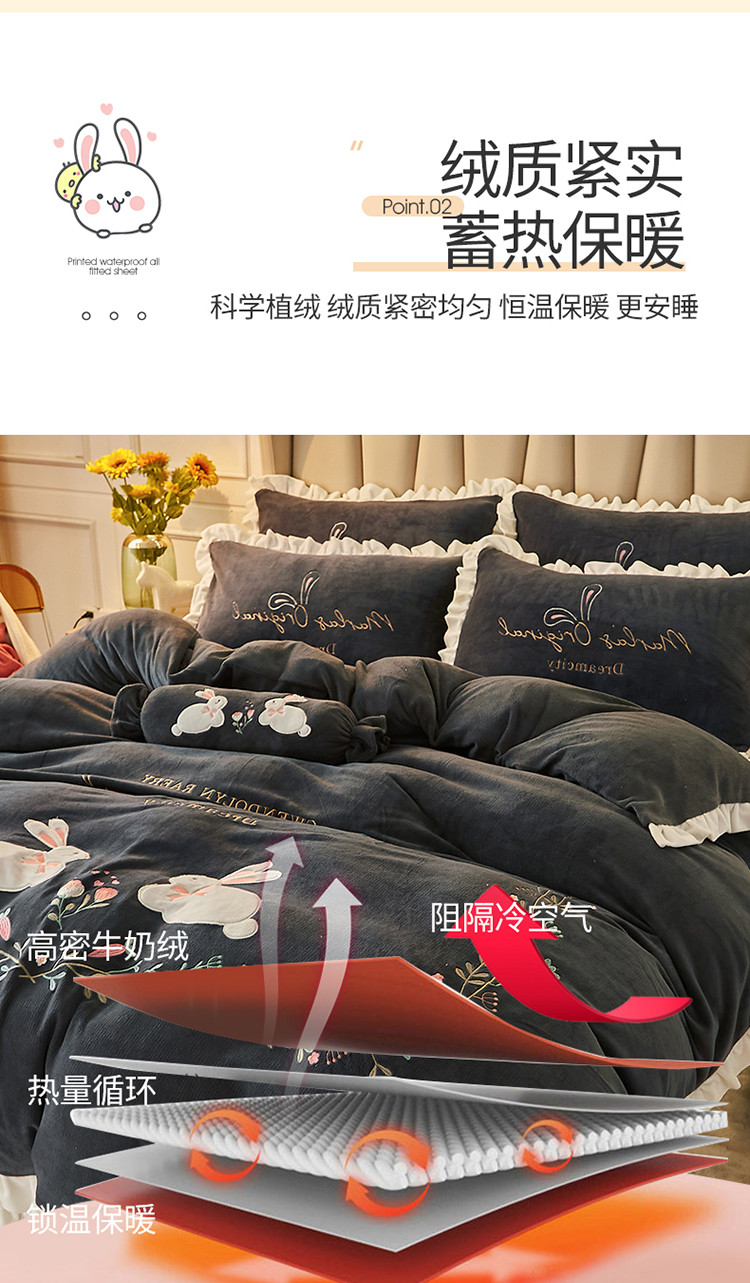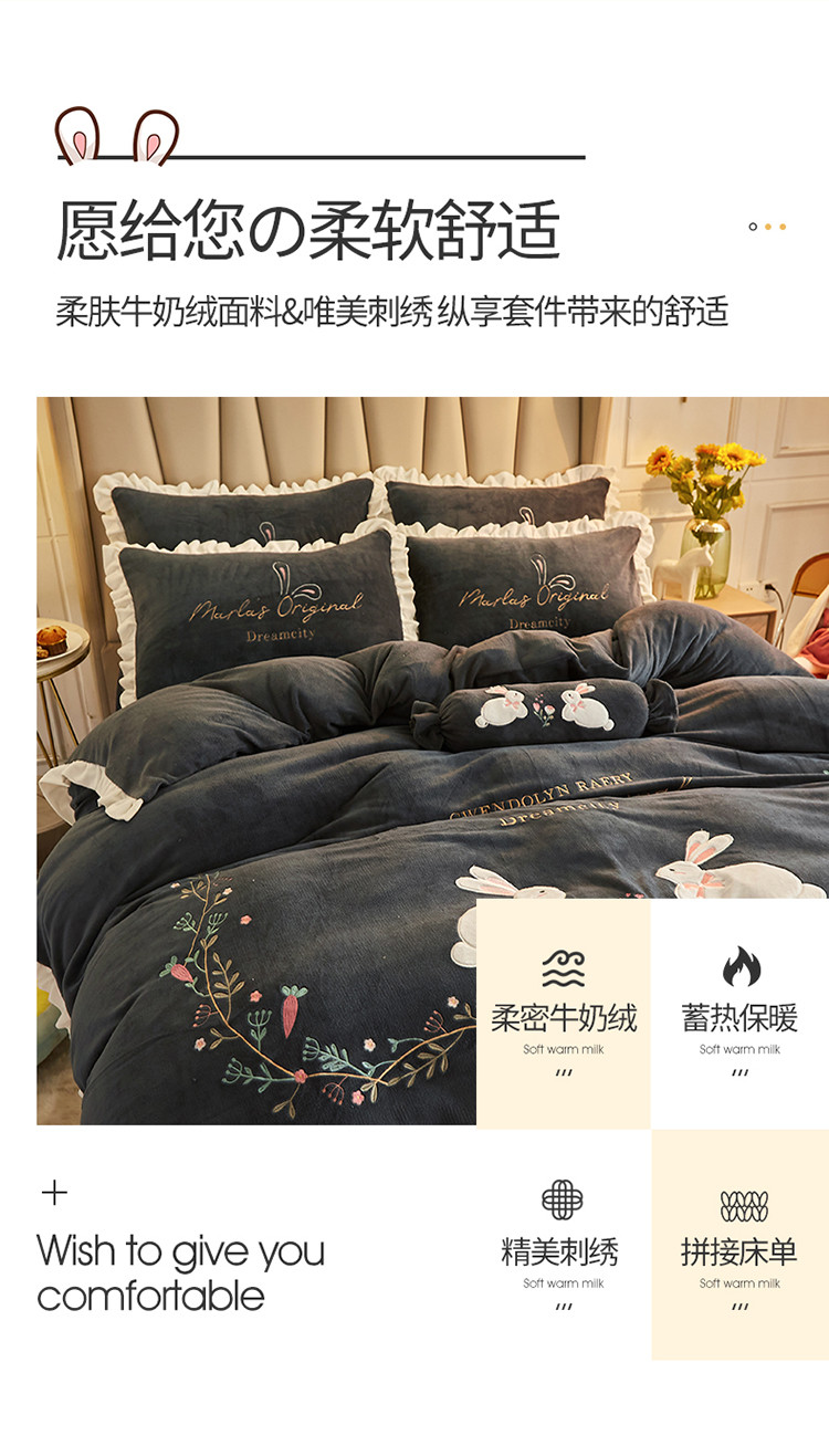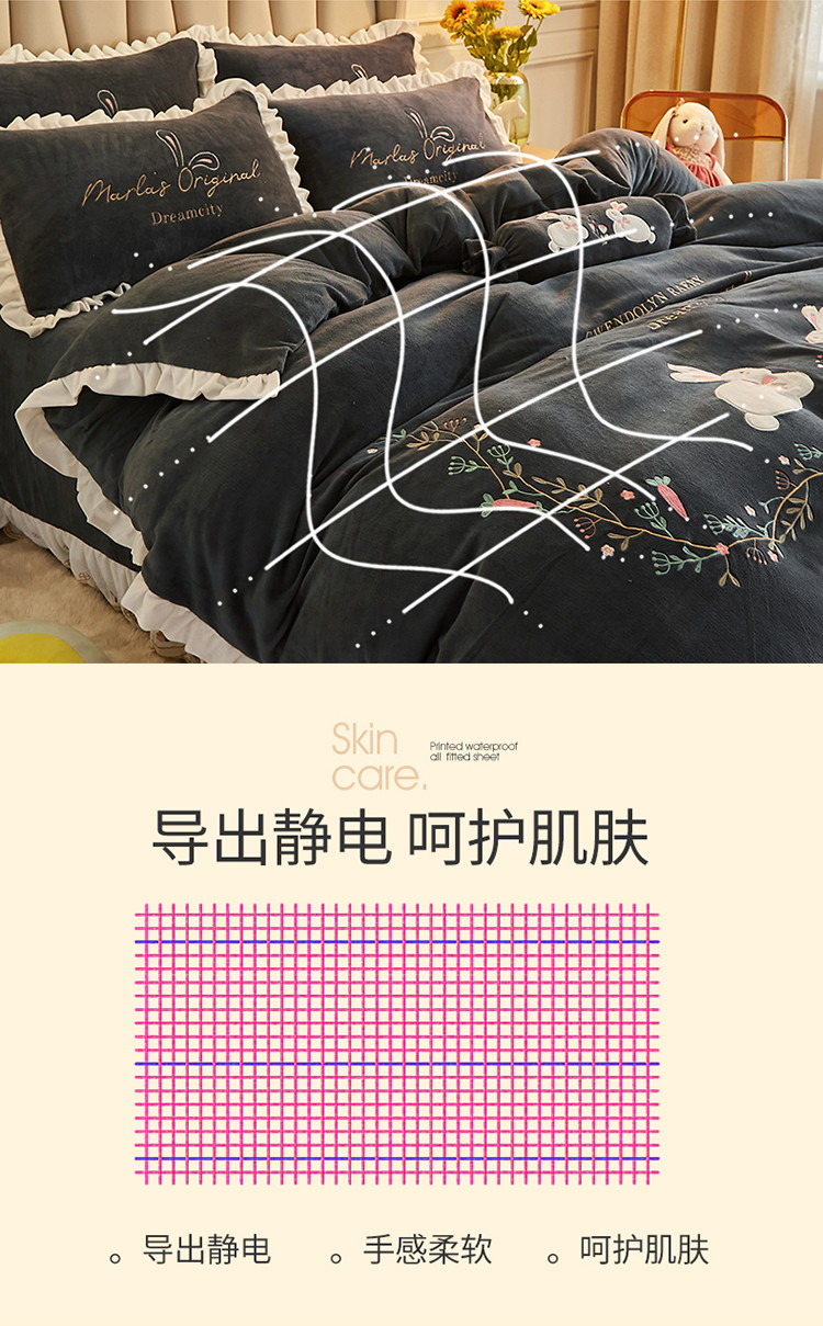 宜凡 2021新款牛奶绒绣花兔床单四件套 萌萌兔-雅灰
