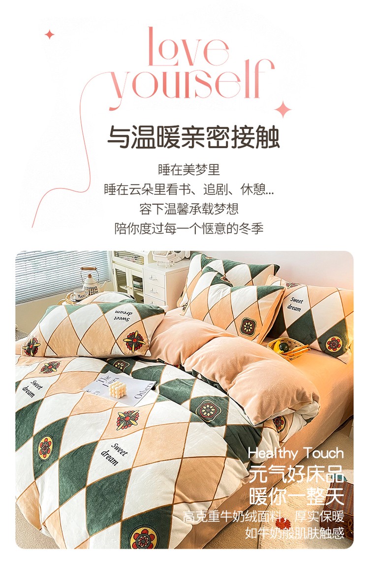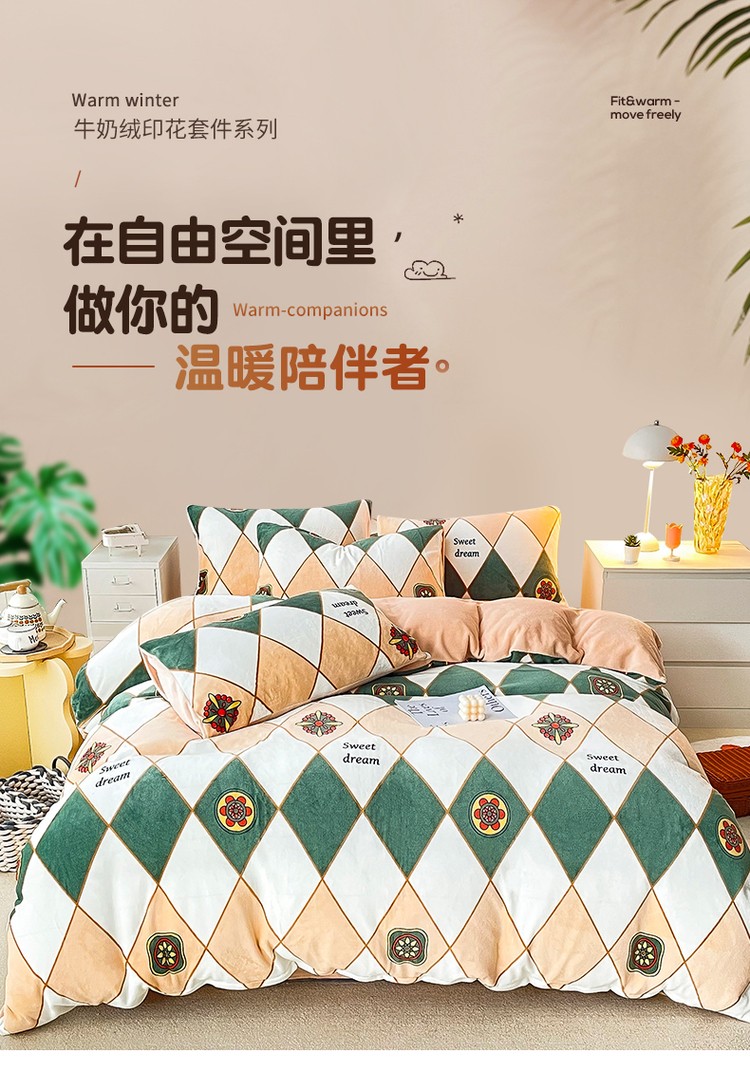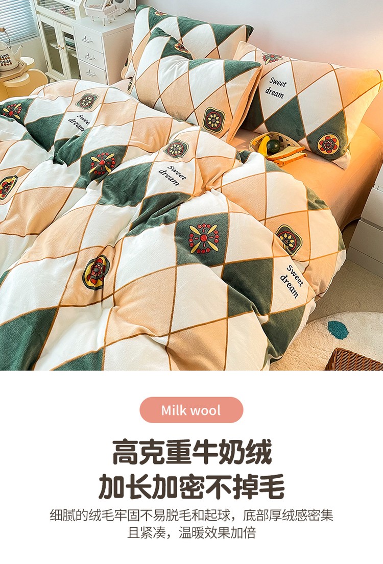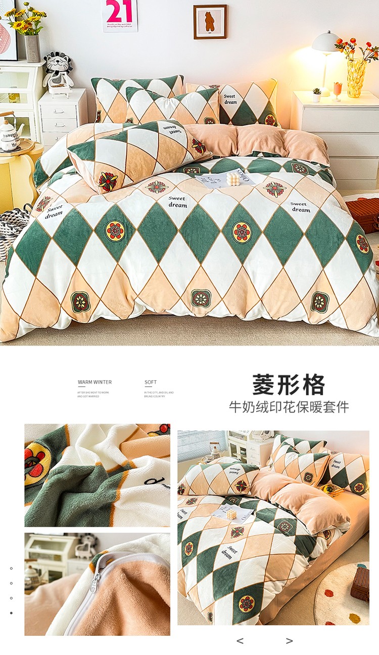 优彩 2021新款200克高克重印花牛奶绒四件套 菱形格