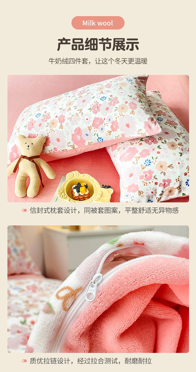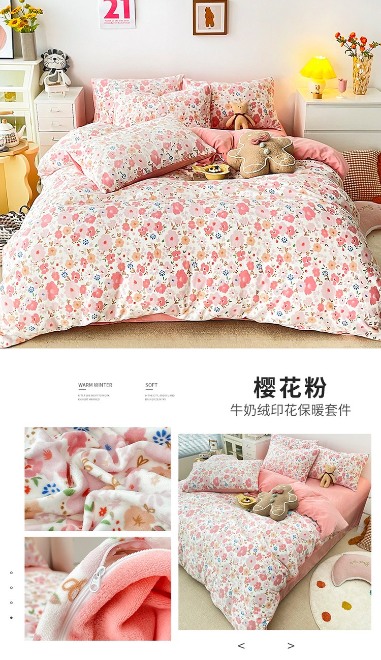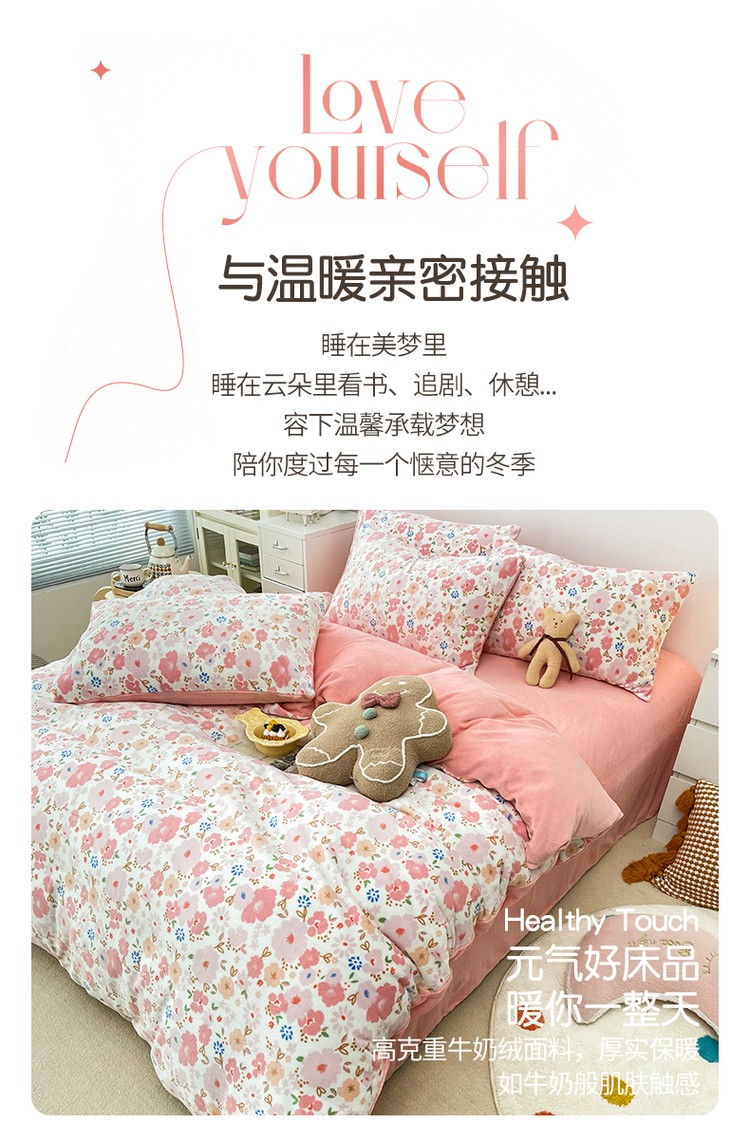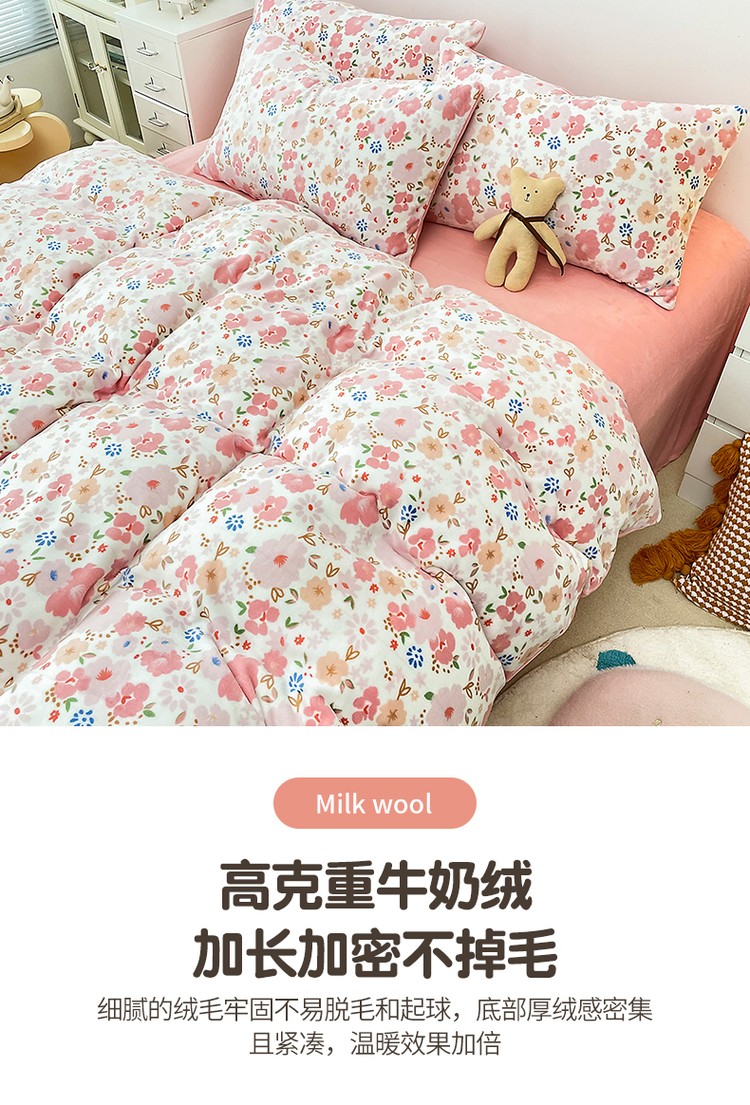 商品名称:优彩 2021新款200克高克重印花牛奶绒四件套 樱花粉