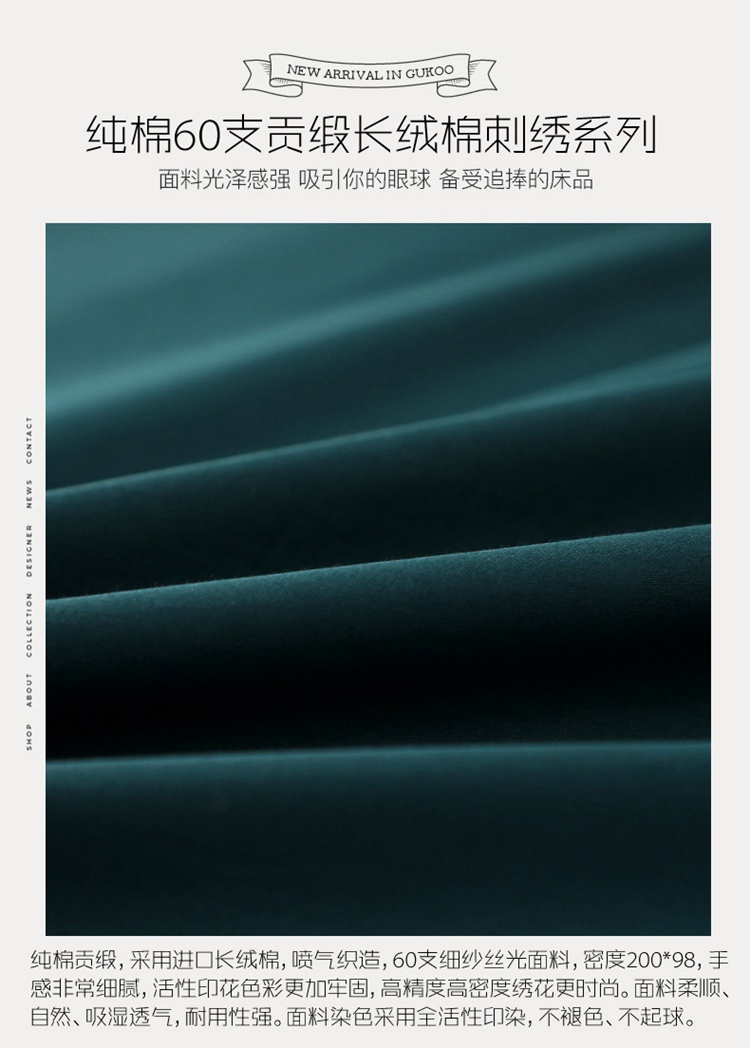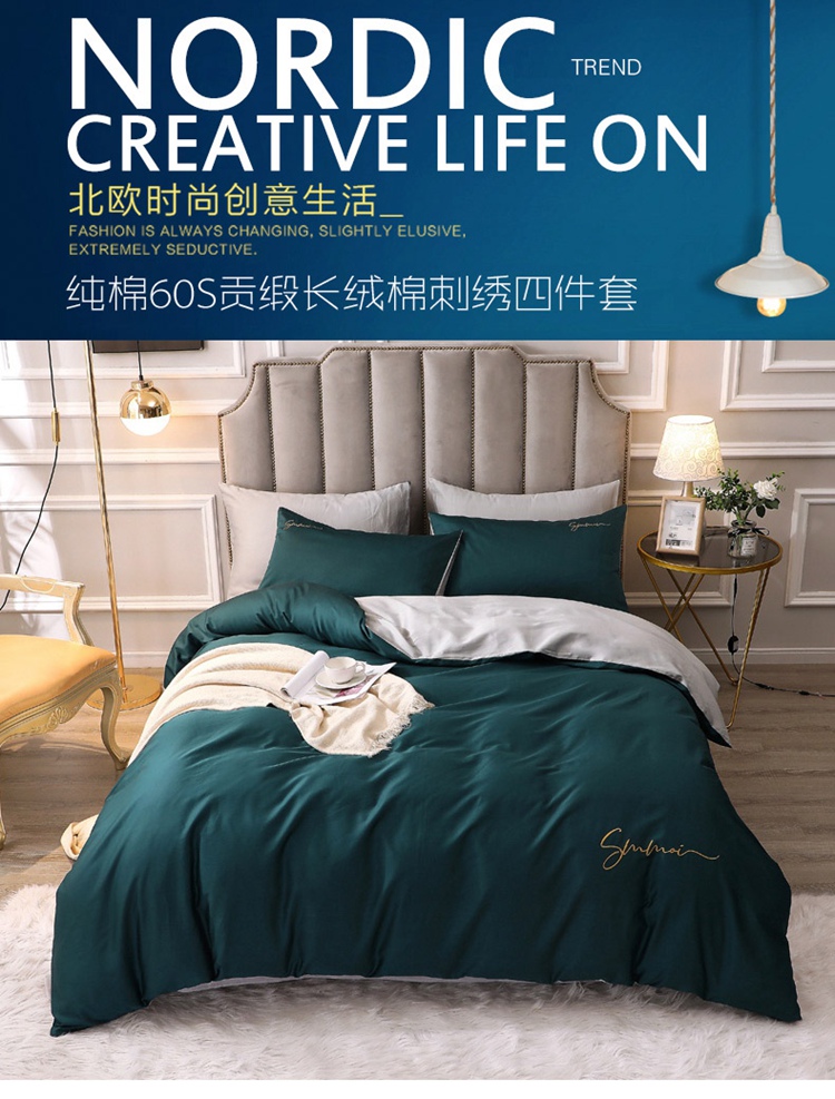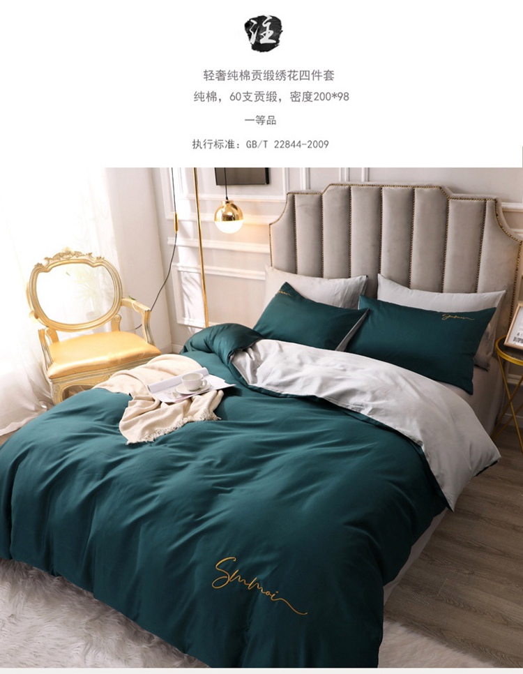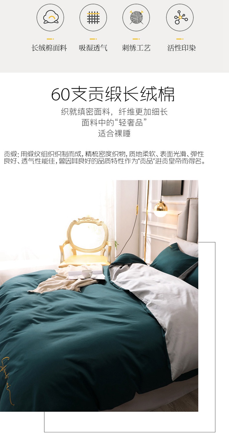 商品名称:晶缦 2022新款全棉纯色60S贡缎长绒棉绣花四件套 洛拉-猫眼绿