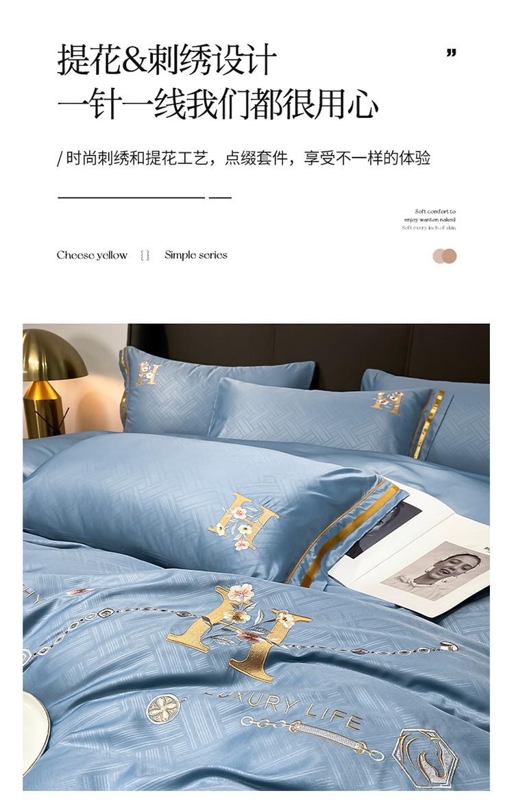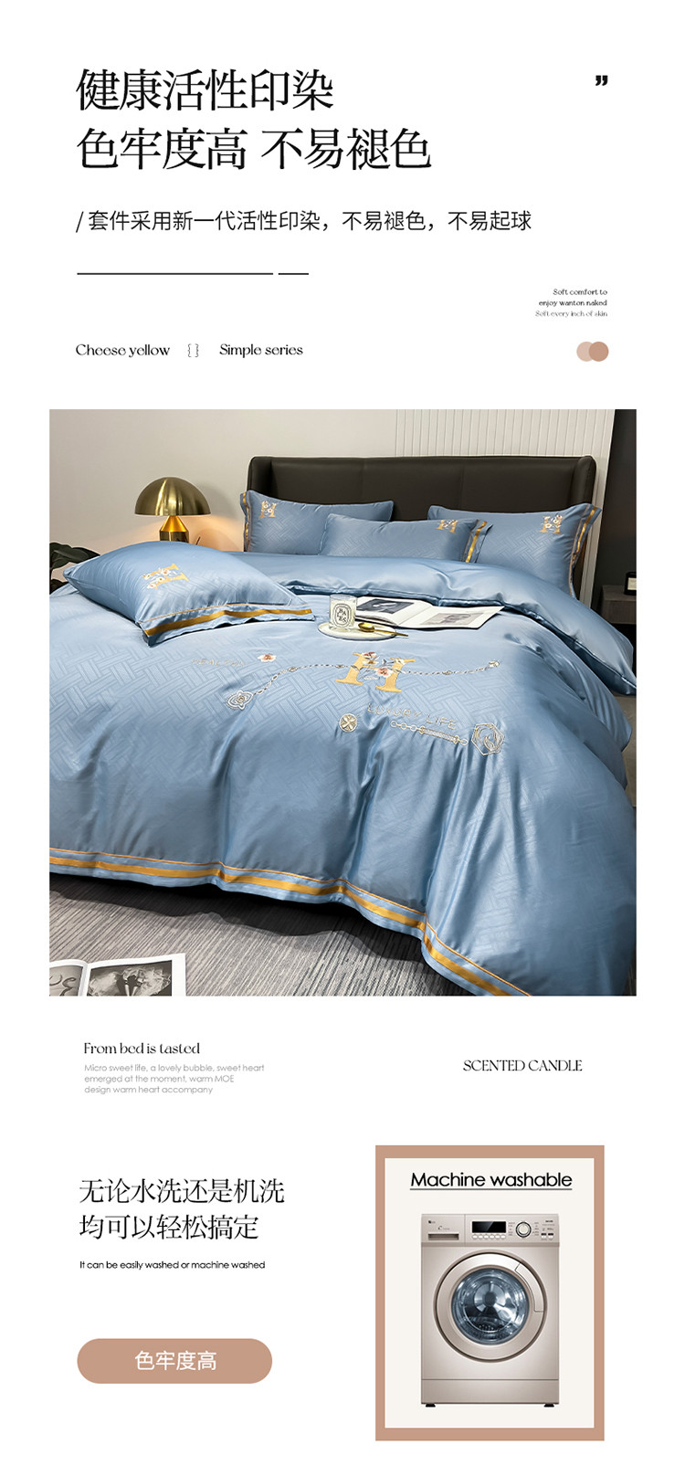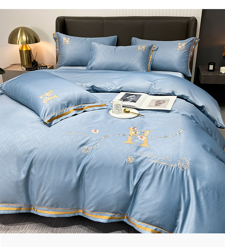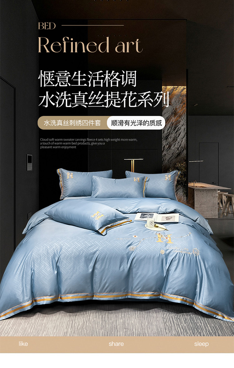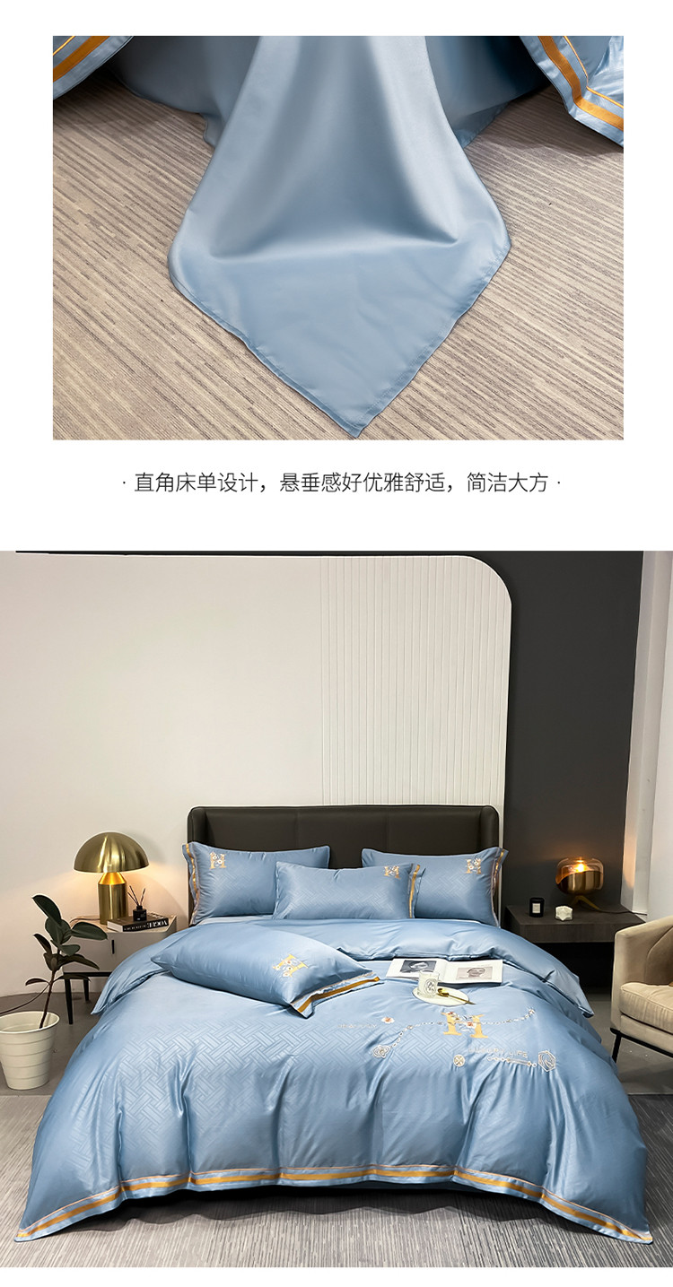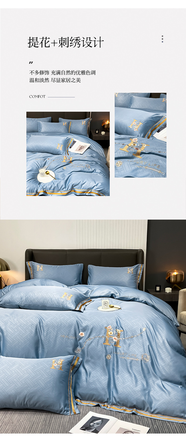 嗯呢2023新款刺绣H款轻奢提花水洗真丝四件套提花-宾利蓝
