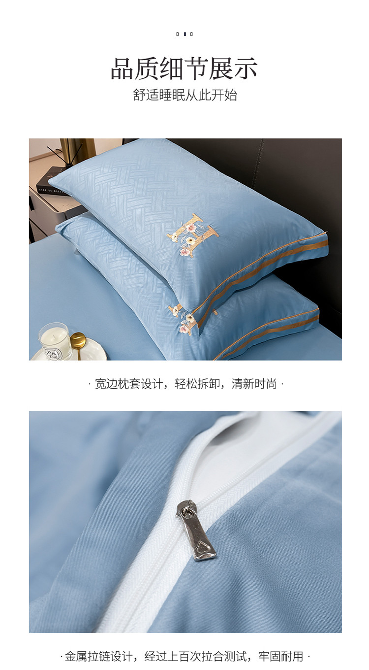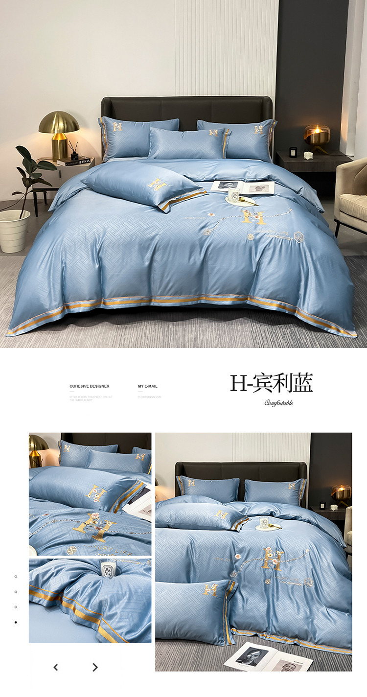 商品名称:嗯呢2023新款刺绣H款轻奢提花水洗真丝四件套提花-宾利蓝