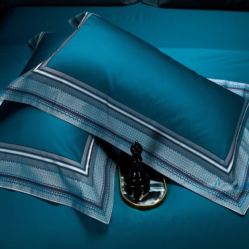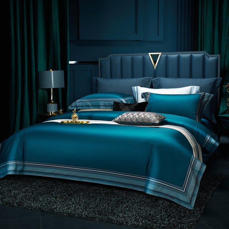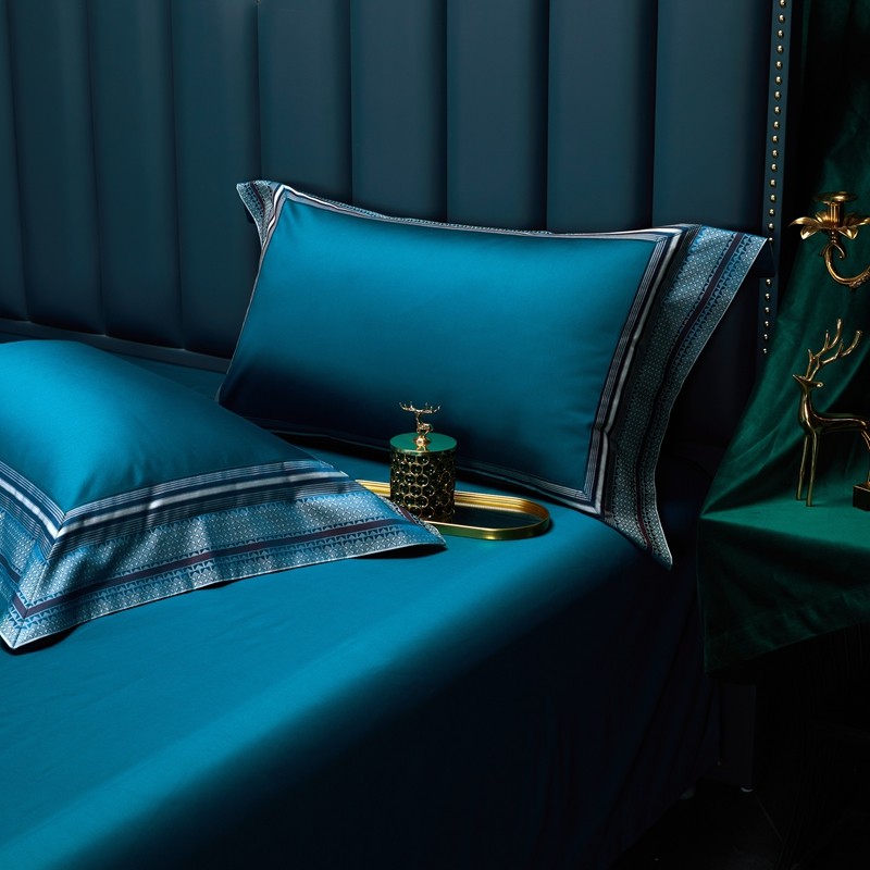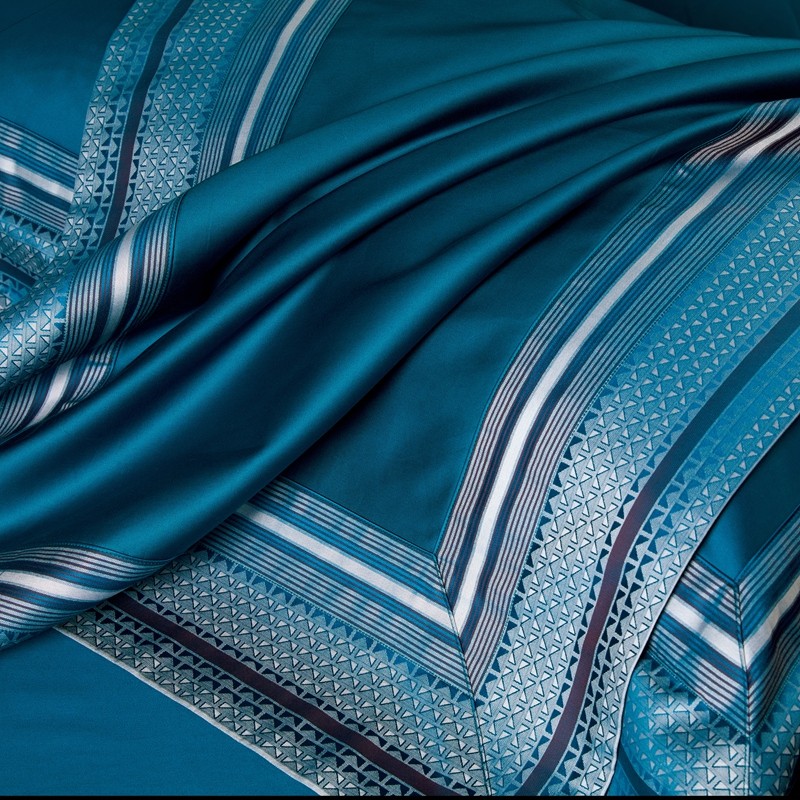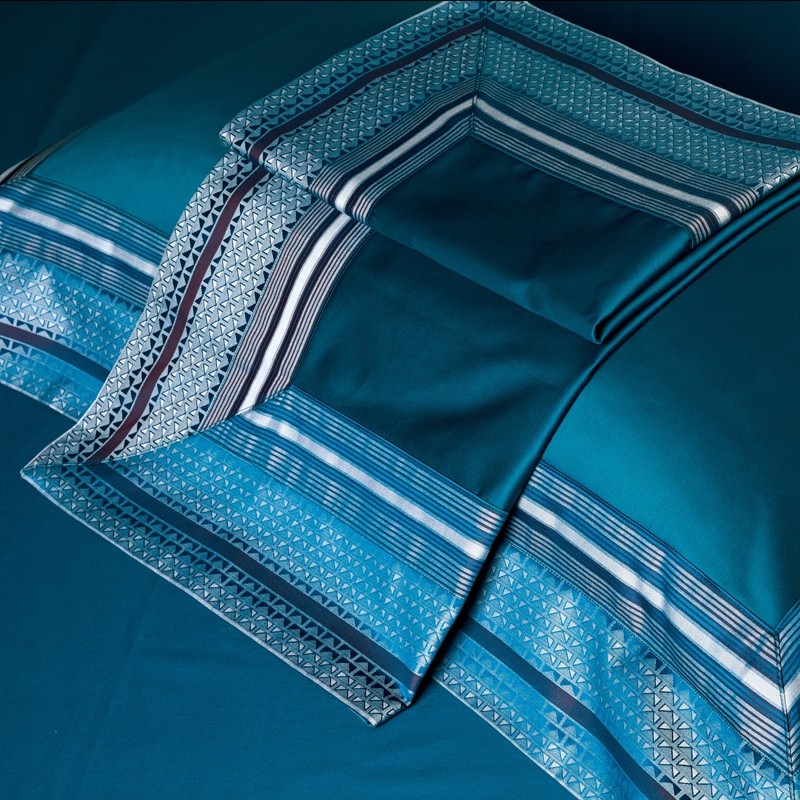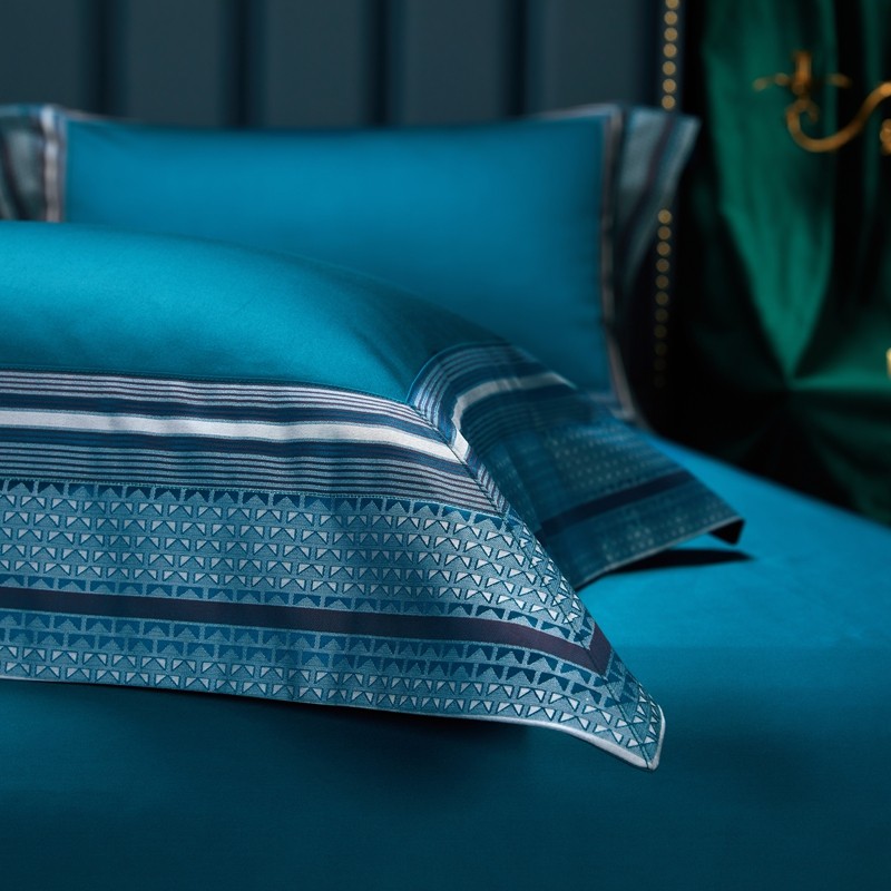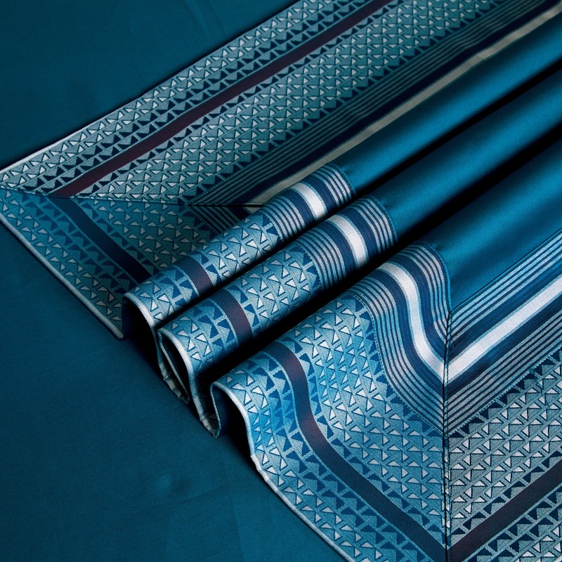 雅韵诗真丝馆 2023新款全棉色织拼边四件套 色织拼边孔雀蓝
