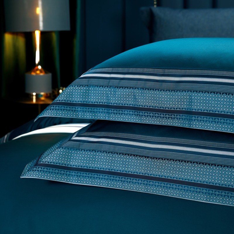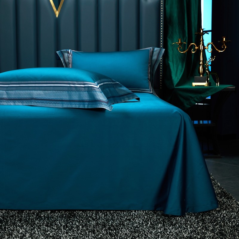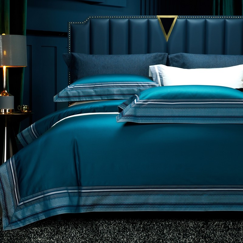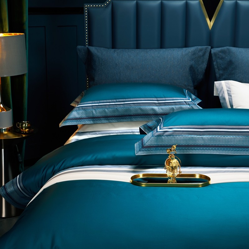 商品名称:雅韵诗真丝馆 2023新款全棉色织拼边四件套 色织拼边孔雀蓝