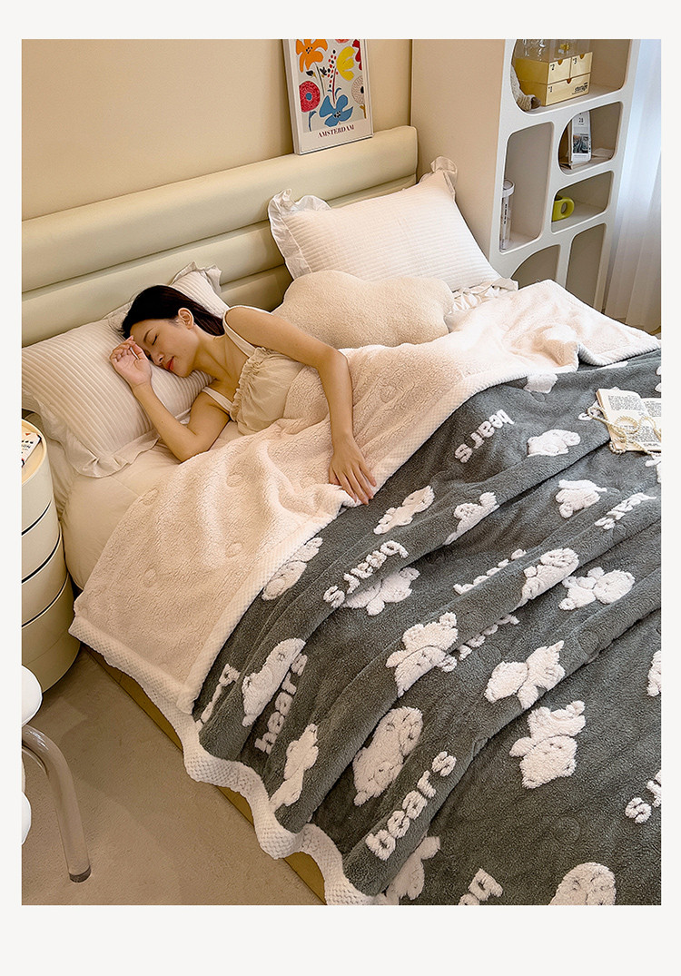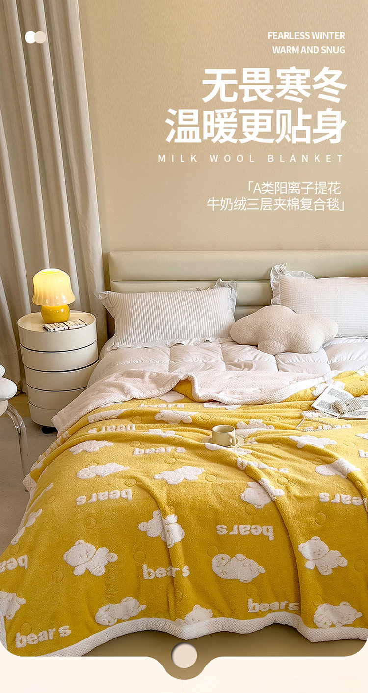 慕木22新款保暖A类阳离子提花牛奶绒三层夹棉复合毯奇幻熊-灰