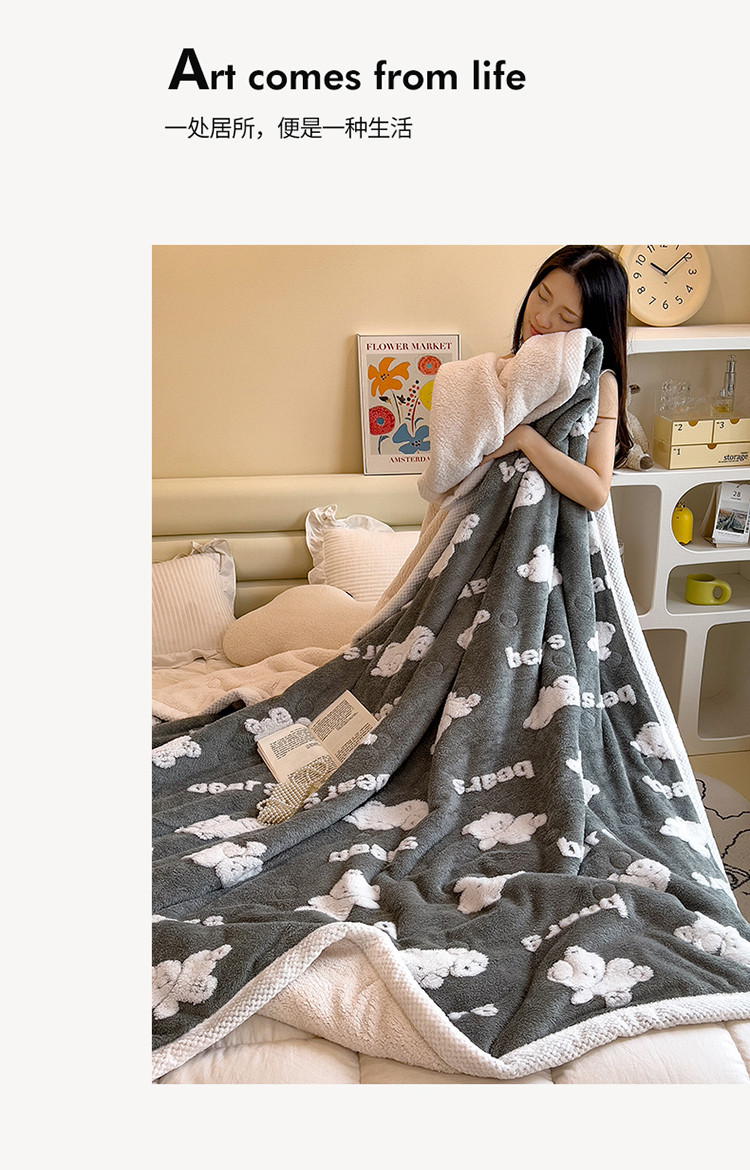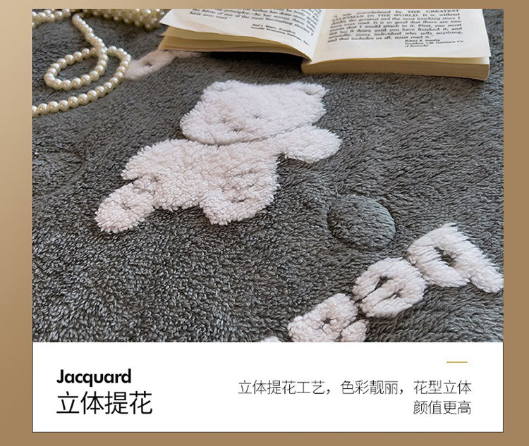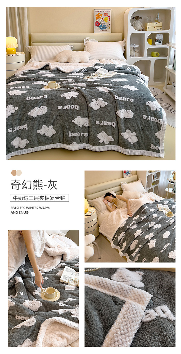 商品名称:慕木22新款保暖A类阳离子提花牛奶绒三层夹棉复合毯奇幻熊-灰