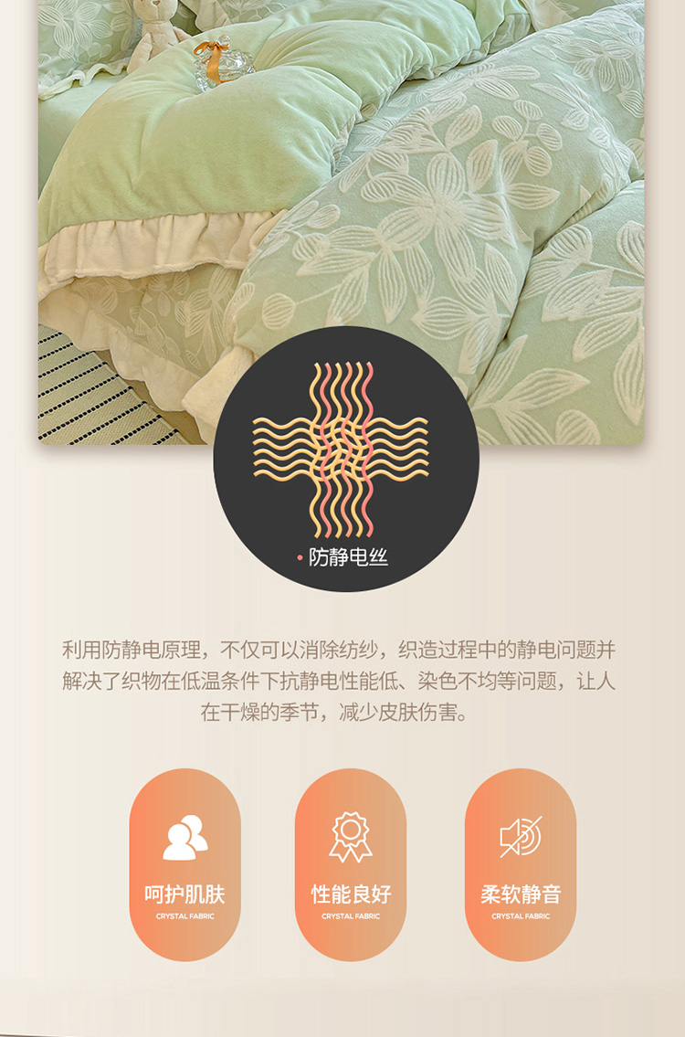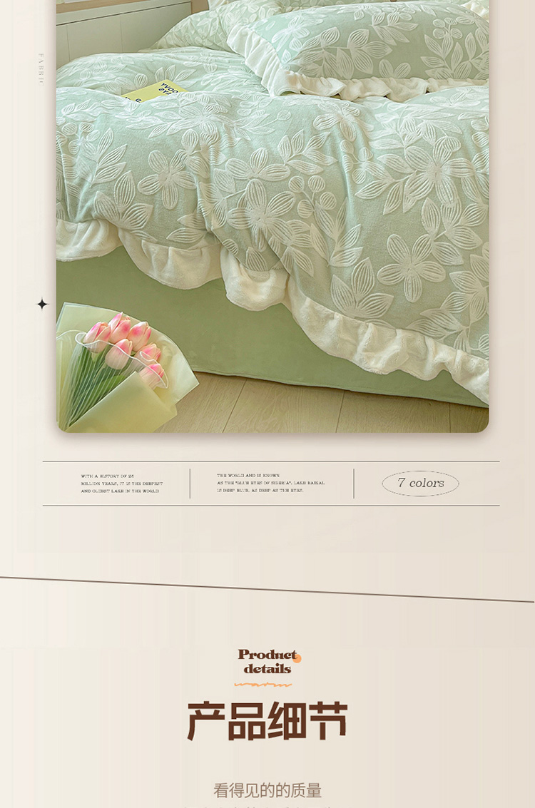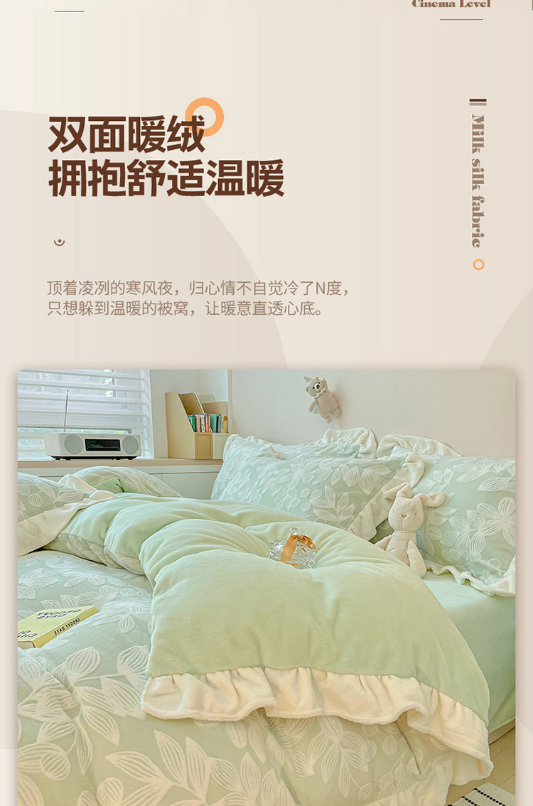 商品名称:琪格格 2023新款雕花牛奶绒花边款四件套 雕花浅绿-花边