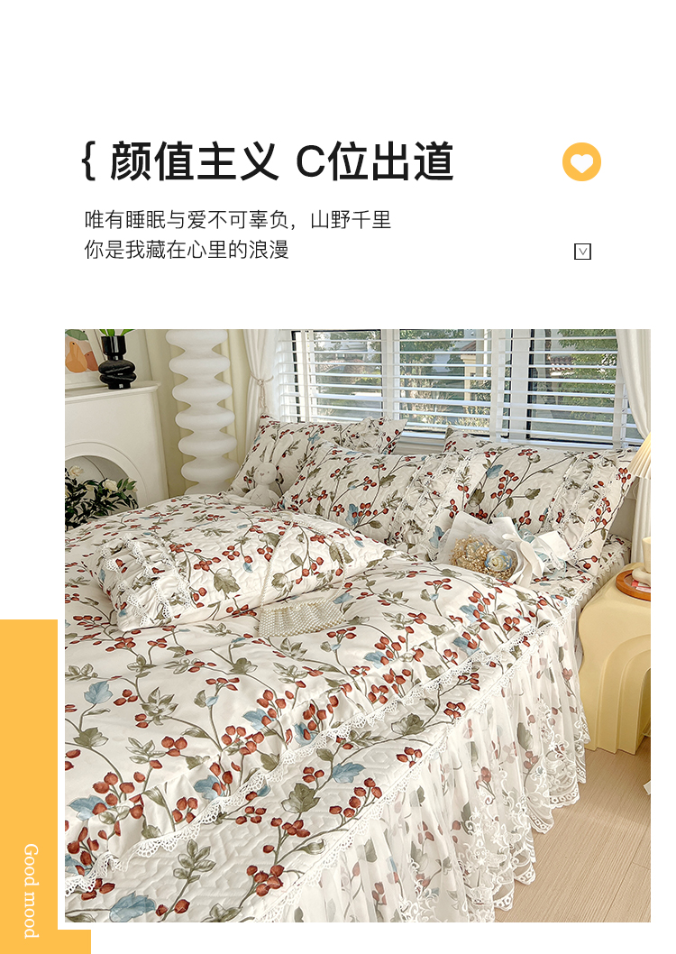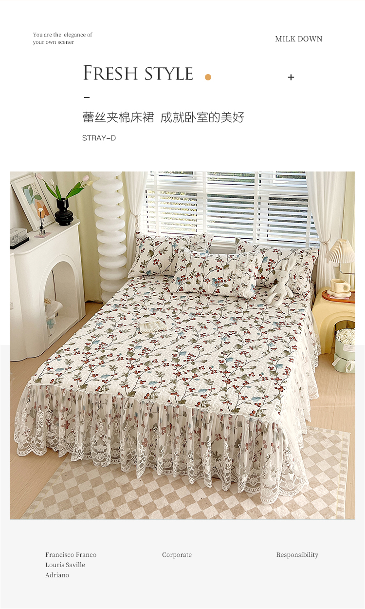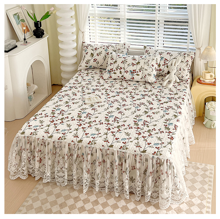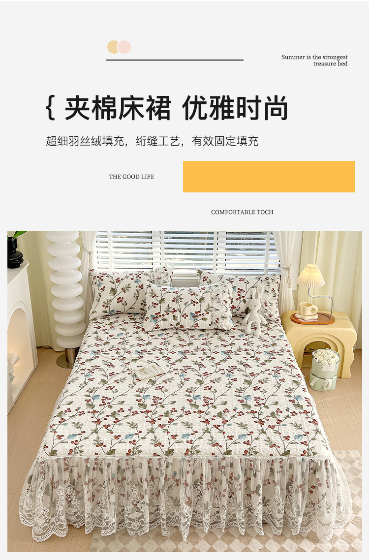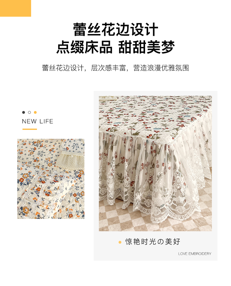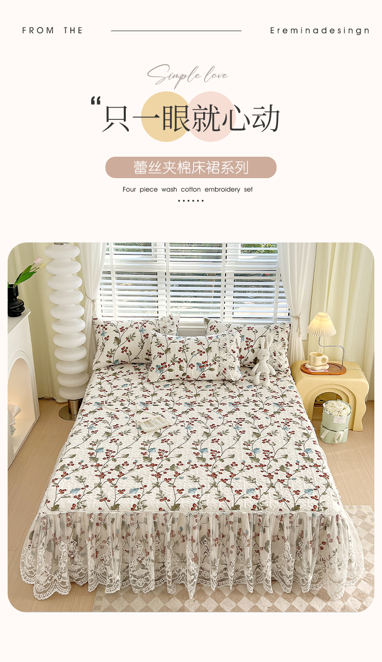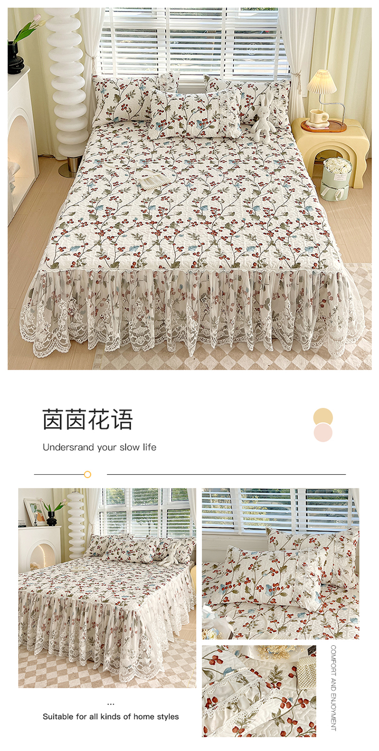 商品名称:罗艺轩 2024新款法式风蕾丝夹棉床裙三件套 花想容-茵茵花语
