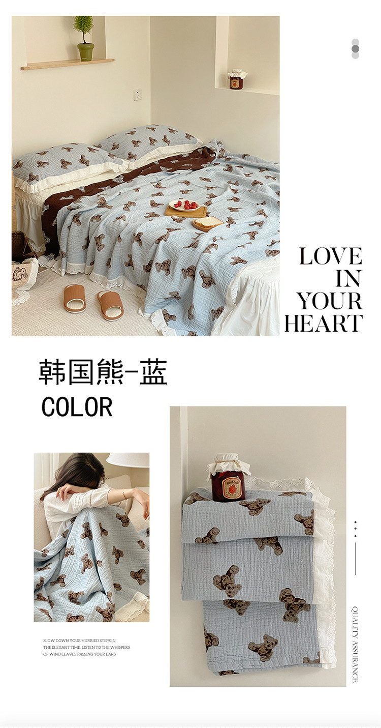 商品名称:麻依 2023新款韩系风全棉长绒棉四层纱布床盖纯棉毛巾被韩国熊-蓝