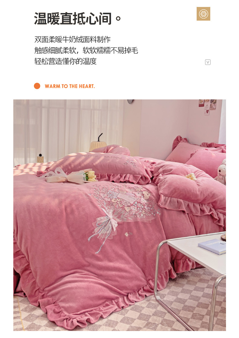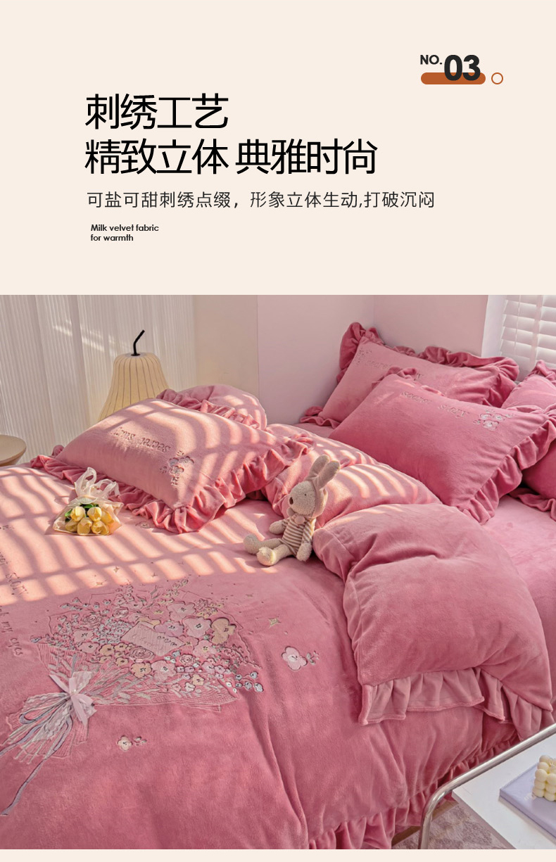 (总)星尚家纺 2024新款加厚保暖全消光牛奶绒夹棉床裙四件套-玫瑰之恋,粉玉,寐紫,浅蓝,水绿