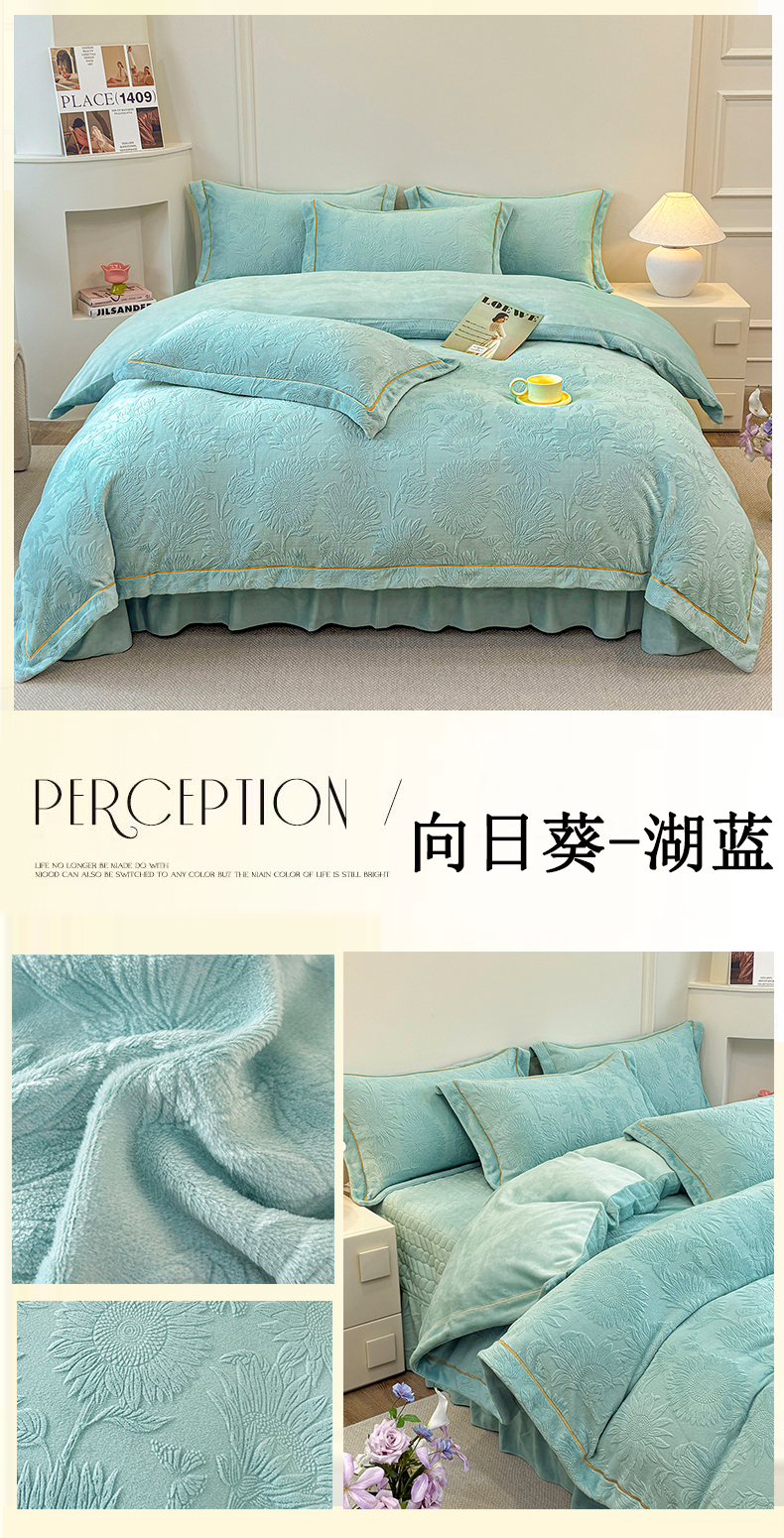 金艾草 2025新款牛奶绒立体雕花夹棉床盖四件套向日葵-湖蓝,向日葵-湖蓝