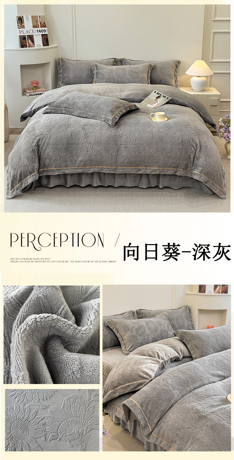 金艾草 2025新款牛奶绒立体雕花夹棉床盖四件套向日葵-深灰,向日葵-深灰