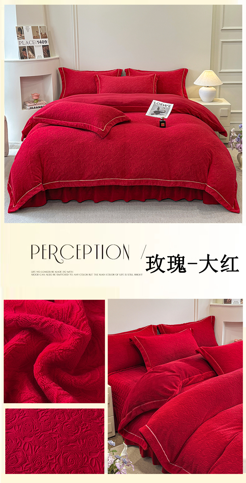 金艾草 2025新款牛奶绒立体雕花夹棉床盖四件套玫瑰-大红,玫瑰-大红