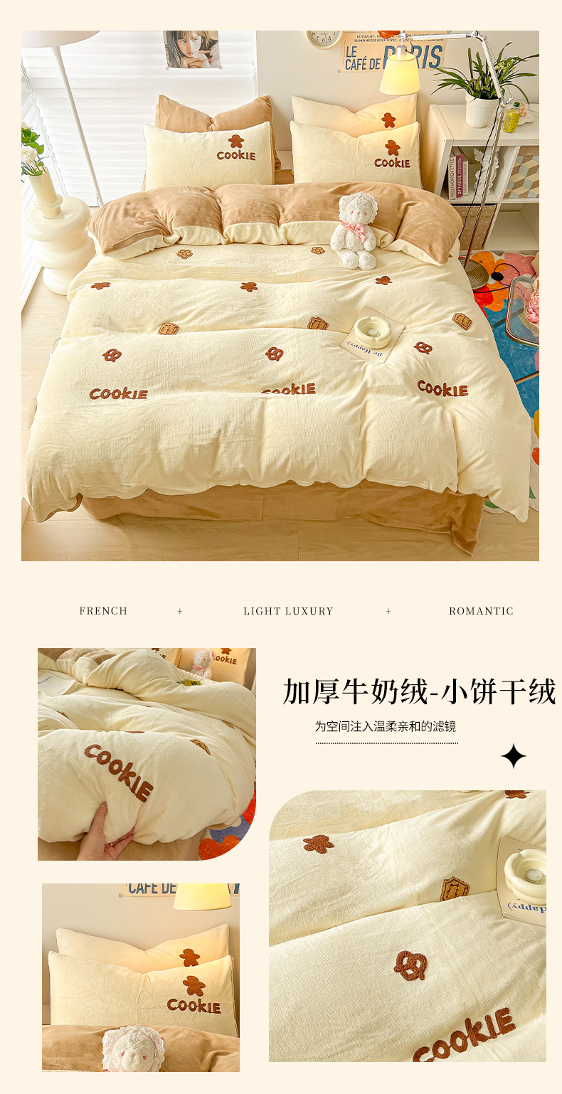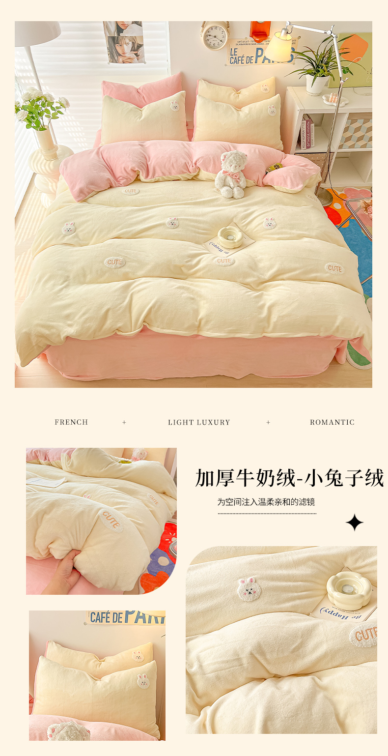 (总)韩都家居 2025新款卡通贴布绣系列加厚牛奶绒四件套,乖乖兔,冬日猫咪,苹果狗狗,绅士小狗,顽皮西高地,幸运小熊