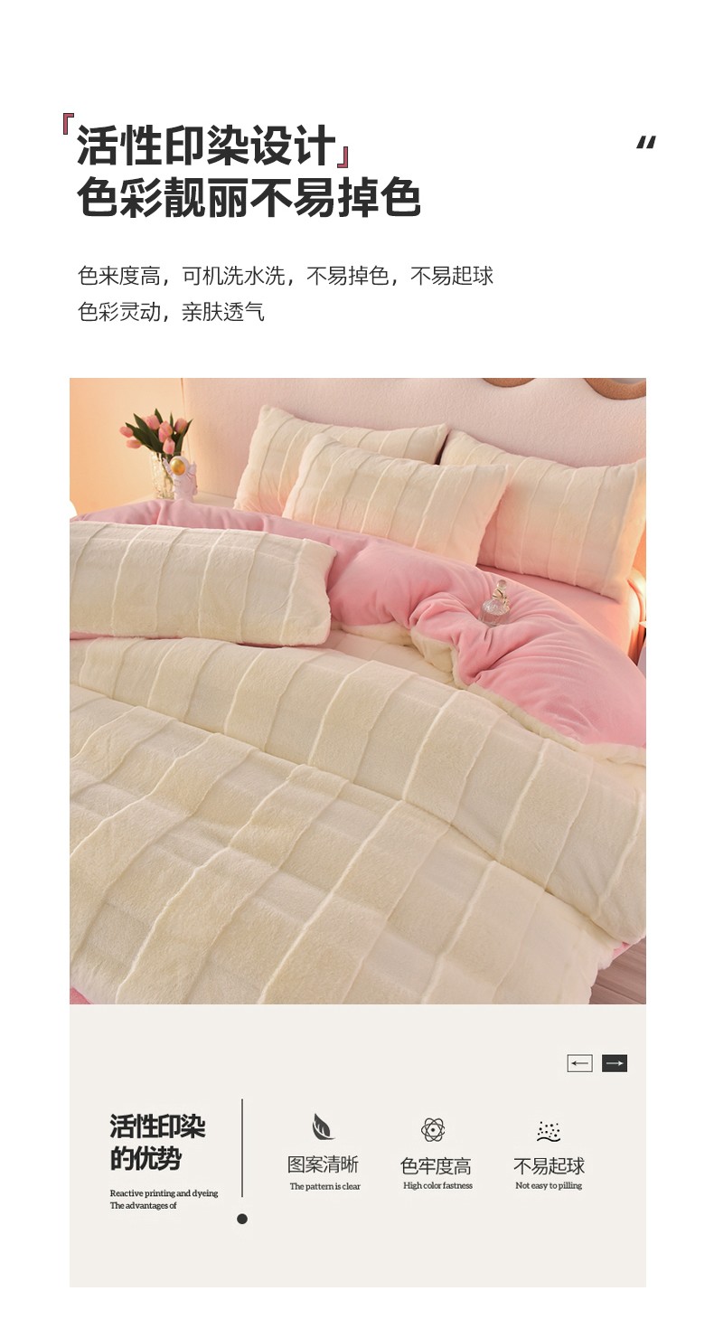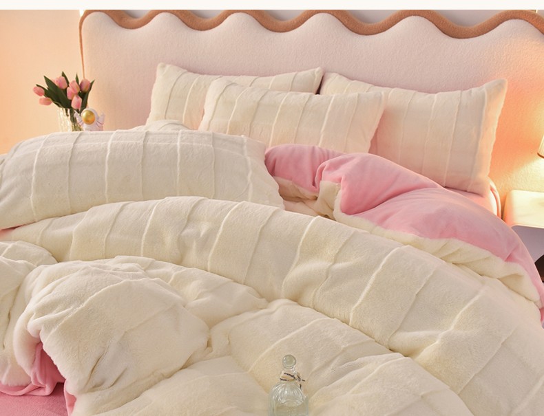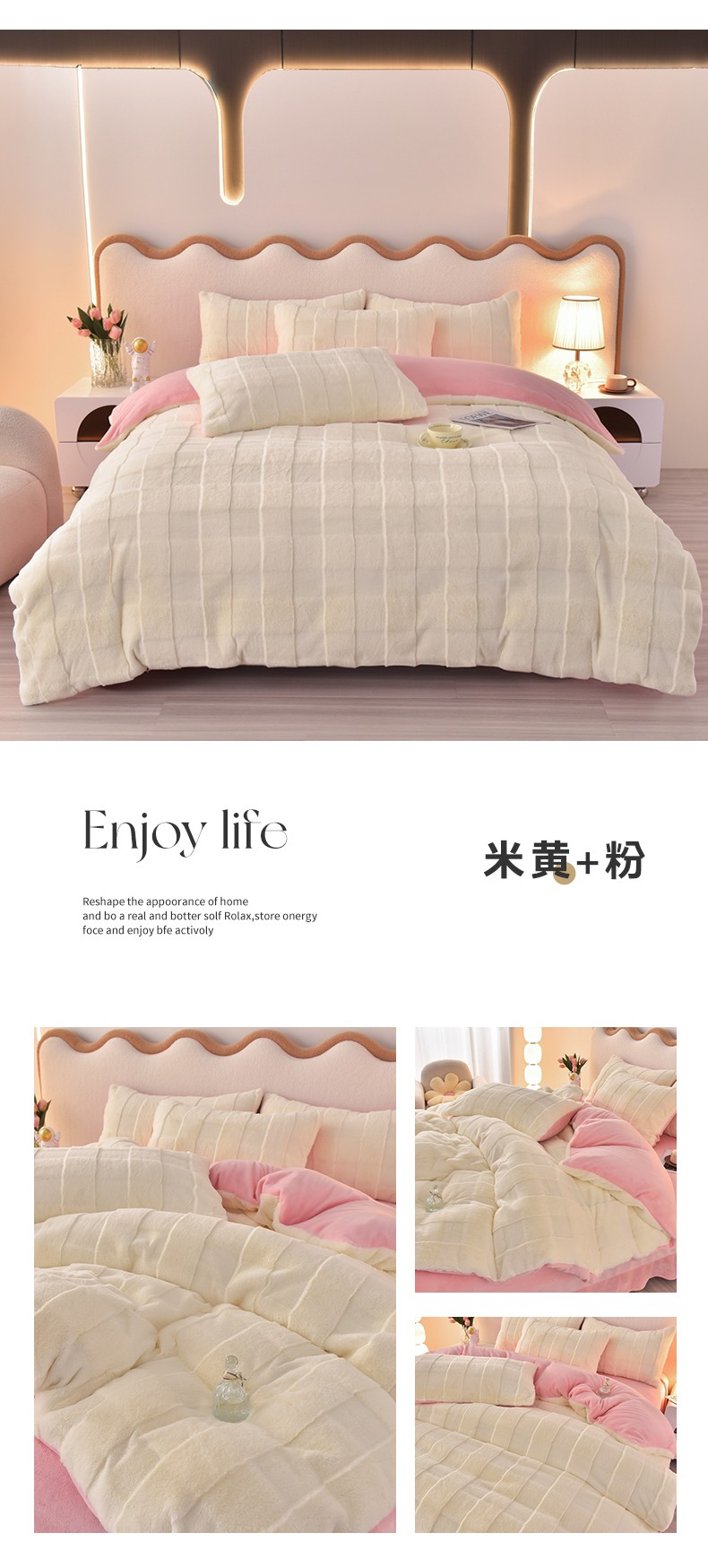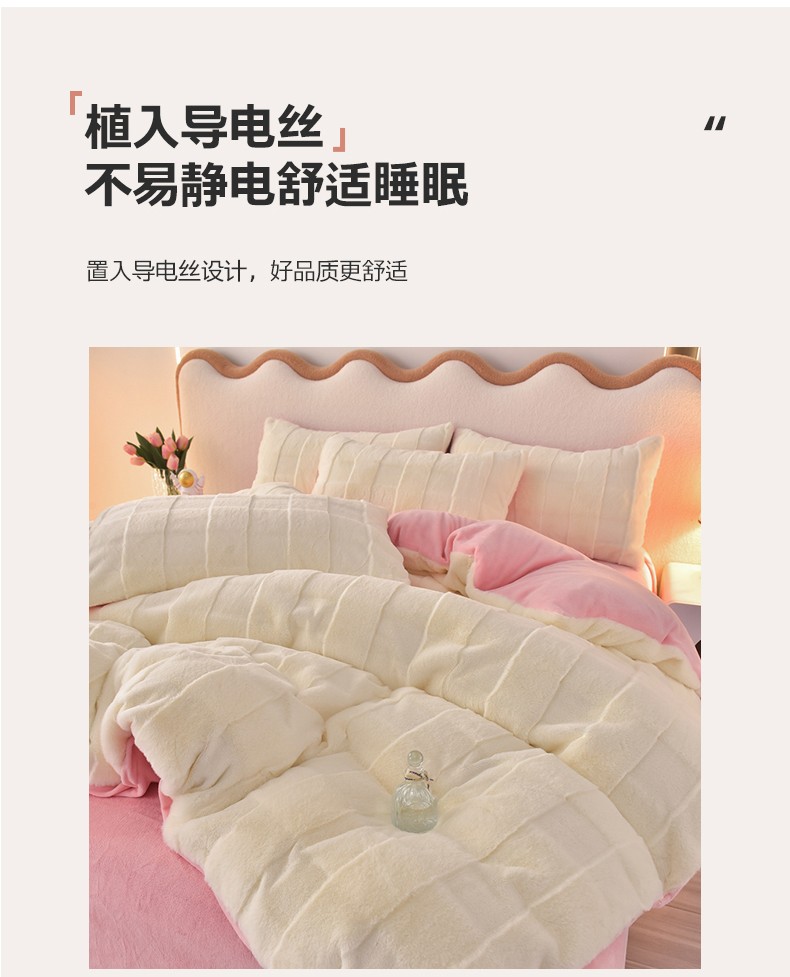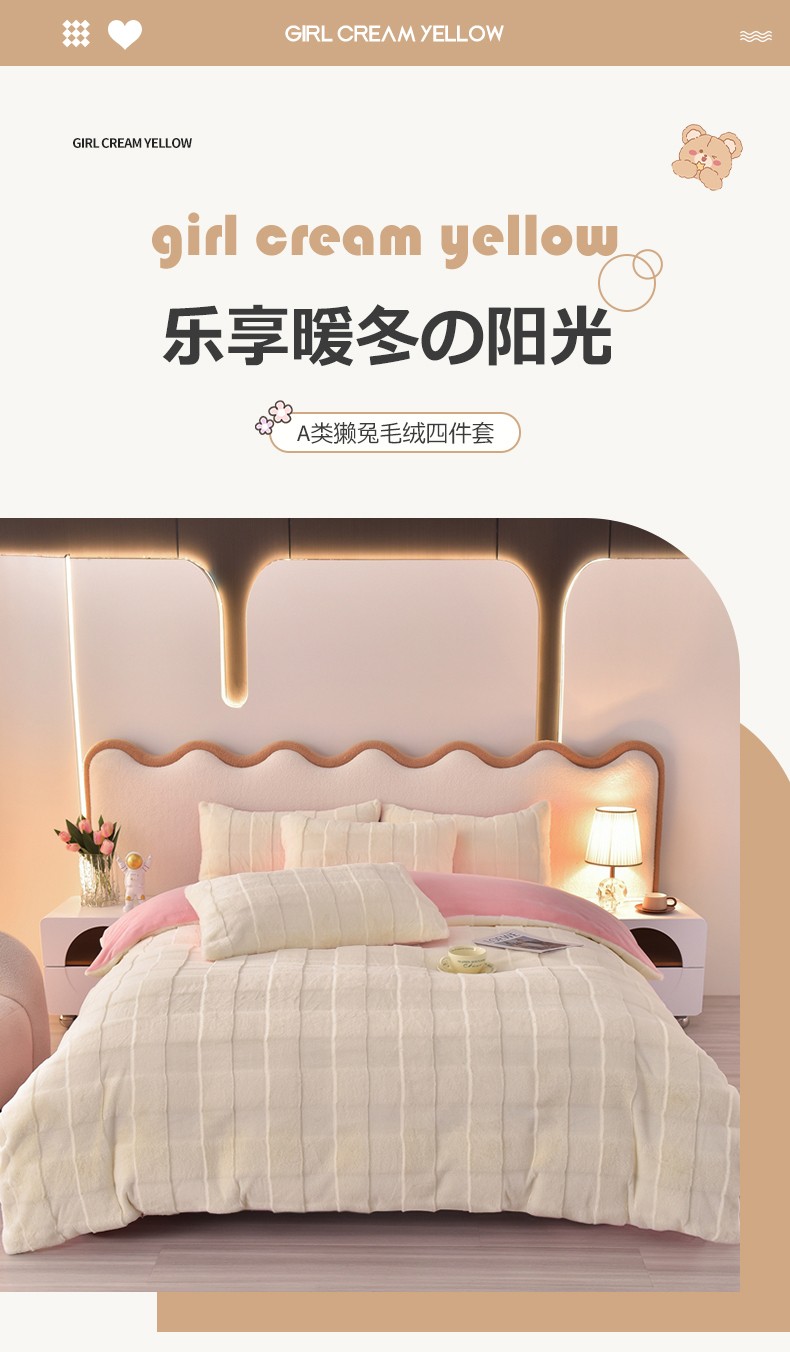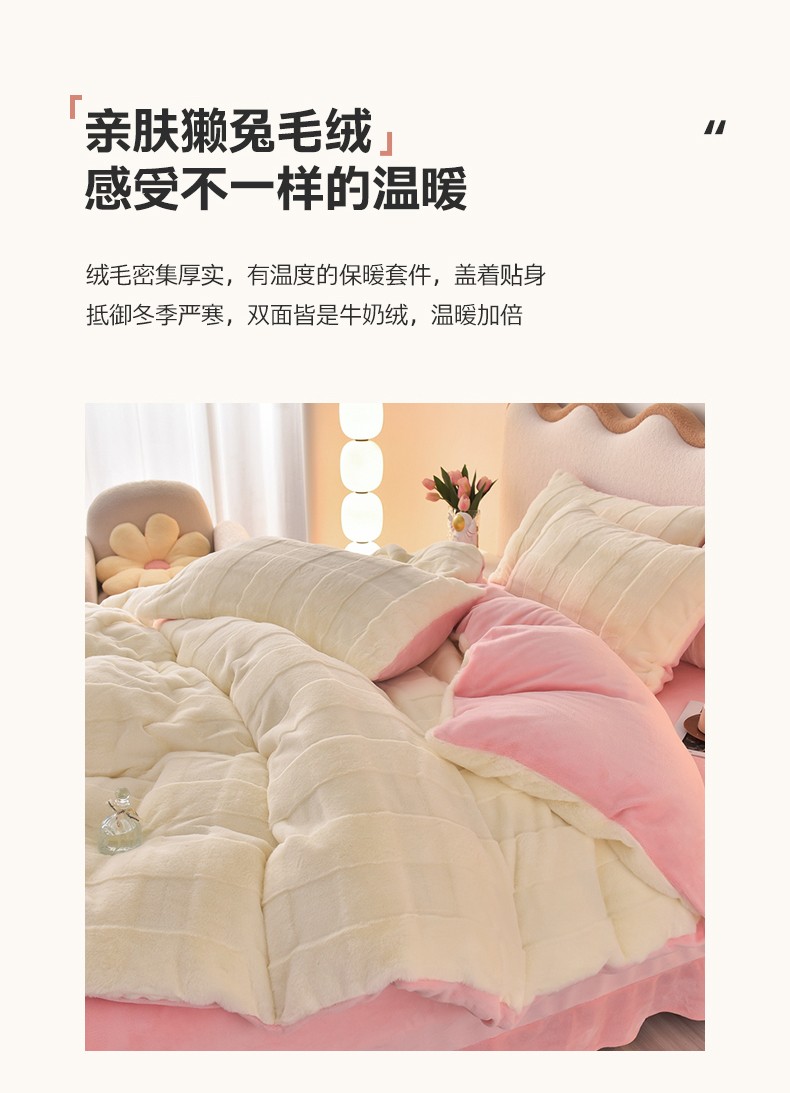 商品名称:畅畅家纺 2023新款兔毛绒兔兔绒懒兔绒立体剪花牛奶绒四件套 米黄+粉
