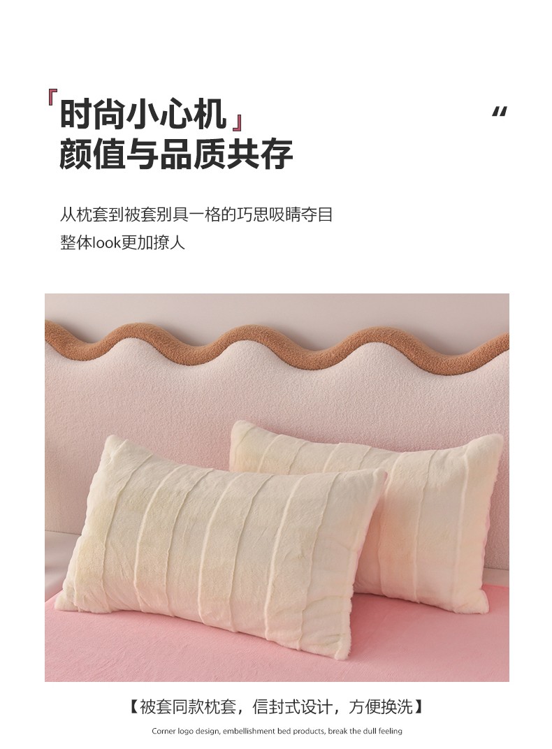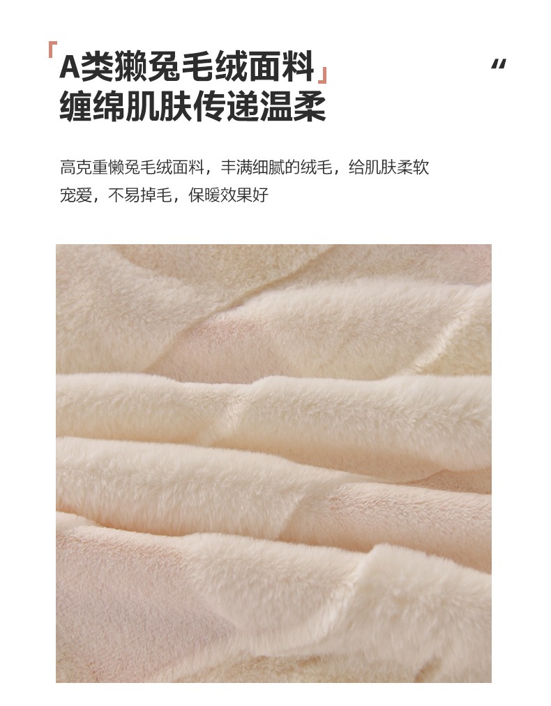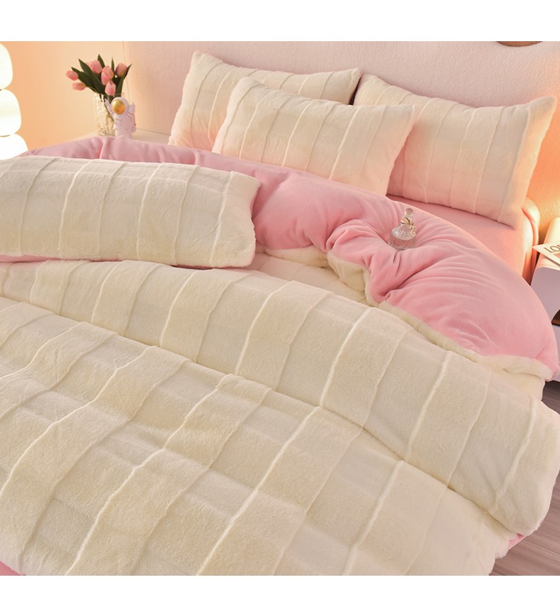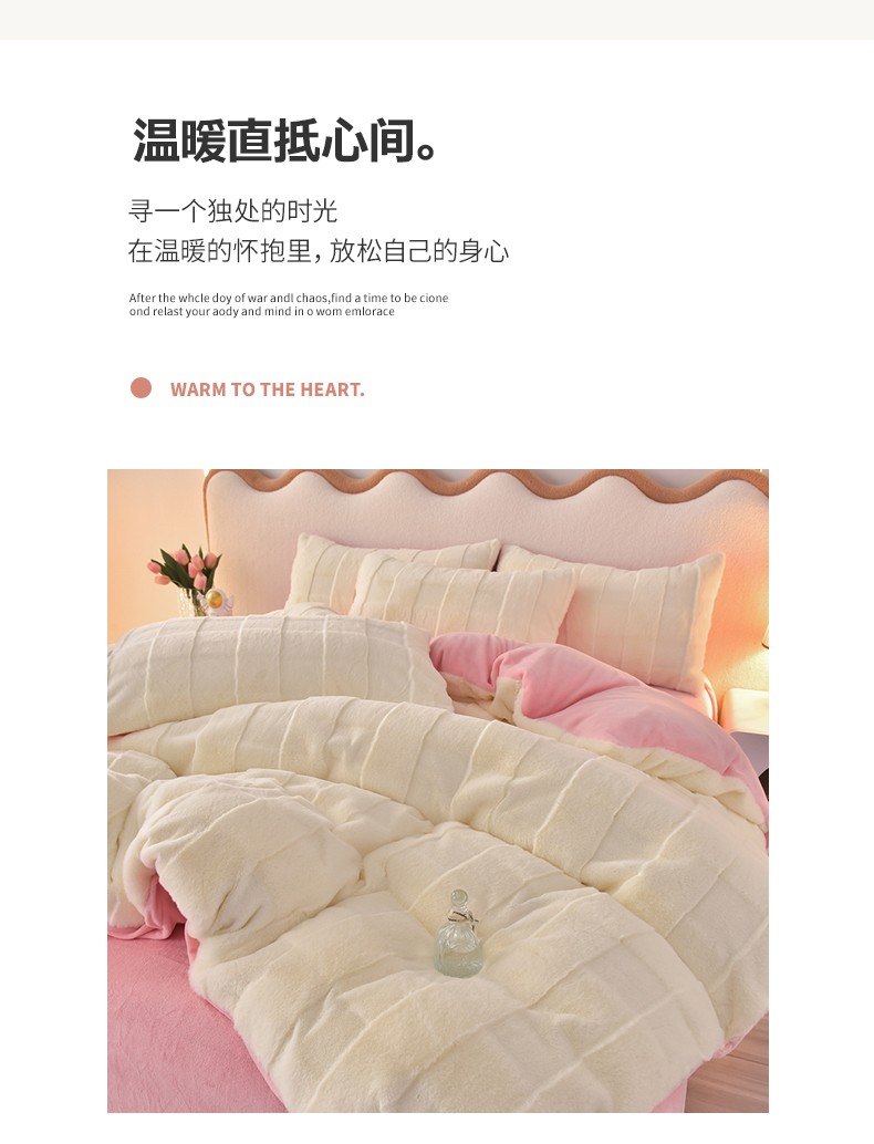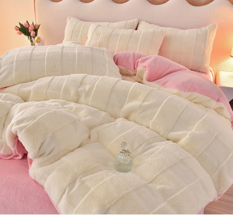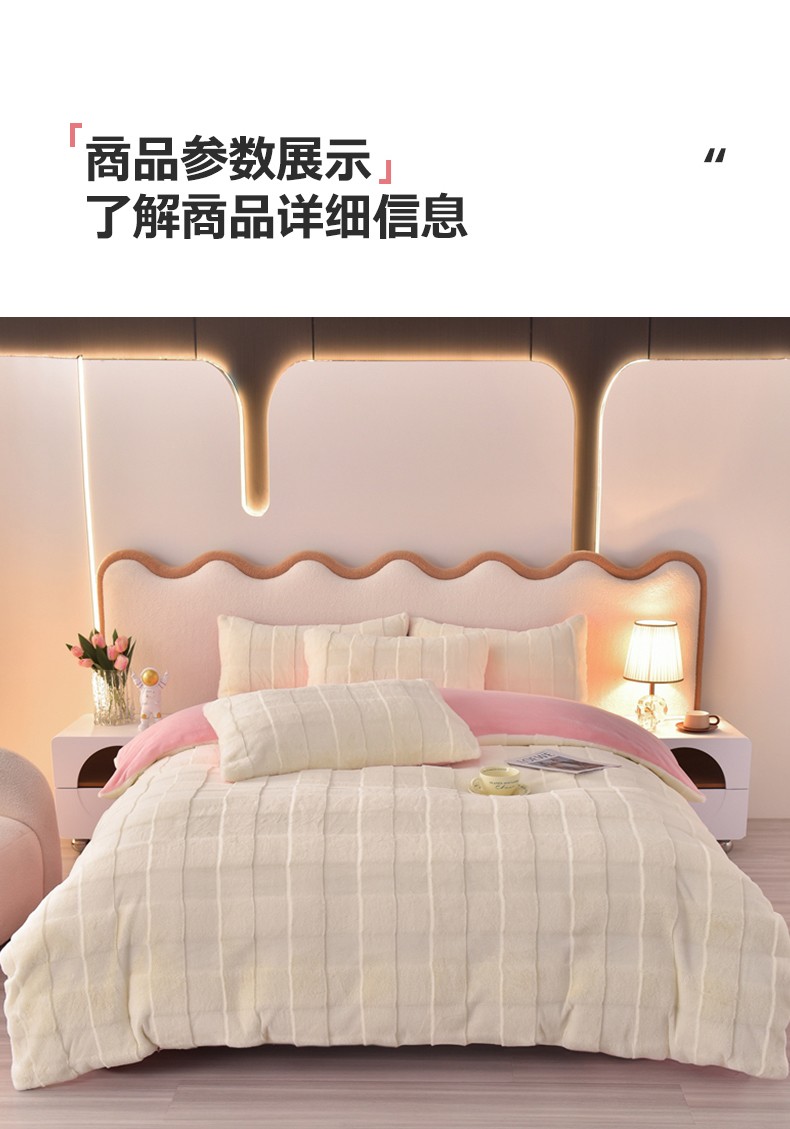 商品名称:畅畅家纺 2023新款兔毛绒兔兔绒懒兔绒立体剪花牛奶绒四件套 米黄+粉
