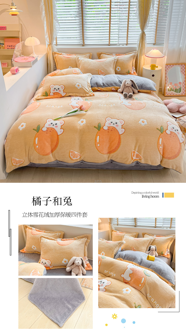 当前位置: 91家纺网 > 商品网购 > 床品套件 > 四件套 > 牛奶绒四件套 > 花伞 2024新款直播立体印花雪花绒卡通加厚保暖四件套 橘子和兔