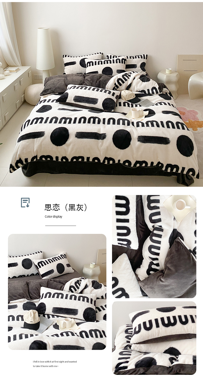 商品名称:潘朵拉 2023新款秋冬ins韩风专版印花保暖兔兔毛绒四件套 思恋(黑灰)