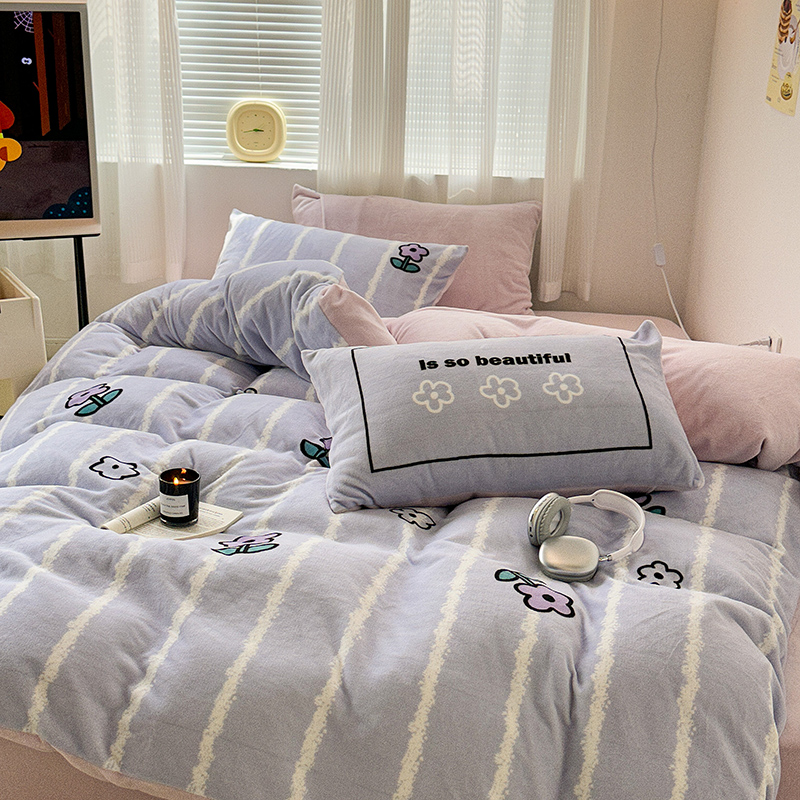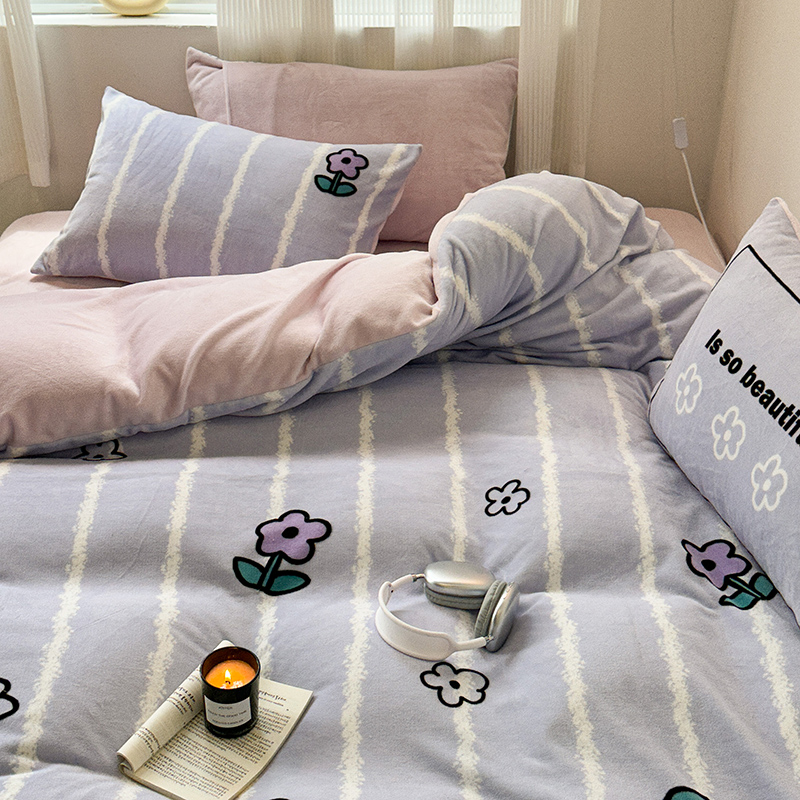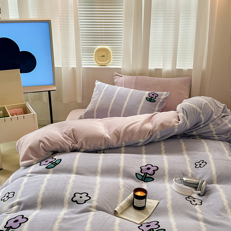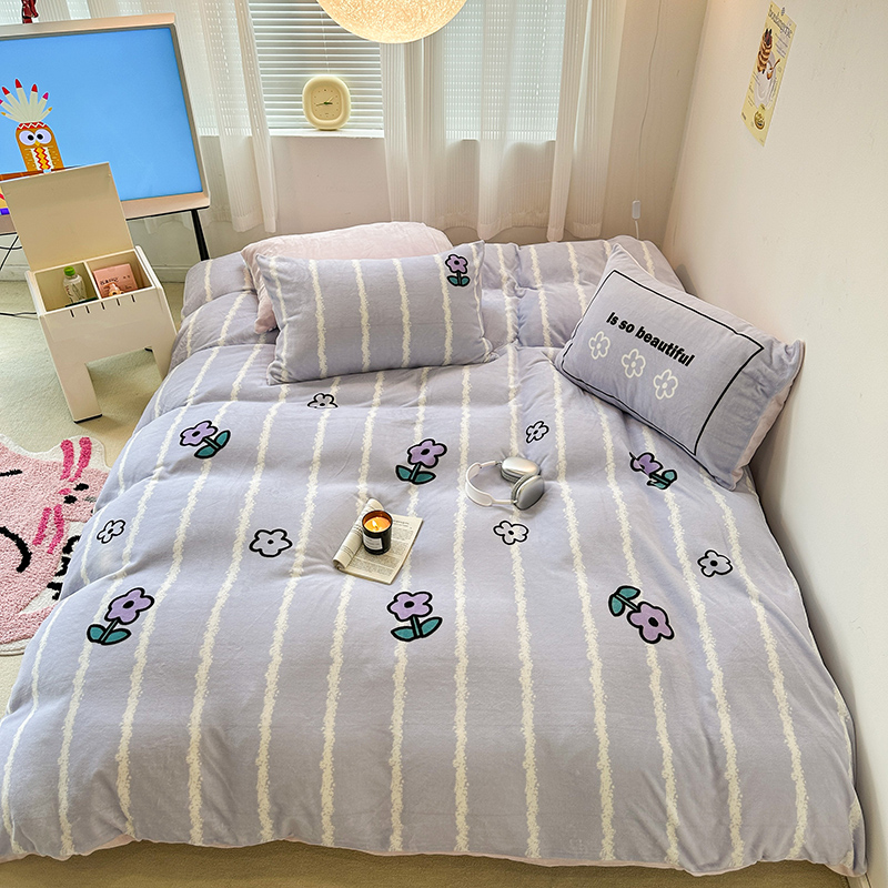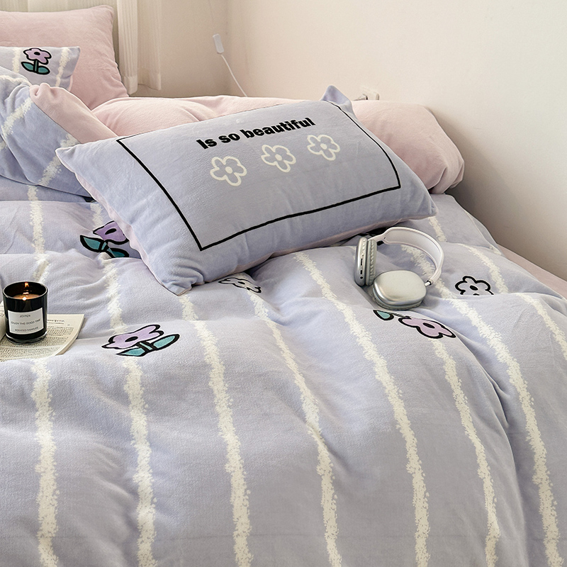 昔可家纺 2023新款大版数码印花保暖牛奶绒四件套 竖条紫花