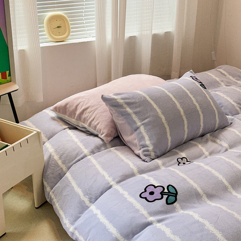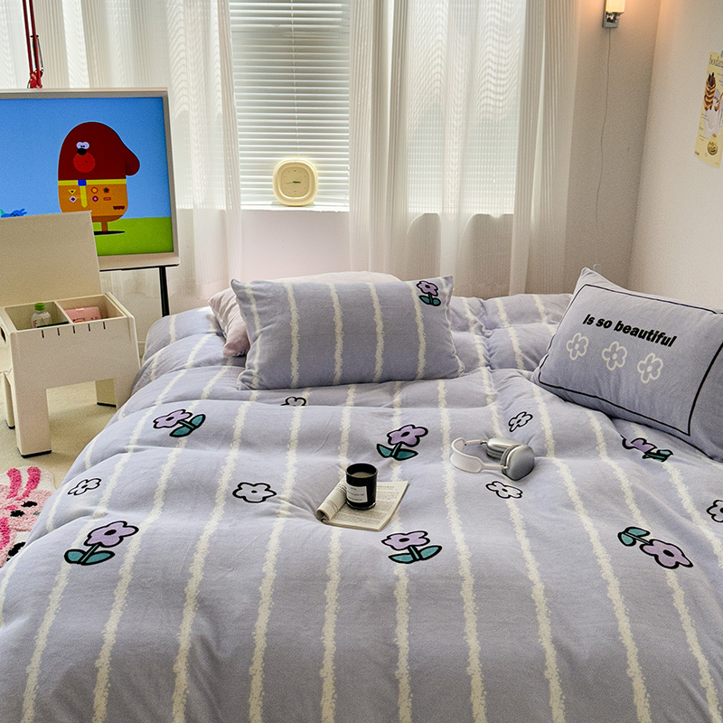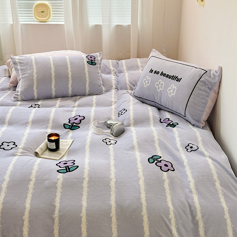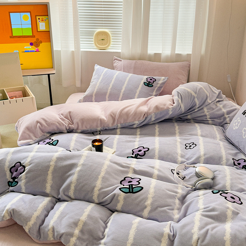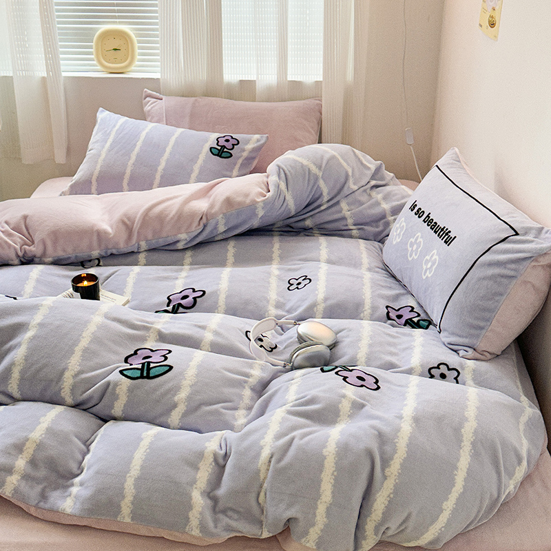 昔可家纺 2023新款大版数码印花保暖牛奶绒四件套 竖条紫花