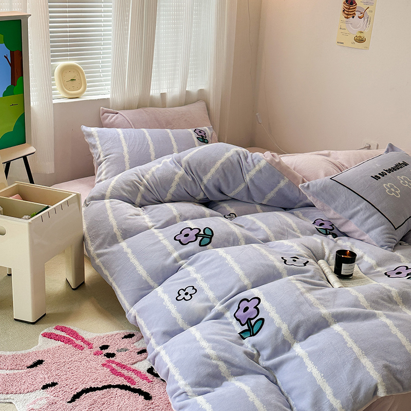 商品名称:昔可家纺 2023新款大版数码印花保暖牛奶绒四件套 竖条紫花