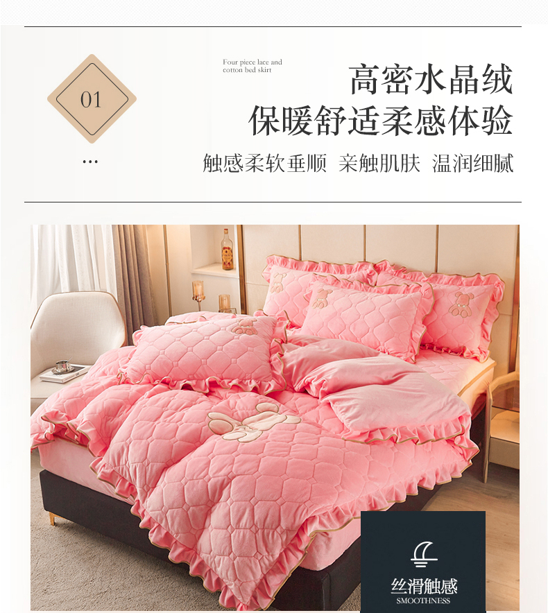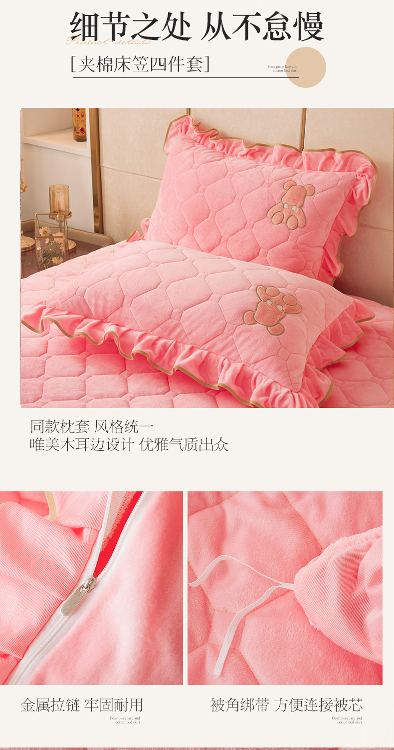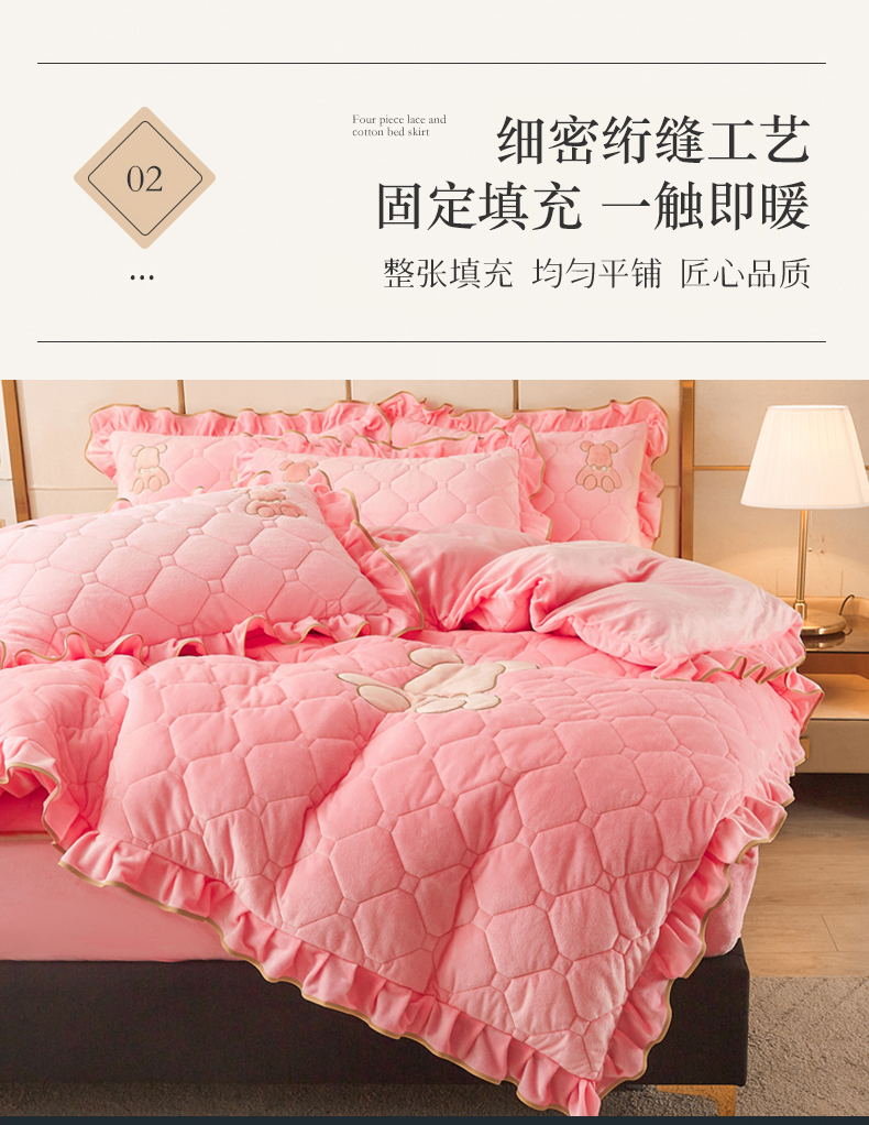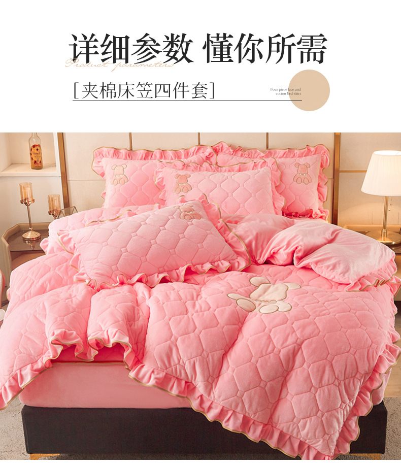 (总)屹成家纺2025新款水晶绒夹棉绗缝床裙四件套(塞纳河畔)四件套起售价不低于230元,大红,豆沙,翡翠绿,粉玉,橄榄绿,蔚蓝,银灰