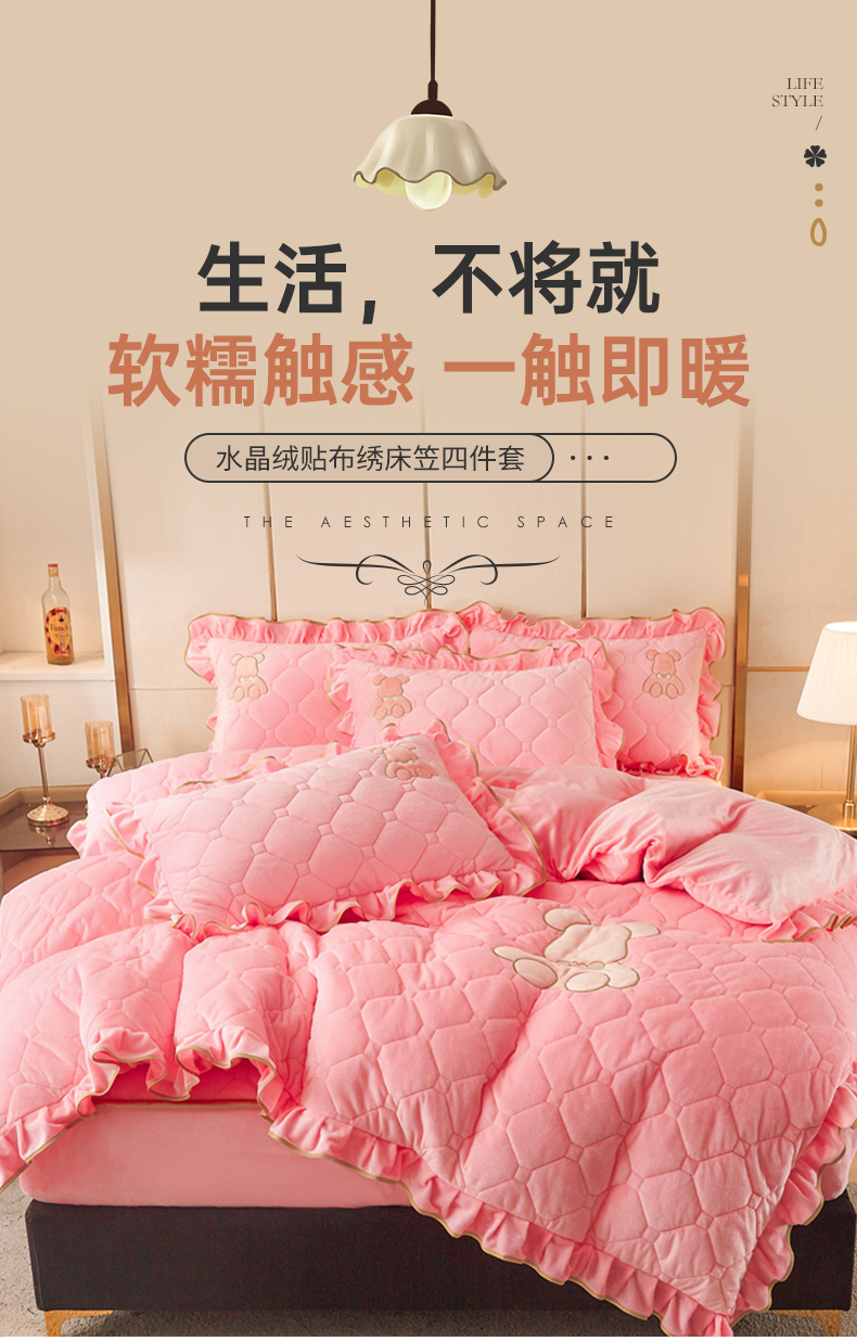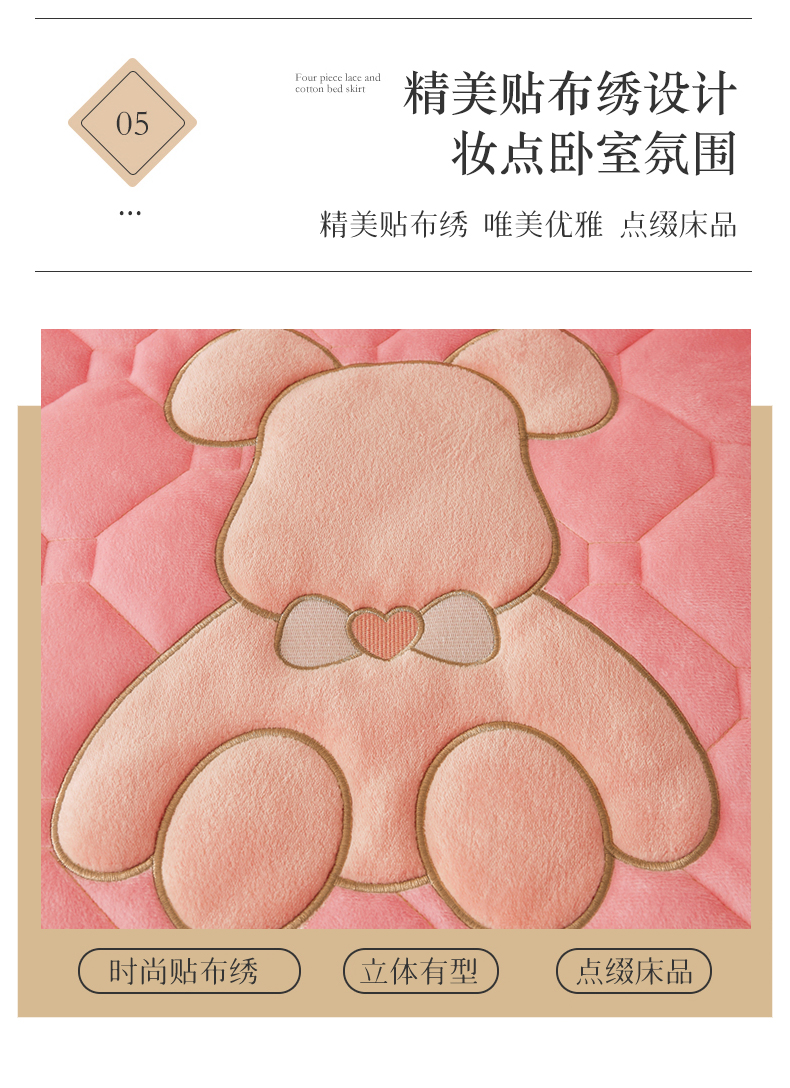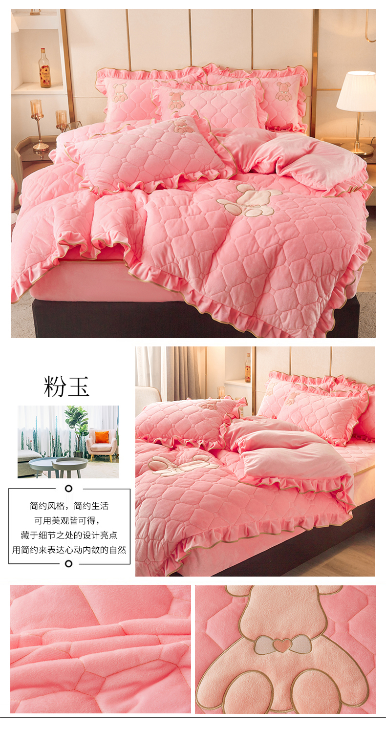 商品名称:屹成 2024新款水晶绒夹棉床笠款四件套贴布绣款-小熊款 粉玉